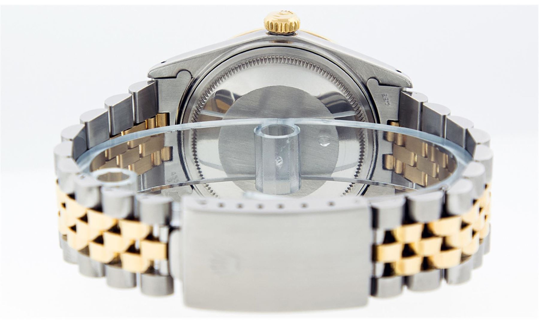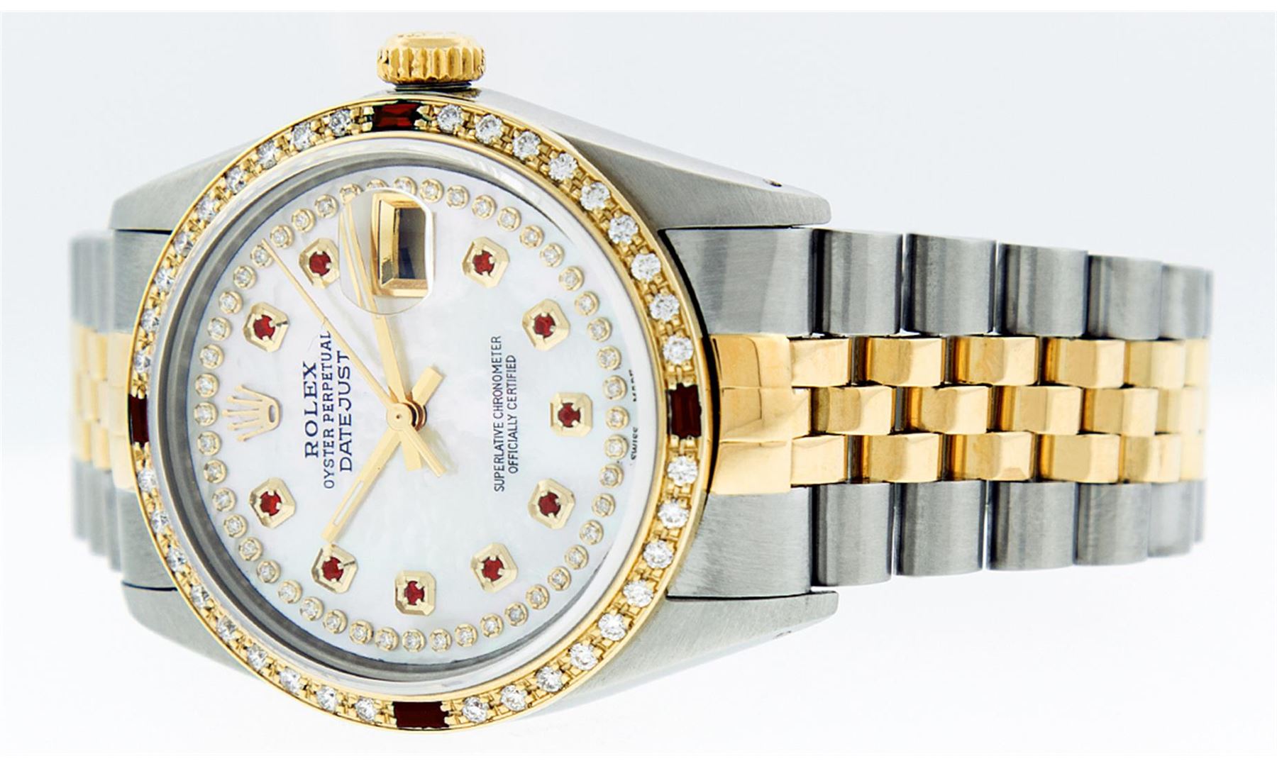 One Mens Two Tone Rolex Datejust Polished, Serviced & Electronically Tested, 14K Yellow Gold & Stainless Steel Case:36mm, 14K Yellow Gold Crown, Custom Bezel: 18K Yellow Gold Ruby Beadset Diamond Bezel, Diamond Count: 36 Diamonds + 4 Rubies Total Weight 1.00 Carat, Clarity: Si-VS, Color: G to H. Custom Crystal: Synthetic Sapphire Cyclops Lens. Movement: Automatic Winding Movement Caliber 3035. Custom Dial: Mother Of Pearl Ruby String Diamond Dial , Diamond + Gem Count: 10 Ruby + 48 Diamonds in Dial G To H In Color, SI-VS Clarity. Date Window: 3 O'Clock Position Date Display, Quickset, Model: 16013 Condition: G-6 Extra Fine. Bracelet: Two Tone 14K Yellow Gold & Stainless Steel Jubilee. Bright Polish. 7.0 Inch Length, Adjustable. Standard Clasp, With Rolex Logo. Comes with 6 month warranty.