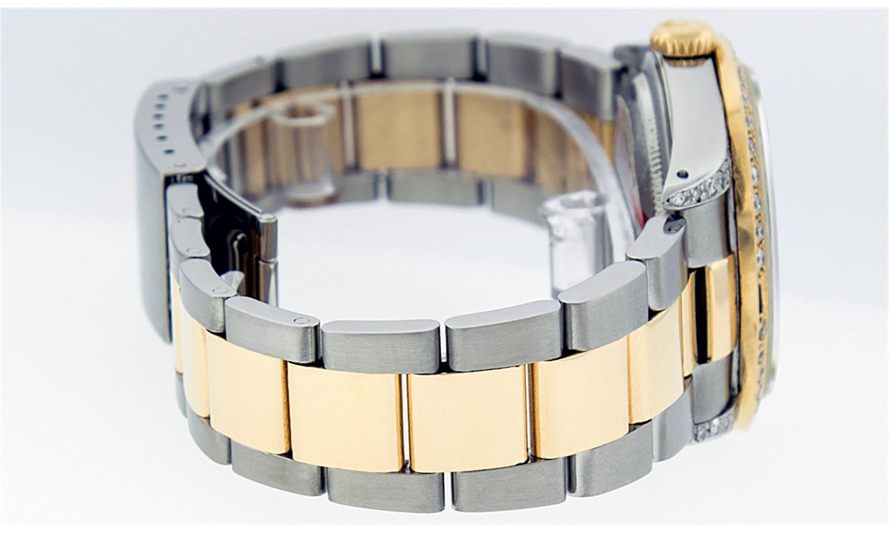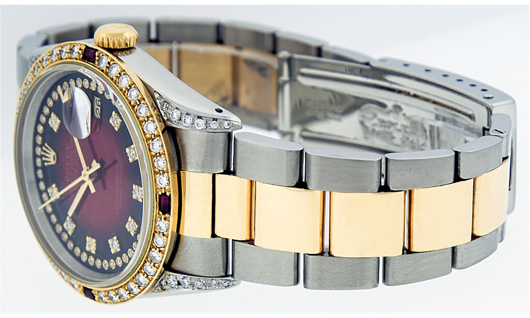 One Gents 18K Yellow Gold Two Tone Rolex Datejust Polished, Serviced & Electronically Tested, 18K Yellow Gold & Stainless Steel Case:36mm, Diamond Lugs On Case, Diamond Count: 16 Diamonds On Lugs, Color: G To H, Clarity: SI-VS. 18K Yellow Gold Crown, Custom Bezel: 18K Yellow Gold Ruby Beadset Diamond Bezel, Diamond Count: 36 Diamonds + 4 Rubies. Total Weight 1.00 Carat, Clarity: Si-VS, Color: G to H. Custom Crystal: Synthetic Sapphire Cyclops Lens. Movement: Automatic Winding Movement Caliber 3135. Custom Dial: Red Vignette String Diamond Dial VVS, Diamond Count: 58 Diamonds In Dial, Color: G To H, Clarity: VVS, Date Window: 3 O'Clock Position Date Display, Quickset, Model: 16233 Condition: G-6 Extra Fine The Watch Is In Very Good Condition Free Of All Scratches And Dents. Bracelet: Two Tone 18K Yellow Gold & Stainless Steel Oyster Band. Bright Polish. 7.0 Inch Length, Adjustable. Standard Clasp, With Rolex Logo. Comes with 6 month warranty.