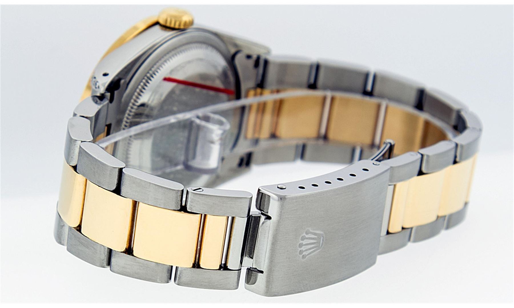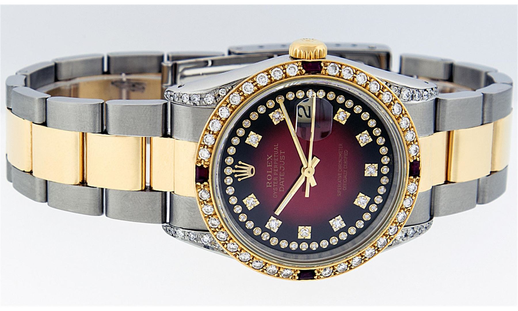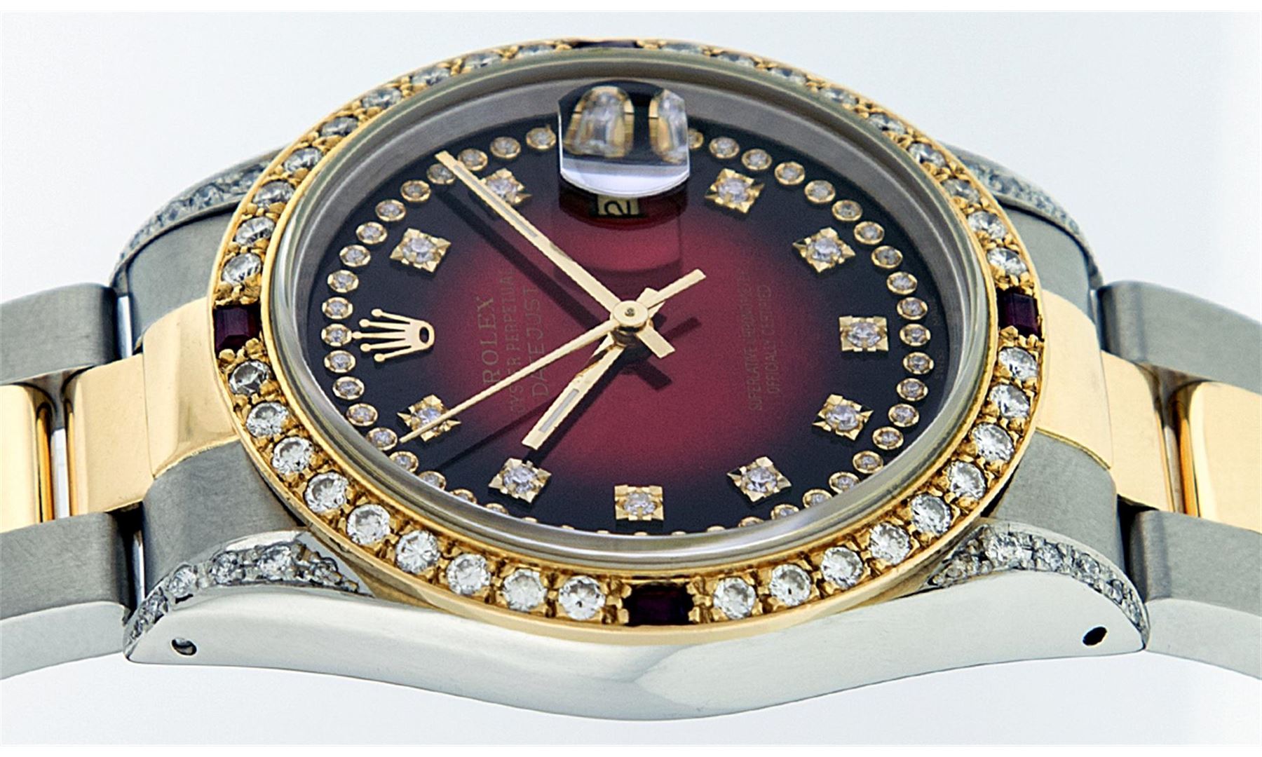 One Gents 18K Yellow Gold Two Tone Rolex Datejust Polished, Serviced & Electronically Tested, 18K Yellow Gold & Stainless Steel Case:36mm, Diamond Lugs On Case, Diamond Count: 16 Diamonds On Lugs, Color: G To H, Clarity: SI-VS. 18K Yellow Gold Crown, Custom Bezel: 18K Yellow Gold Ruby Beadset Diamond Bezel, Diamond Count: 36 Diamonds + 4 Rubies. Total Weight 1.00 Carat, Clarity: Si-VS, Color: G to H. Custom Crystal: Synthetic Sapphire Cyclops Lens. Movement: Automatic Winding Movement Caliber 3135. Custom Dial: Red Vignette String Diamond Dial VVS, Diamond Count: 58 Diamonds In Dial, Color: G To H, Clarity: VVS, Date Window: 3 O'Clock Position Date Display, Quickset, Model: 16233 Condition: G-6 Extra Fine The Watch Is In Very Good Condition Free Of All Scratches And Dents. Bracelet: Two Tone 18K Yellow Gold & Stainless Steel Oyster Band. Bright Polish. 7.0 Inch Length, Adjustable. Standard Clasp, With Rolex Logo. Comes with 6 month warranty.