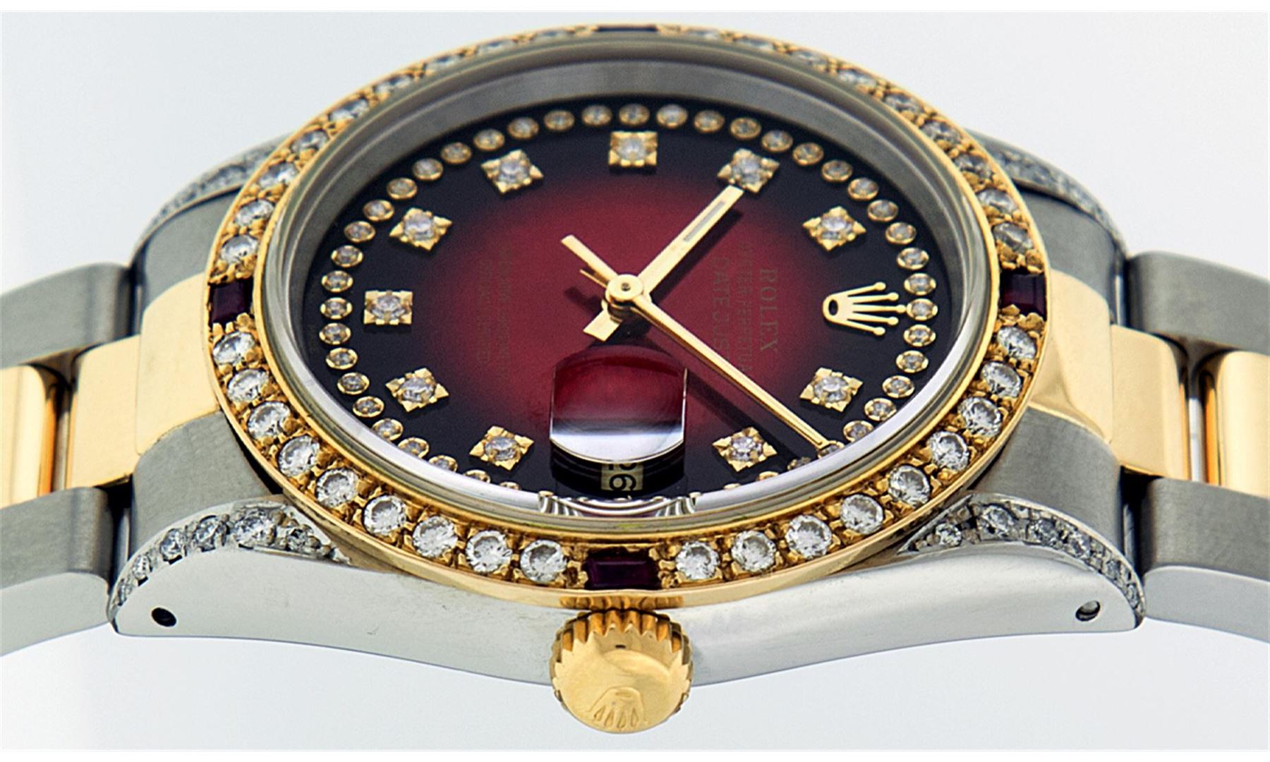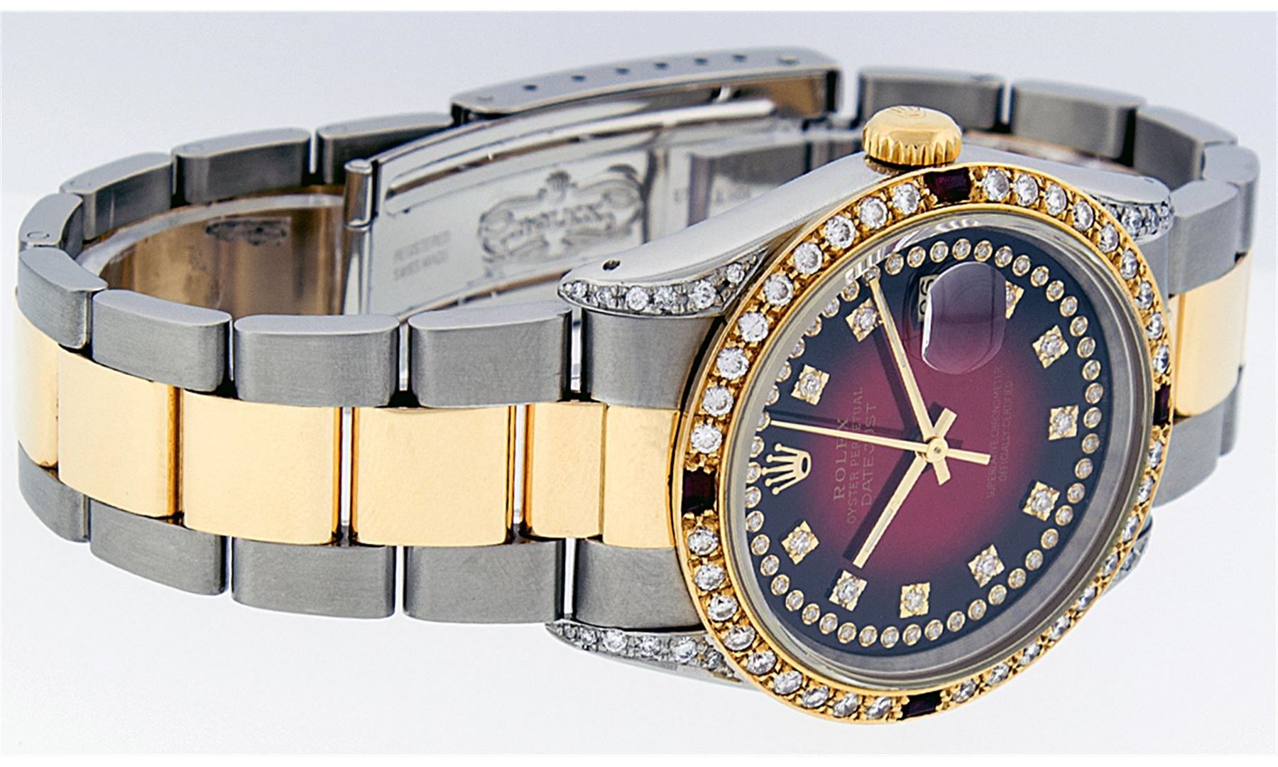 One Gents 18K Yellow Gold Two Tone Rolex Datejust Polished, Serviced & Electronically Tested, 18K Yellow Gold & Stainless Steel Case:36mm, Diamond Lugs On Case, Diamond Count: 16 Diamonds On Lugs, Color: G To H, Clarity: SI-VS. 18K Yellow Gold Crown, Custom Bezel: 18K Yellow Gold Ruby Beadset Diamond Bezel, Diamond Count: 36 Diamonds + 4 Rubies. Total Weight 1.00 Carat, Clarity: Si-VS, Color: G to H. Custom Crystal: Synthetic Sapphire Cyclops Lens. Movement: Automatic Winding Movement Caliber 3135. Custom Dial: Red Vignette String Diamond Dial VVS, Diamond Count: 58 Diamonds In Dial, Color: G To H, Clarity: VVS, Date Window: 3 O'Clock Position Date Display, Quickset, Model: 16233 Condition: G-6 Extra Fine The Watch Is In Very Good Condition Free Of All Scratches And Dents. Bracelet: Two Tone 18K Yellow Gold & Stainless Steel Oyster Band. Bright Polish. 7.0 Inch Length, Adjustable. Standard Clasp, With Rolex Logo. Comes with 6 month warranty.