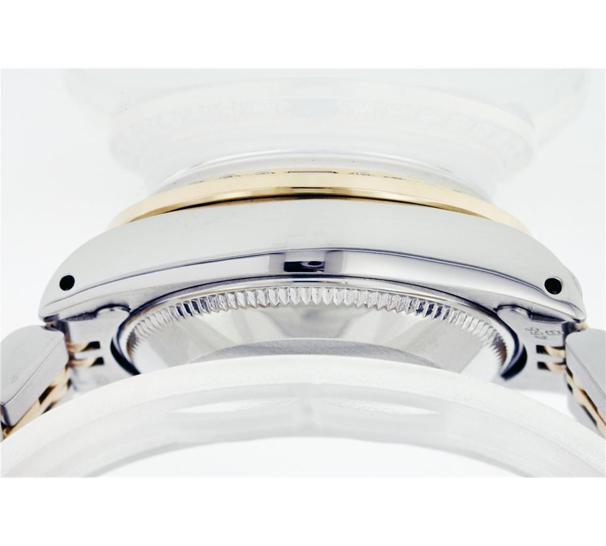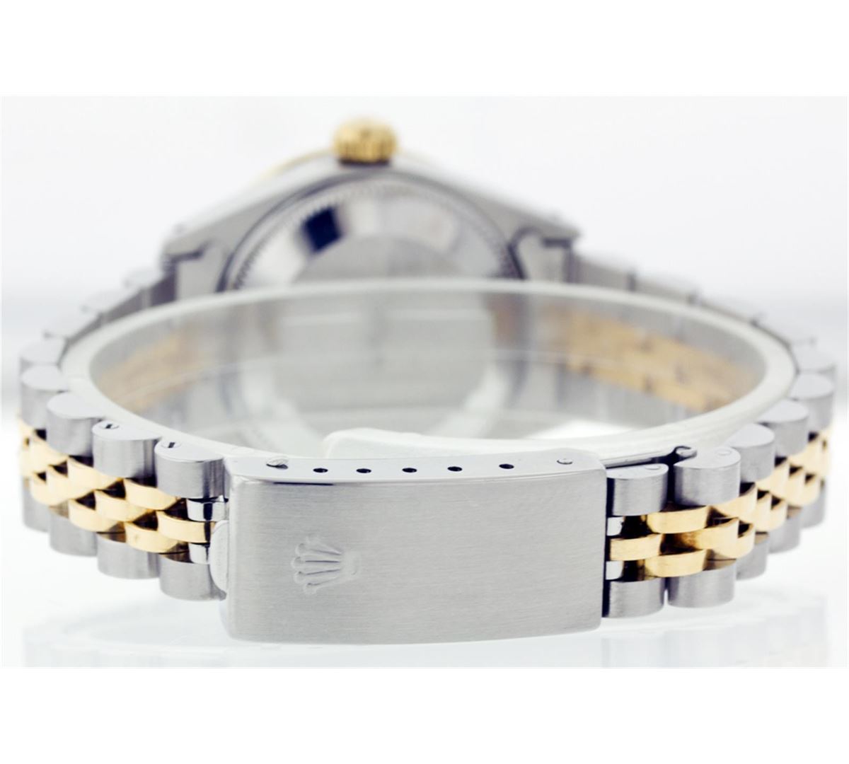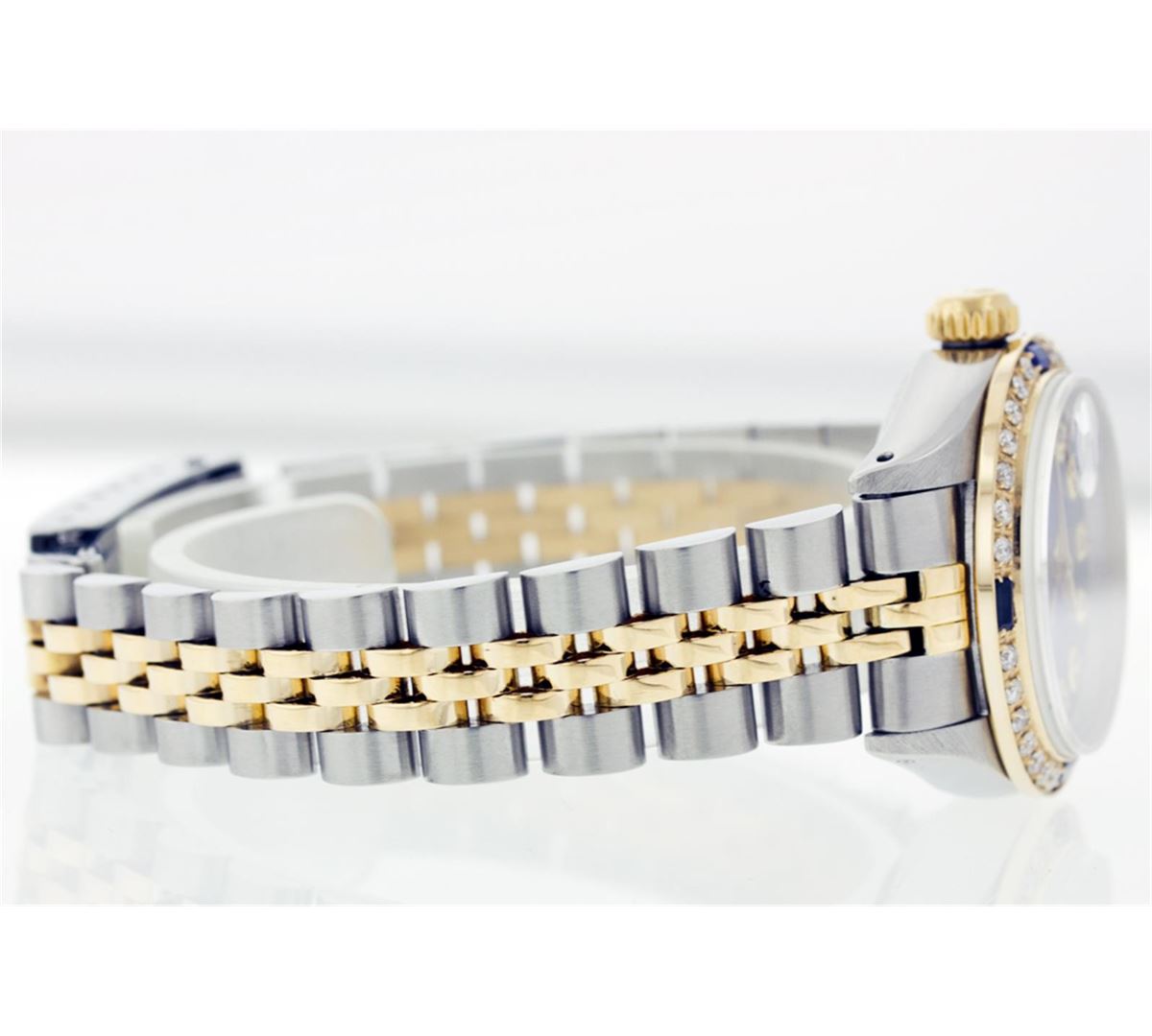 One Ladies Two Tone Rolex Datejust Polished, Serviced & Electronically Tested, 14K Yellow Gold & Stainless Steel Case:26mm, 14K Yellow Gold Crown, Custom Bezel: 18K Yellow Gold Ruby Beadset Diamond Bezel, Diamond Count: 28 Diamonds + 4 Sapphires Total Weight .70 Carat, Clarity: Si-VS, Color: G to H. Custom Crystal: Synthetic Sapphire Cyclops Lens. Movement: Automatic Winding Movement Caliber 2030. Custom Dial: Blue Vignette With Diamond Hour Markers. 10 Diamonds In Dial, Clarity: Si-VS, Color: G to H. Date Window: 3 O'Clock Position Date Display, Non Quickset, Model: 6917 Condition: G-6 Extra Fine. Bracelet: Two Tone 14K Yellow Gold & Stainless Steel Jubilee. Bright Polish. 5.5 Inch Length, Adjustable. Standard Clasp, With Rolex Logo.
