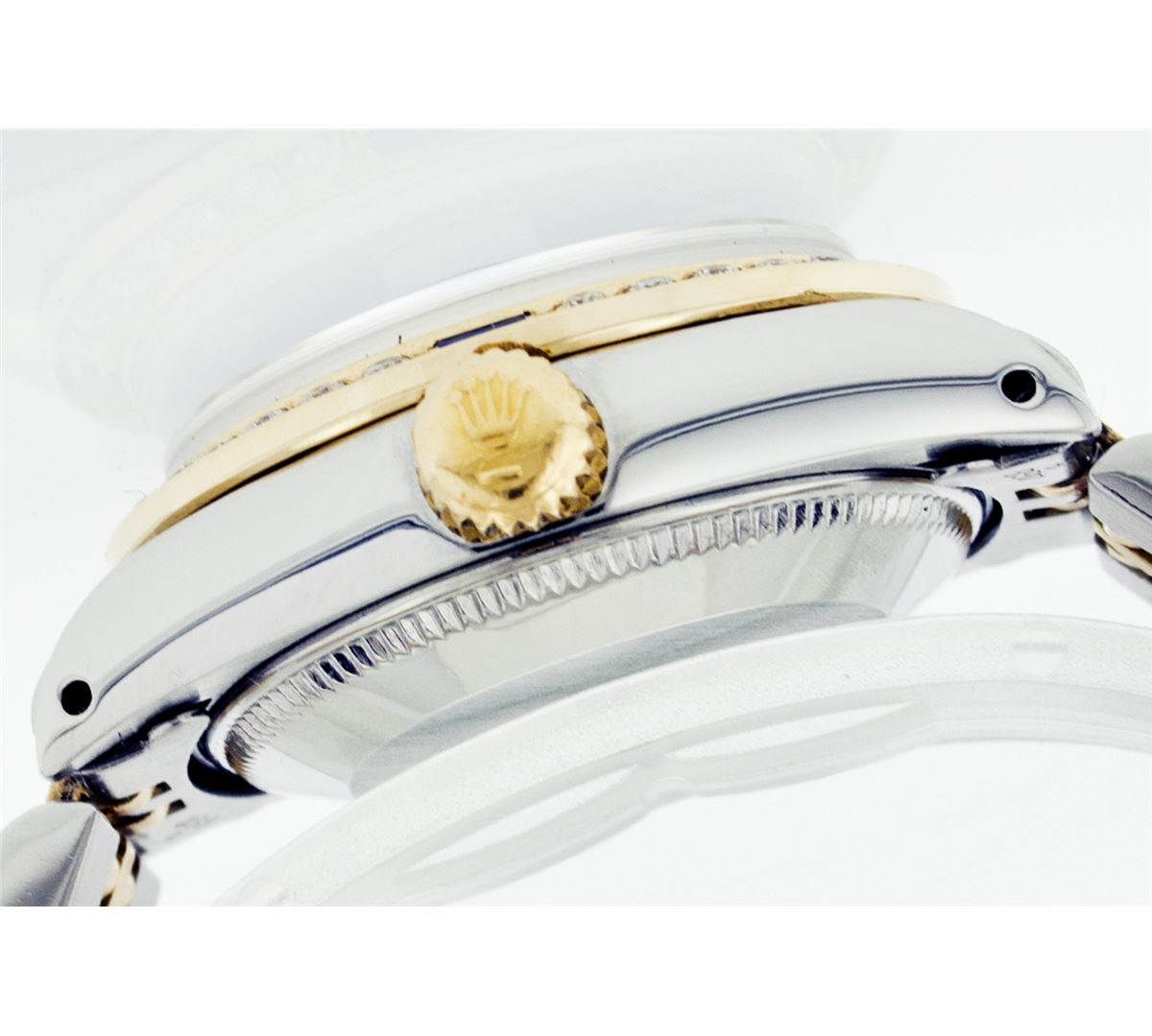 One Ladies Two Tone Rolex Datejust Polished, Serviced & Electronically Tested, 14K Yellow Gold & Stainless Steel Case:26mm, 14K Yellow Gold Crown, Custom Bezel: 18K Yellow Gold Sapphire Beadset Diamond Bezel, Diamond + Gem Count: 28 Diamonds + 4 Sapphires Total Weight .70 Carat, Clarity: Si-VS, Color: G to H. Custom Crystal: Synthetic Sapphire Cyclops Lens. Movement: Automatic Winding Movement Caliber 2030. Custom Dial: Blue Vignette Dial Set With Diamond Hour Markers, 10 Diamond in Dial G To H In Color, Si-VS Clarity. Date Window: 3 O'Clock Position Date Display, Non Quickset, Model: 6917 Condition: G-6 Extra Fine. Bracelet: Two Tone 14K Yellow Gold & Stainless Steel Jubilee. Bright Polish. 5.5 Inch Length, Adjustable. Standard Clasp, With Rolex Logo.