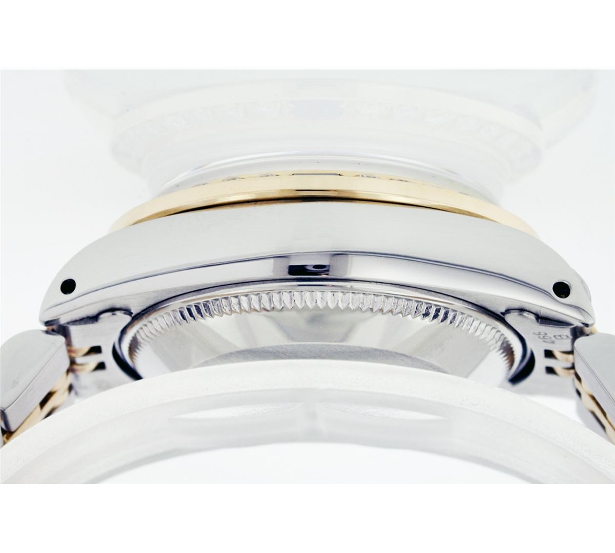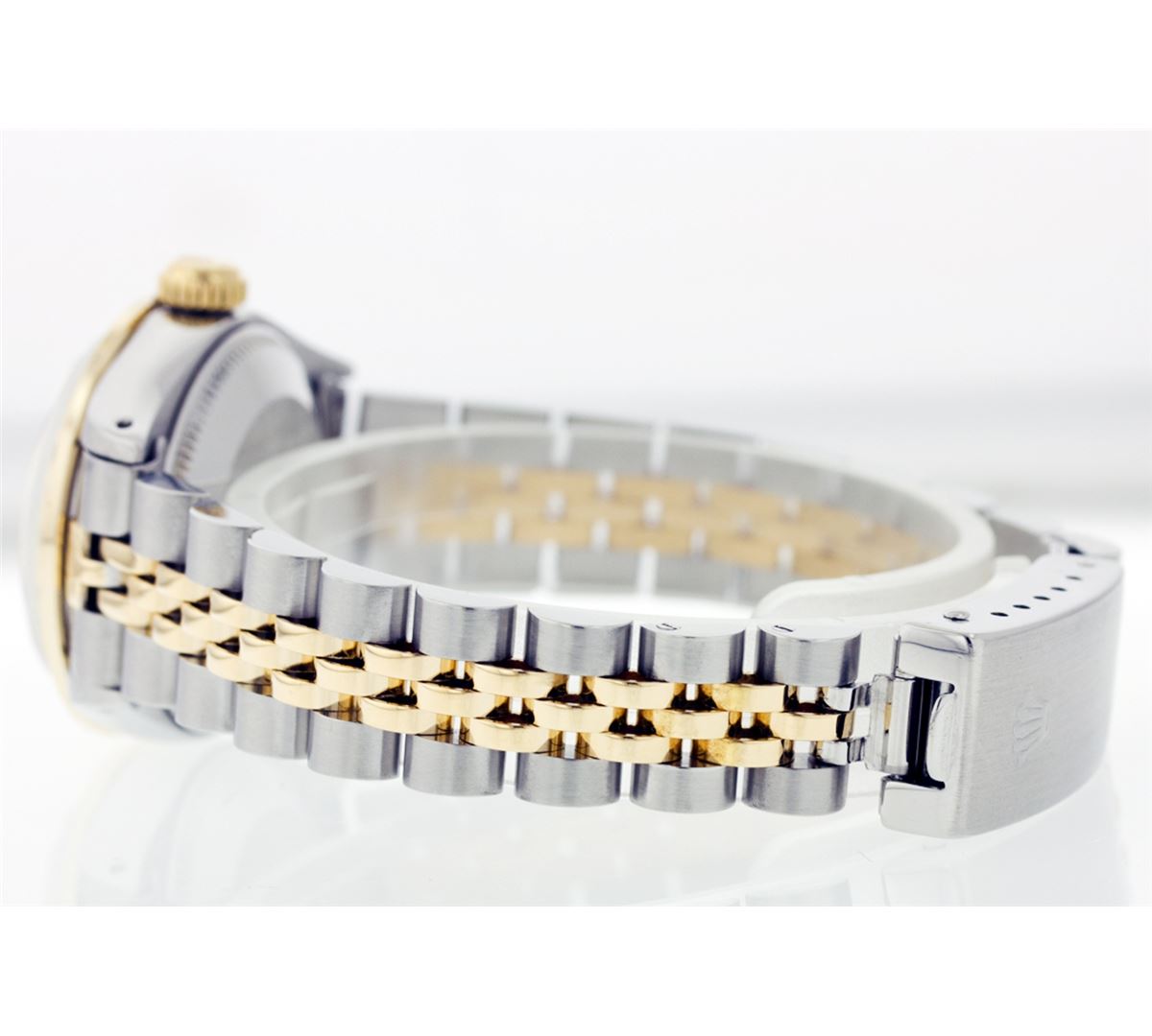 One Ladies Two Tone Rolex Datejust Polished, Serviced & Electronically Tested, 14K Yellow Gold & Stainless Steel Case:26mm, 14K Yellow Gold Crown, Custom Bezel: 18K Yellow Gold Sapphire Beadset Diamond Bezel, Diamond + Gem Count: 28 Diamonds + 4 Sapphires Total Weight .70 Carat, Clarity: Si-VS, Color: G to H. Custom Crystal: Synthetic Sapphire Cyclops Lens. Movement: Automatic Winding Movement Caliber 2030. Custom Dial: Blue Vignette Dial Set With Diamond Hour Markers, 10 Diamond in Dial G To H In Color, Si-VS Clarity. Date Window: 3 O'Clock Position Date Display, Non Quickset, Model: 6917 Condition: G-6 Extra Fine. Bracelet: Two Tone 14K Yellow Gold & Stainless Steel Jubilee. Bright Polish. 5.5 Inch Length, Adjustable. Standard Clasp, With Rolex Logo.