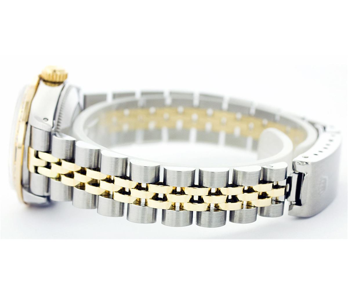 One Ladies Two Tone Rolex Datejust Polished, Serviced & Electronically Tested, 14K Yellow Gold & Stainless Steel Case:26mm, 14K Yellow Gold Crown, Custom Bezel: 18K Yellow Gold Sapphire Beadset Diamond Bezel, Diamond Count: 28 Diamonds + 4 Sapphires Total Weight .70 Carat, Clarity: Si-VS, Color: G to H. Custom Crystal: Synthetic Sapphire Cyclops Lens. Movement: Automatic Winding Movement Caliber 2030. Custom Dial: Ice Blue With Diamond Hour Markers. 10 Diamonds In Dial, Clarity: Si-VS, Color: G to H. Date Window: 3 O'Clock Position Date Display, Non Quickset, Model: 6917 Condition: G-6 Extra Fine. Bracelet: Two Tone 14K Yellow Gold & Stainless Steel Jubilee. Bright Polish. 5.5 Inch Length, Adjustable. Standard Clasp, With Rolex Logo.