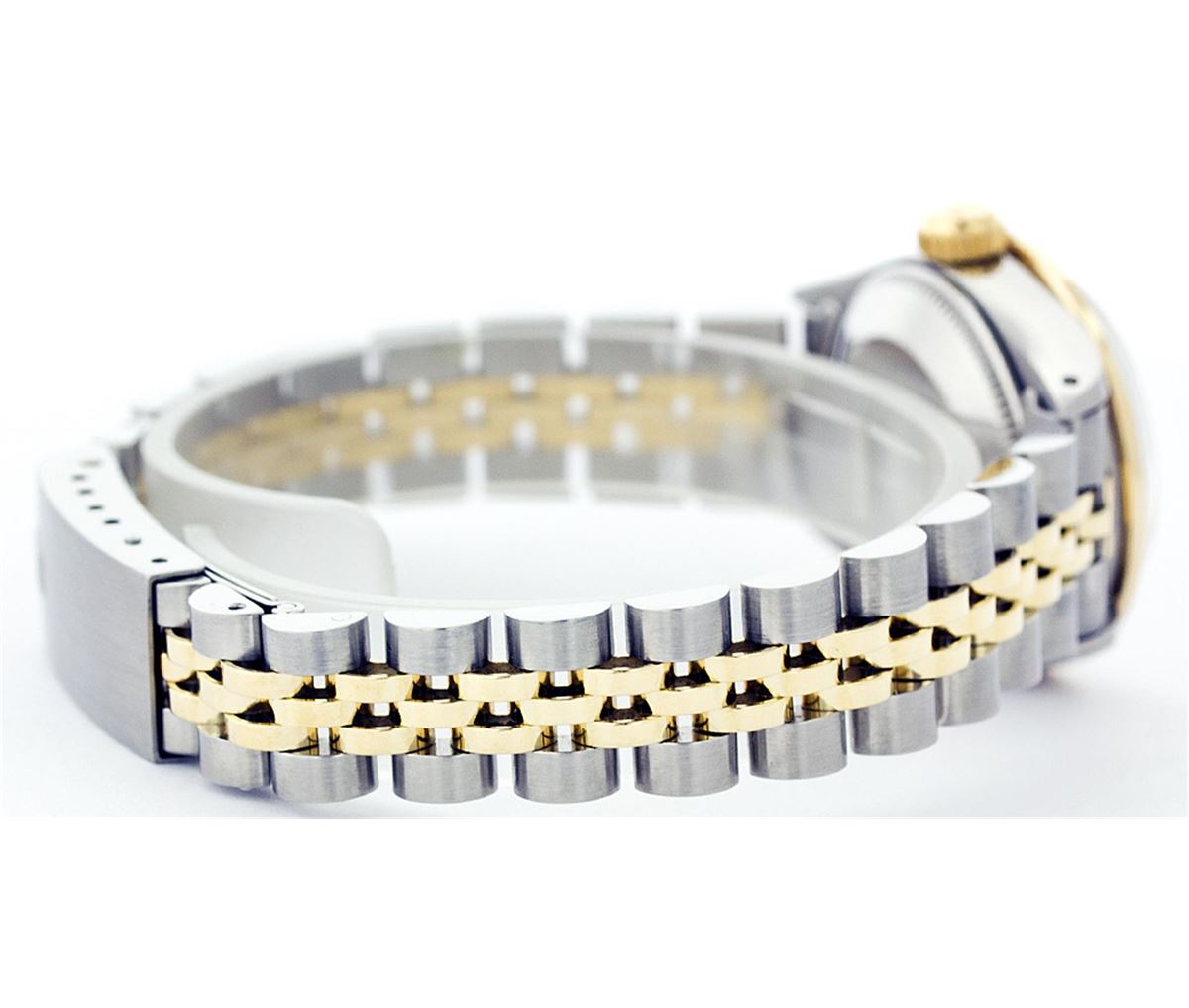 One Ladies Two Tone Rolex Datejust Polished, Serviced & Electronically Tested, 14K Yellow Gold & Stainless Steel Case:26mm, 14K Yellow Gold Crown, Custom Bezel: 18K Yellow Gold Sapphire Beadset Diamond Bezel, Diamond Count: 28 Diamonds + 4 Sapphires Total Weight .70 Carat, Clarity: Si-VS, Color: G to H. Custom Crystal: Synthetic Sapphire Cyclops Lens. Movement: Automatic Winding Movement Caliber 2030. Custom Dial: Ice Blue With Diamond Hour Markers. 10 Diamonds In Dial, Clarity: Si-VS, Color: G to H. Date Window: 3 O'Clock Position Date Display, Non Quickset, Model: 6917 Condition: G-6 Extra Fine. Bracelet: Two Tone 14K Yellow Gold & Stainless Steel Jubilee. Bright Polish. 5.5 Inch Length, Adjustable. Standard Clasp, With Rolex Logo.