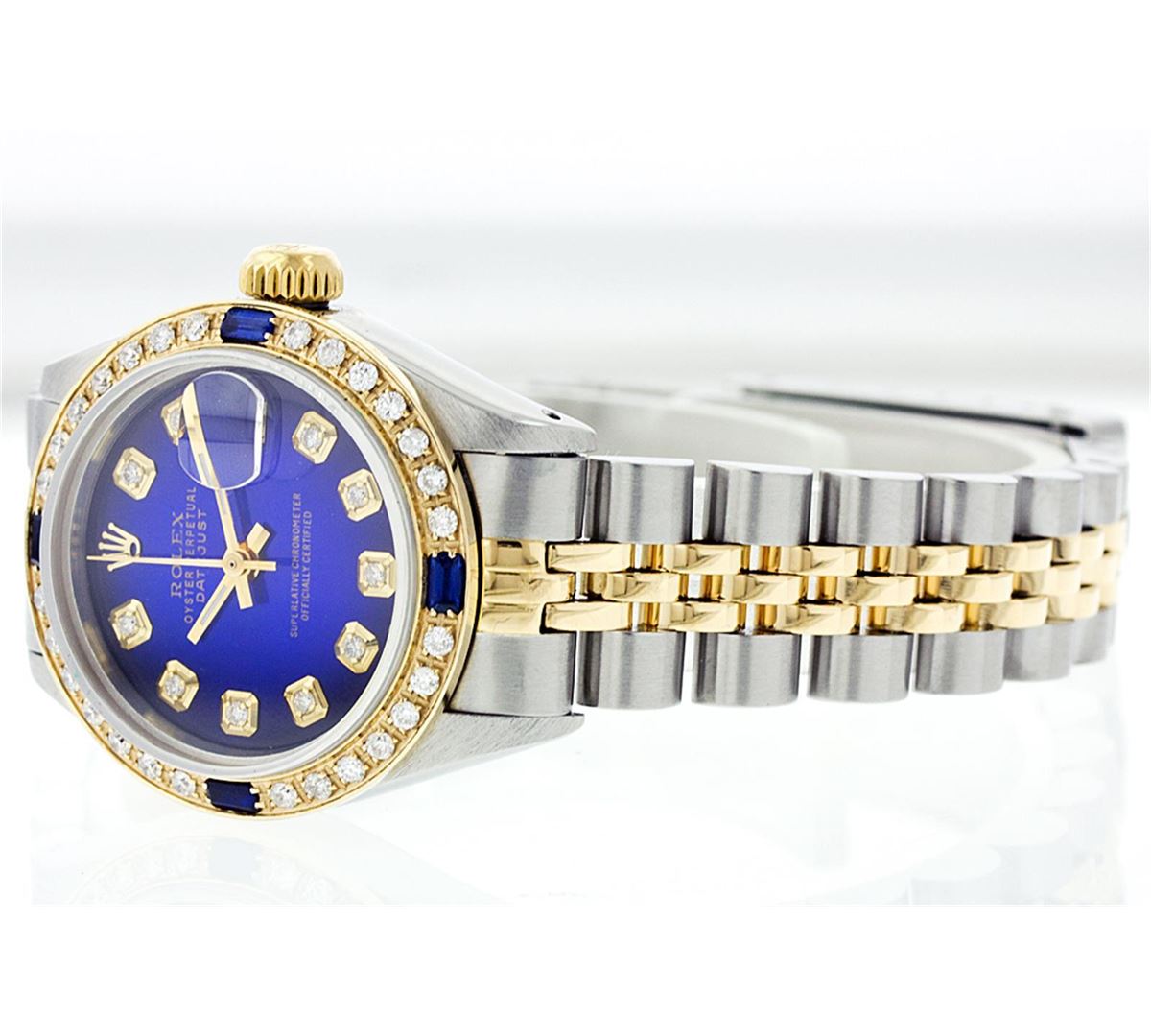 One Ladies Two Tone Rolex Datejust Polished, Serviced & Electronically Tested, 14K Yellow Gold & Stainless Steel Case:26mm, 14K Yellow Gold Crown, Custom Bezel: 18K Yellow Gold Sapphire Beadset Diamond Bezel, Diamond + Gem Count: 28 Diamonds + 4 Sapphires Total Weight .70 Carat, Clarity: Si-VS, Color: G to H. Custom Crystal: Synthetic Sapphire Cyclops Lens. Movement: Automatic Winding Movement Caliber 2030. Custom Dial: Blue Vignette Dial Set With Diamond Hour Markers, 10 Diamond in Dial G To H In Color, Si-VS Clarity. Date Window: 3 O'Clock Position Date Display, Non Quickset, Model: 6917 Condition: G-6 Extra Fine. Bracelet: Two Tone 14K Yellow Gold & Stainless Steel Jubilee. Bright Polish. 5.5 Inch Length, Adjustable. Standard Clasp, With Rolex Logo.