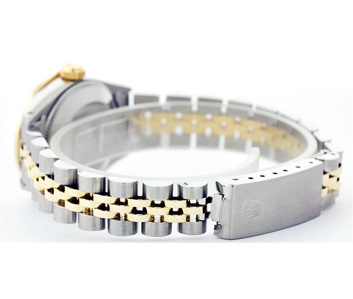 One Ladies Two Tone Rolex Datejust Polished, Serviced & Electronically Tested, 14K Yellow Gold & Stainless Steel Case:26mm, 14K Yellow Gold Crown, Custom Bezel: 18K Yellow Gold Sapphire Beadset Diamond Bezel, Diamond Count: 28 Diamonds + 4 Sapphires Total Weight .70 Carat, Clarity: Si-VS, Color: G to H. Custom Crystal: Synthetic Sapphire Cyclops Lens. Movement: Automatic Winding Movement Caliber 2030. Custom Dial: Ice Blue With Diamond Hour Markers. 10 Diamonds In Dial, Clarity: Si-VS, Color: G to H. Date Window: 3 O'Clock Position Date Display, Non Quickset, Model: 6917 Condition: G-6 Extra Fine. Bracelet: Two Tone 14K Yellow Gold & Stainless Steel Jubilee. Bright Polish. 5.5 Inch Length, Adjustable. Standard Clasp, With Rolex Logo.