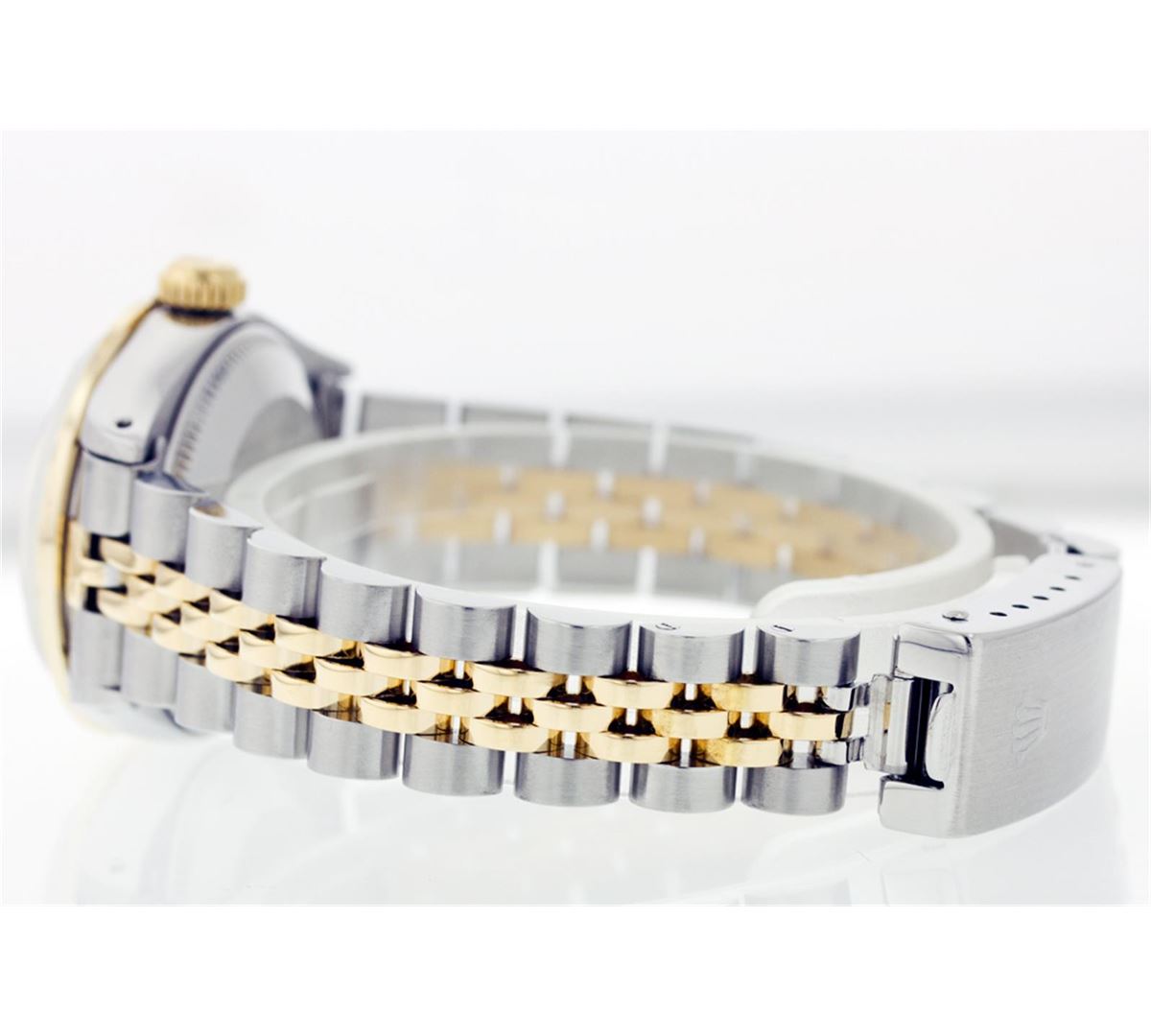 One Ladies Two Tone Rolex Datejust Polished, Serviced & Electronically Tested, 14K Yellow Gold & Stainless Steel Case:26mm, 14K Yellow Gold Crown, Custom Bezel: 18K Yellow Gold Sapphire Beadset Diamond Bezel, Diamond Count: 28 Diamonds + 4 Sapphires Total Weight .70 Carat, Clarity: Si-VS, Color: G to H. Custom Crystal: Synthetic Sapphire Cyclops Lens. Movement: Automatic Winding Movement Caliber 2030. Custom Dial: Blue Vignette With Diamond Hour Markers. 10 Diamonds In Dial, Clarity: Si-VS, Color: G to H. Date Window: 3 O'Clock Position Date Display, Non Quickset, Model: 6917 Condition: G-6 Extra Fine. Bracelet: Two Tone 14K Yellow Gold & Stainless Steel Jubilee. Bright Polish. 5.5 Inch Length, Adjustable. Standard Clasp, With Rolex Logo.