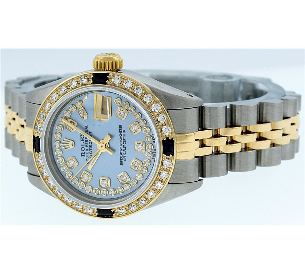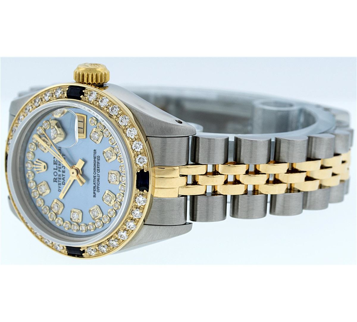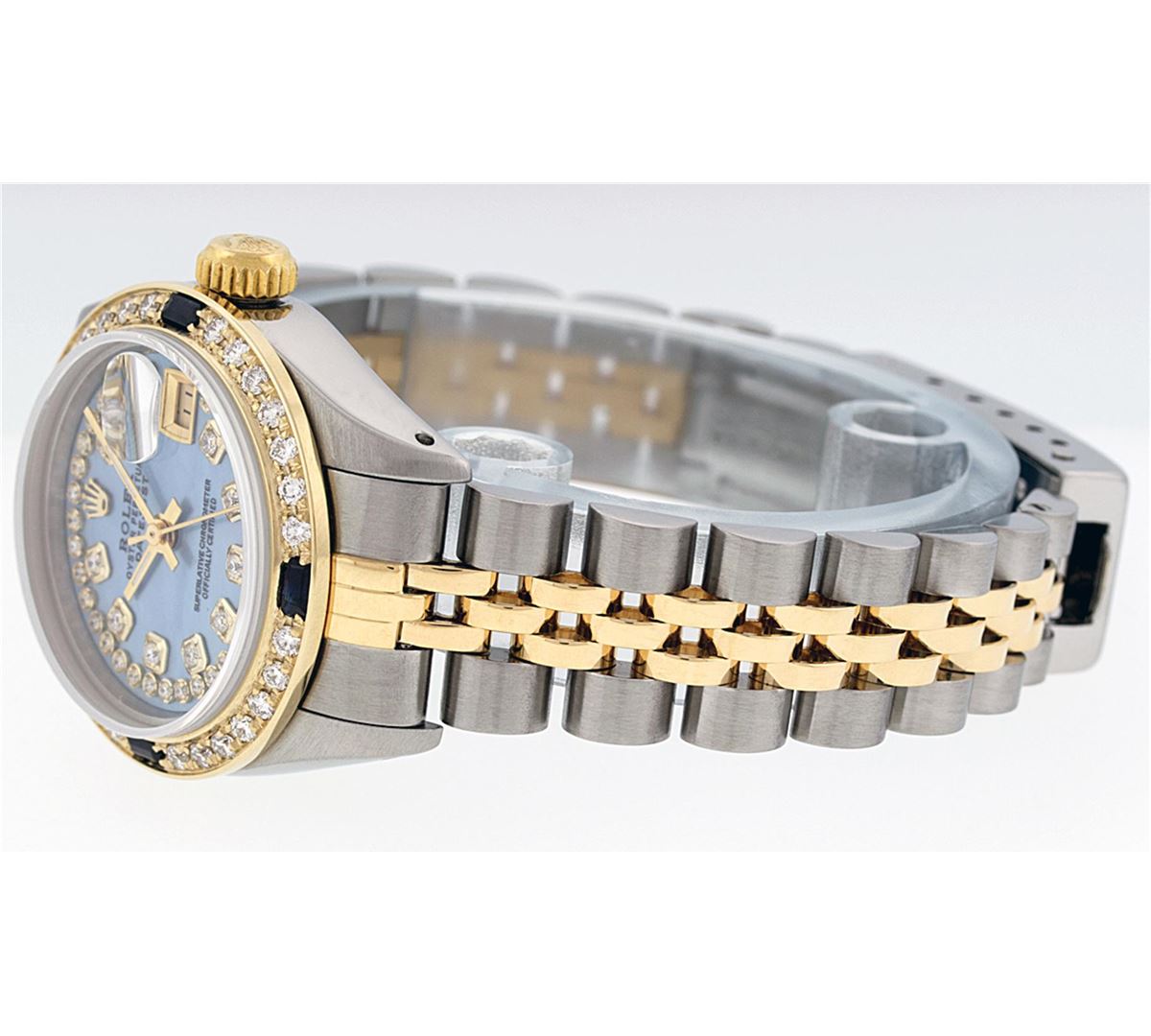 One Ladies Two Tone Rolex Datejust Polished, Serviced & Electronically Tested, 14K Yellow Gold & Stainless Steel Case:26mm, 14K Yellow Gold Crown, Custom Bezel: 18K Yellow Gold Sapphire Beadset Diamond Bezel, Diamond Count: 28 Diamonds + 4 Sapphires. Total Weight .70 Carat, Clarity: Si-VS, Color: G to H. Custom Crystal: Synthetic Sapphire Cyclops Lens. Movement: Automatic Winding Movement Caliber 2030. Custom Dial: Blue Mother Of Pearl With String Diamond Hour Markers. Diamond Count: 43 Diamonds In Dial, Clarity: Si-VS, Color: G to H. Date Window: 3 O'Clock Position Date Display, Non Quickset, Model: Datejust. Condition: G-6 Extra Fine. Bracelet: Two Tone 14K Yellow Gold & Stainless Steel Jubilee. Bright Polish. 6.0 Inch Length, Adjustable. Standard Clasp, With Rolex Logo.