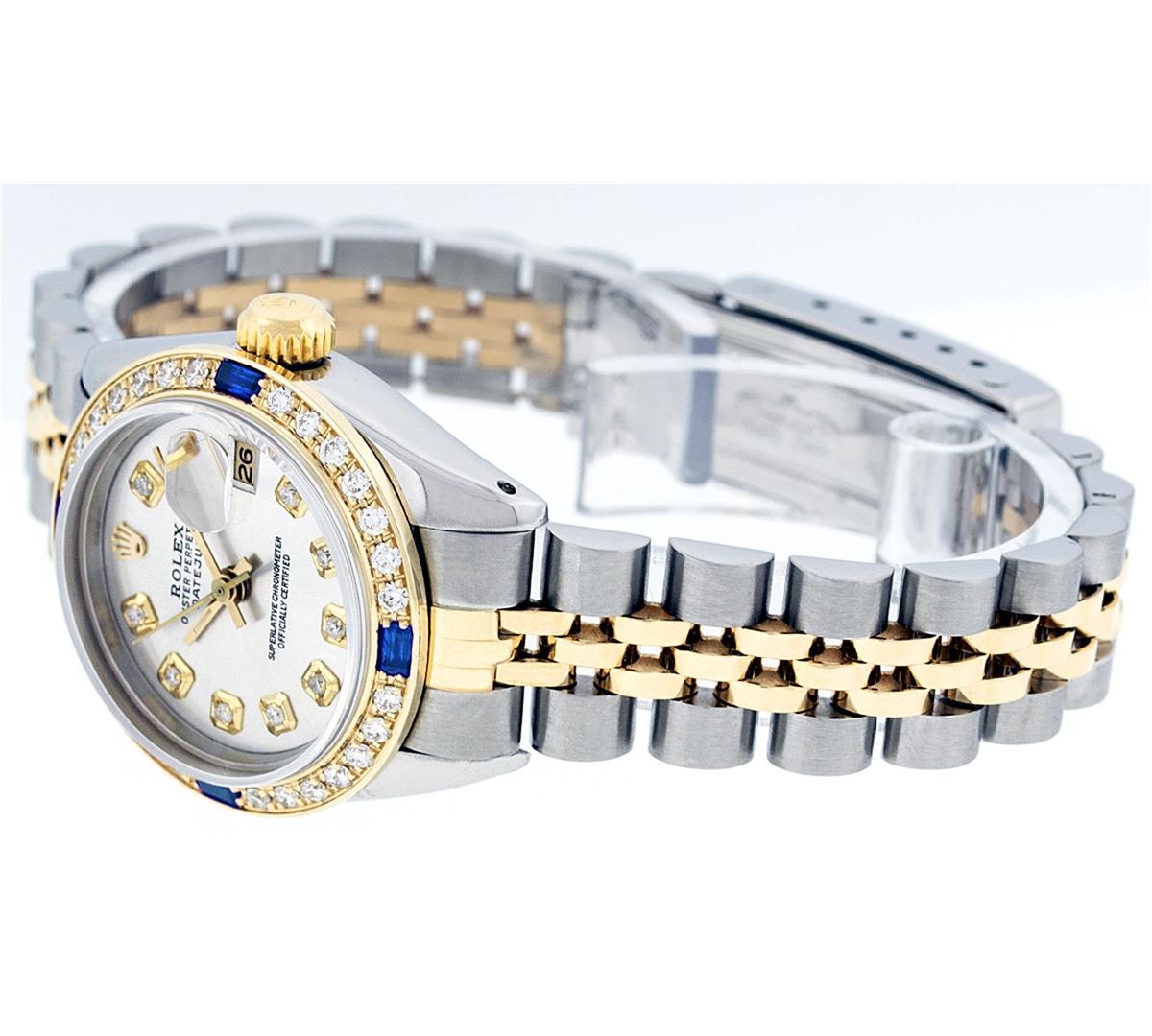 One Ladies Two Tone Rolex Datejust Polished, Serviced & Electronically Tested, 14K Yellow Gold & Stainless Steel Case:26mm, 14K Yellow Gold Crown, Custom Bezel: 18K Yellow Gold Sapphire Beadset Diamond Bezel, Diamond Count: 28 Diamonds + 4 Sapphires, Total Weight .70 Carat, Clarity: Si-VS, Color: G to H. Custom Crystal: Synthetic Sapphire Cyclops Lens. Movement: Automatic Winding Movement Caliber 2030. Custom Dial: Silver With Diamond Hour Markers. 10 Diamonds In Dial, Clarity: Si-VS, Color: G to H. Date Window: 3 O'Clock Position Date Display, Model: Datejust, Condition: G-6 Extra Fine. Bracelet: Two Tone 14K Yellow Gold & Stainless Steel Jubilee. Bright Polish. 6.0 Inch Length, Adjustable. Standard Clasp, With Rolex Logo. Comes with 6 month warranty.