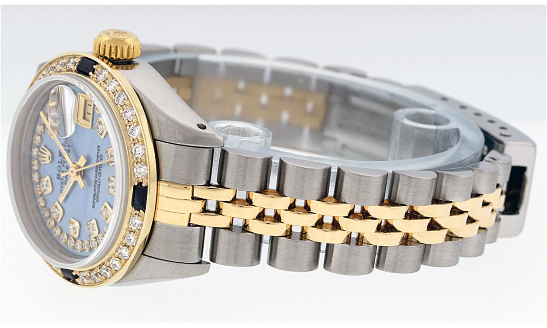 One Ladies Two Tone Rolex Datejust Polished, Serviced & Electronically Tested, 14K Yellow Gold & Stainless Steel Case:26mm, 14K Yellow Gold Crown, Custom Bezel: 18K Yellow Gold Sapphire Beadset Diamond Bezel, Diamond Count: 28 Diamonds + 4 Sapphires. Total Weight .70 Carat, Clarity: Si-VS, Color: G to H. Custom Crystal: Synthetic Sapphire Cyclops Lens. Movement: Automatic Winding Movement Caliber 2030. Custom Dial: Blue Mother Of Pearl With String Diamond Hour Markers. Diamond Count: 43 Diamonds In Dial, Clarity: Si-VS, Color: G to H. Date Window: 3 O'Clock Position Date Display, Non Quickset, Model: Datejust. Condition: G-6 Extra Fine. Bracelet: Two Tone 14K Yellow Gold & Stainless Steel Jubilee. Bright Polish. 6.0 Inch Length, Adjustable. Standard Clasp, With Rolex Logo.