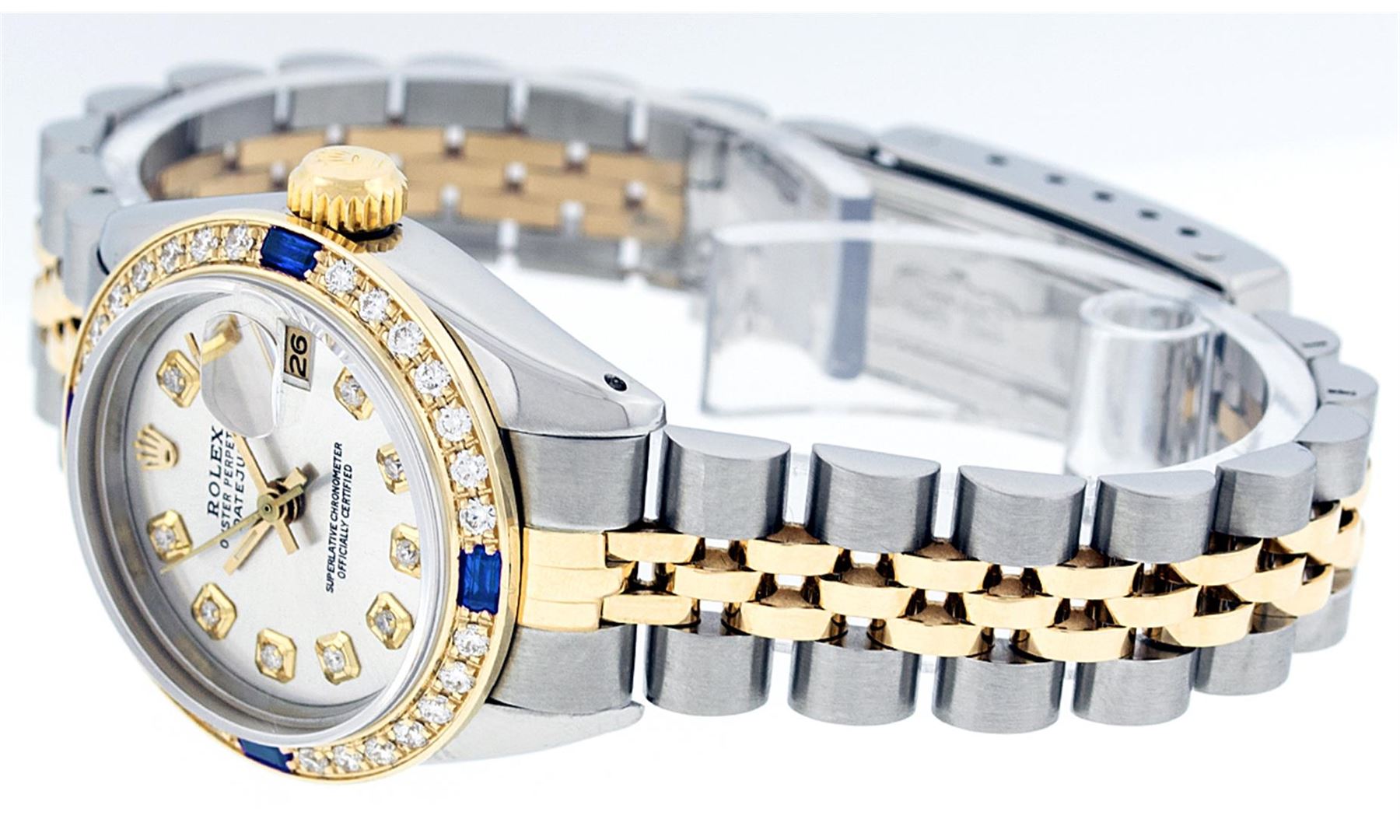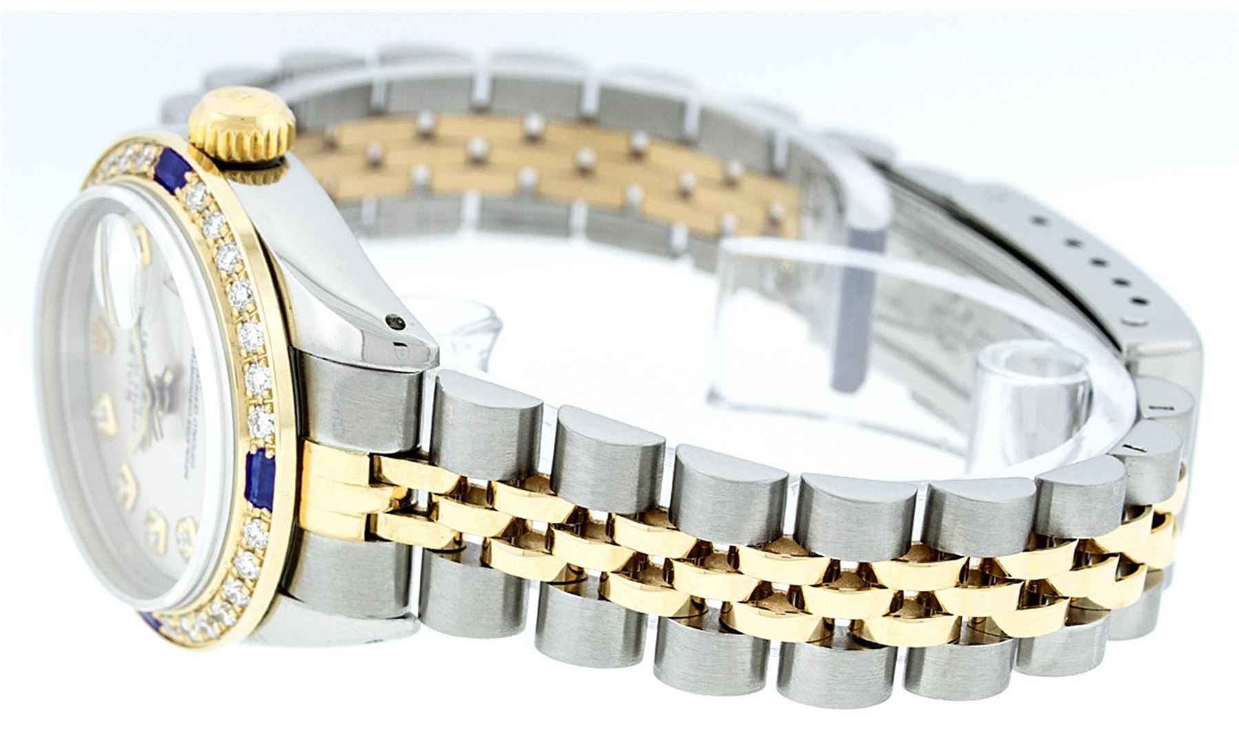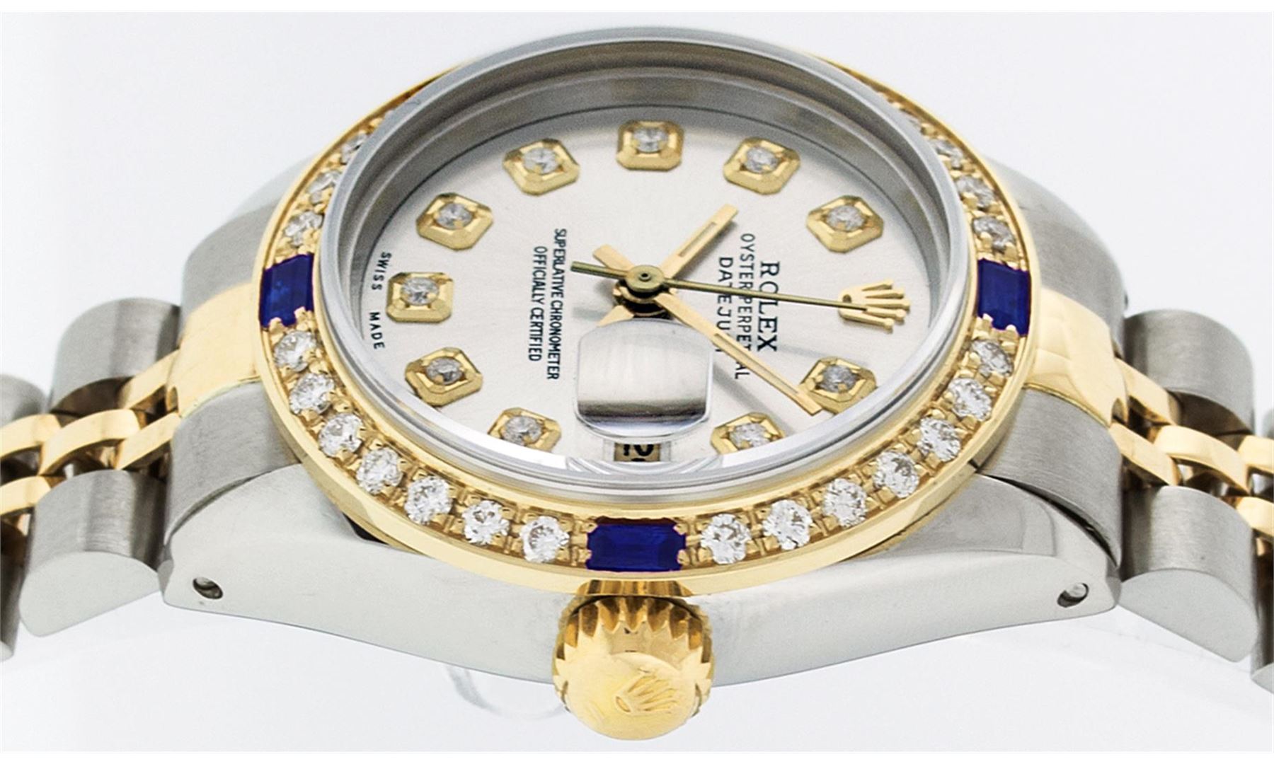 One Ladies Two Tone Rolex Datejust Polished, Serviced & Electronically Tested, 14K Yellow Gold & Stainless Steel Case:26mm, 14K Yellow Gold Crown, Custom Bezel: 18K Yellow Gold Sapphire Beadset Diamond Bezel, Diamond Count: 28 Diamonds + 4 Sapphires, Total Weight .70 Carat, Clarity: Si-VS, Color: G to H. Custom Crystal: Synthetic Sapphire Cyclops Lens. Movement: Automatic Winding Movement Caliber 2030. Custom Dial: Silver With Diamond Hour Markers. 10 Diamonds In Dial, Clarity: Si-VS, Color: G to H. Date Window: 3 O'Clock Position Date Display, Model: Datejust, Condition: G-6 Extra Fine. Bracelet: Two Tone 14K Yellow Gold & Stainless Steel Jubilee. Bright Polish. 6.0 Inch Length, Adjustable. Standard Clasp, With Rolex Logo. Comes with 6 month warranty.