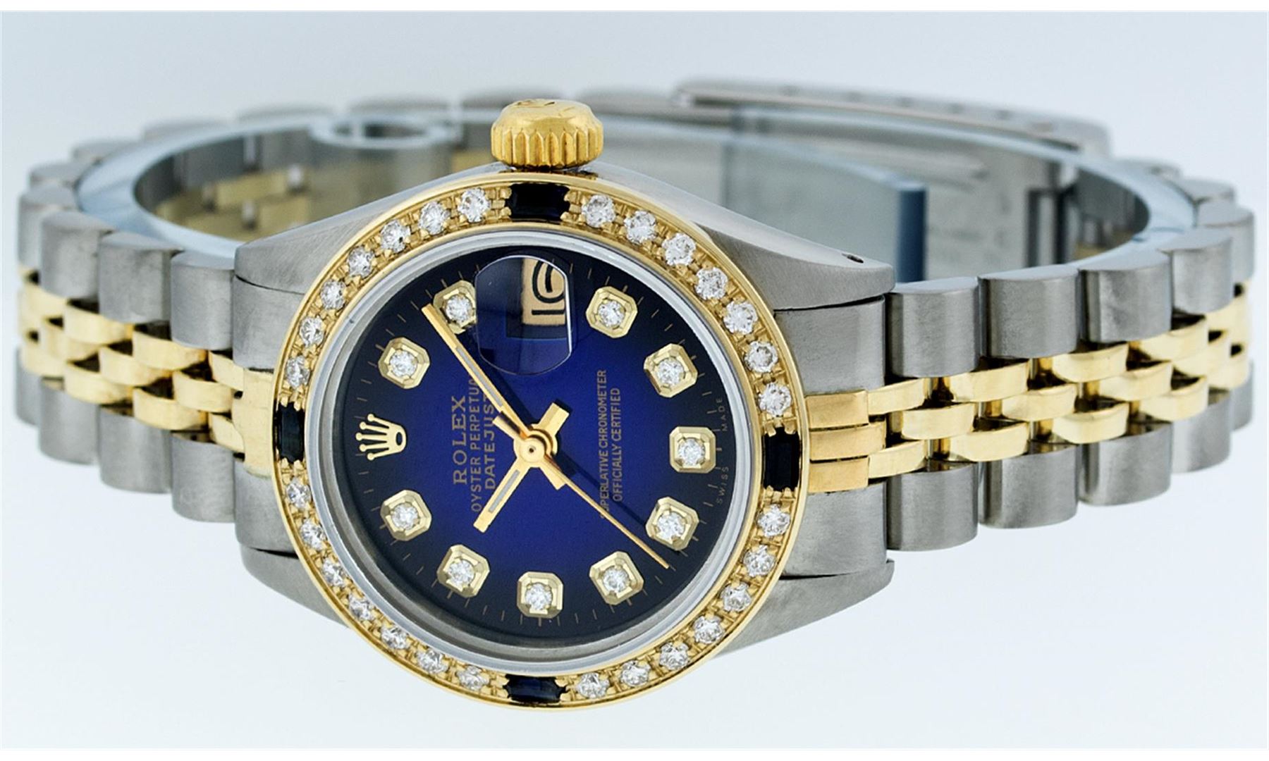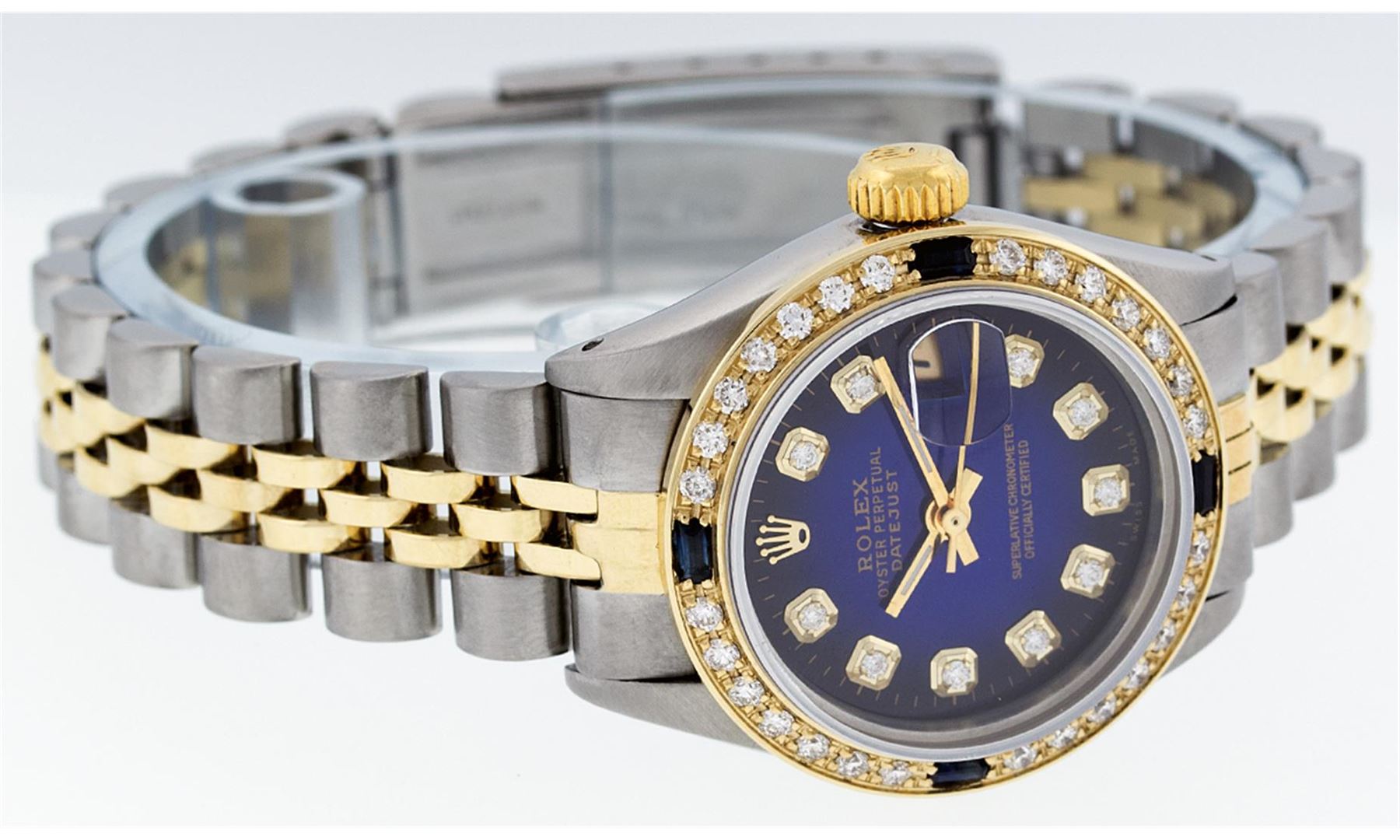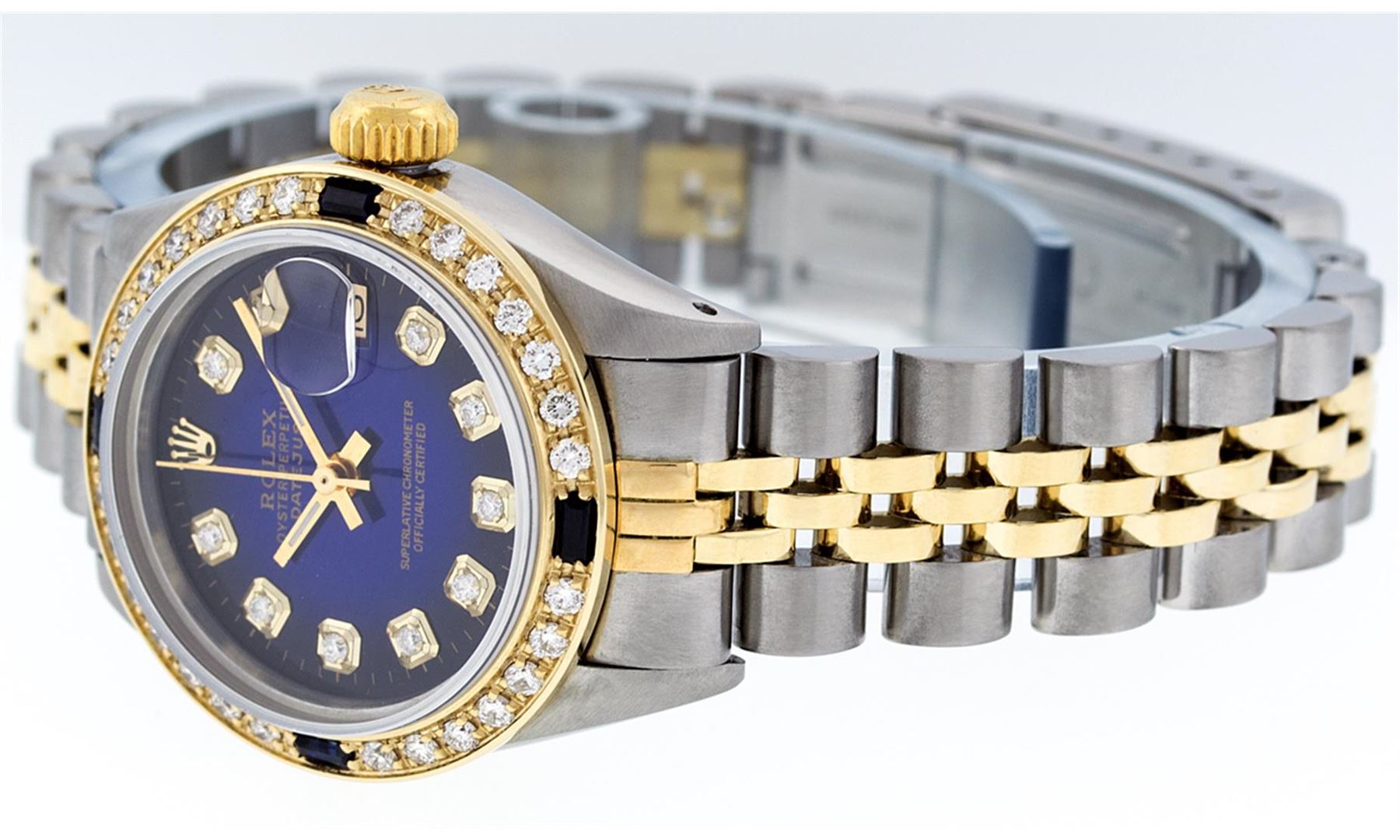 One Ladies Two Tone Rolex Datejust Polished, Serviced & Electronically Tested, 14K Yellow Gold & Stainless Steel Case:26mm, 14K Yellow Gold Crown, Custom Bezel: 18K Yellow Gold Sapphire Beadset Diamond Bezel, Diamond Count: 28 Diamonds + 4 Sapphires, Total Weight .70 Carat, Clarity: Si-VS, Color: G to H. Custom Crystal: Synthetic Sapphire Cyclops Lens. Movement: Automatic Winding Movement Caliber 2030. Custom Dial: Blue Vignette With Diamond Hour Markers And Line Track. Diamond Count: 10 Diamonds In Dial, Clarity: Si-VS, Color: G to H. Date Window: 3 O'Clock Position Date Display, Model: Datejust, Condition: G-6 Extra Fine. Bracelet: Two Tone 14K Yellow Gold & Stainless Steel Jubilee. Bright Polish. 6.0 Inch Length, Adjustable. Standard Clasp, With Rolex Logo.