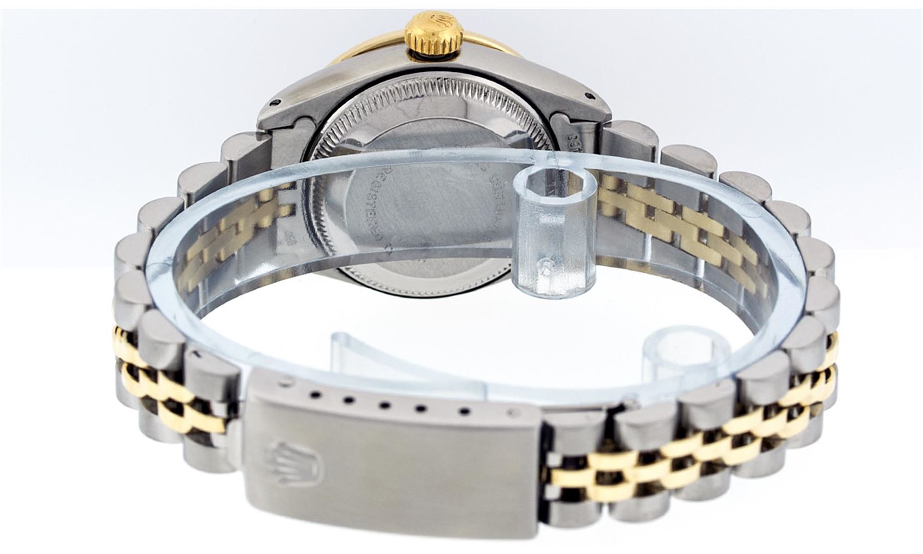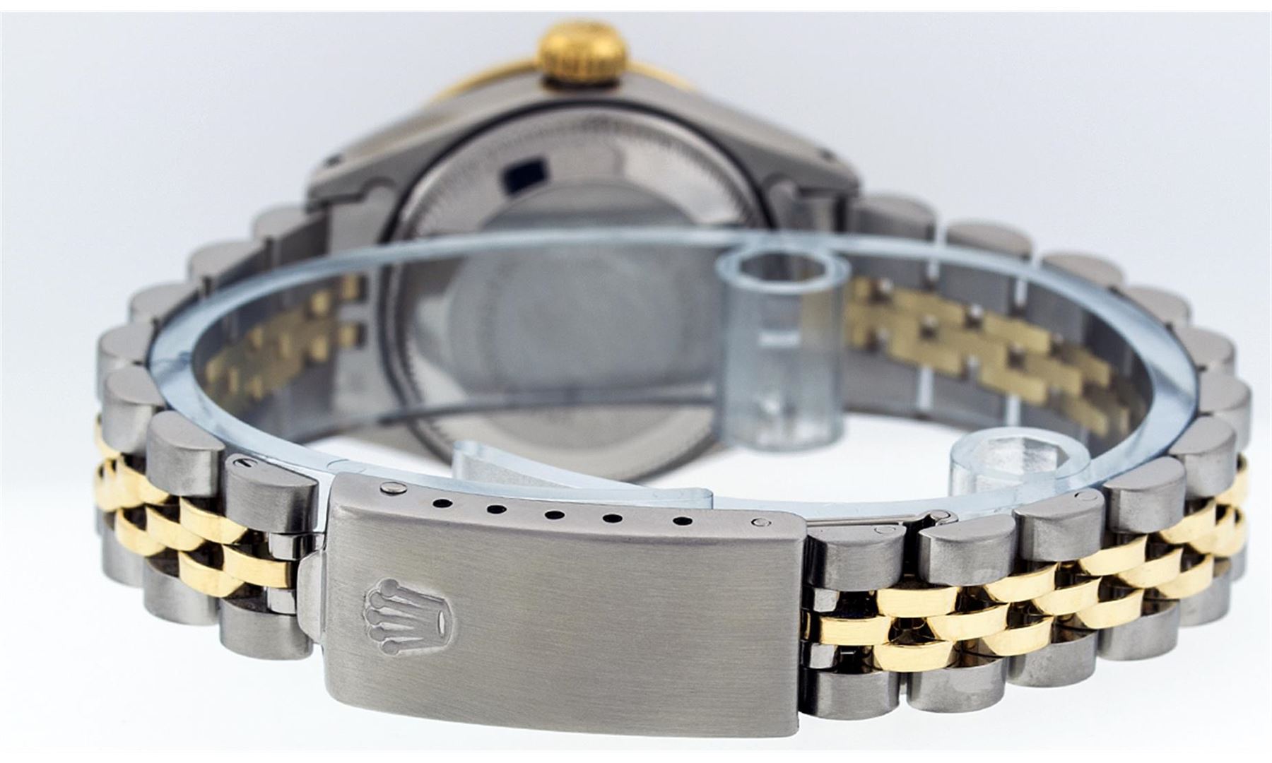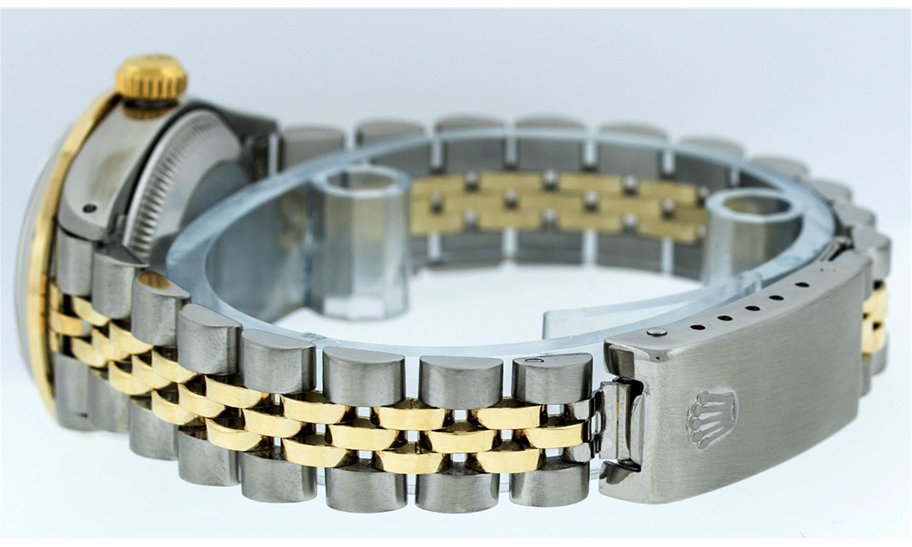One Ladies Two Tone Rolex Datejust Polished, Serviced & Electronically Tested, 14K Yellow Gold & Stainless Steel Case:26mm, 14K Yellow Gold Crown, Custom Bezel: 18K Yellow Gold Sapphire Beadset Diamond Bezel, Diamond Count: 28 Diamonds + 4 Sapphires, Total Weight .70 Carat, Clarity: Si-VS, Color: G to H. Custom Crystal: Synthetic Sapphire Cyclops Lens. Movement: Automatic Winding Movement Caliber 2030. Custom Dial: Blue Vignette With Diamond Hour Markers And Line Track. Diamond Count: 10 Diamonds In Dial, Clarity: Si-VS, Color: G to H. Date Window: 3 O'Clock Position Date Display, Model: Datejust, Condition: G-6 Extra Fine. Bracelet: Two Tone 14K Yellow Gold & Stainless Steel Jubilee. Bright Polish. 6.0 Inch Length, Adjustable. Standard Clasp, With Rolex Logo.