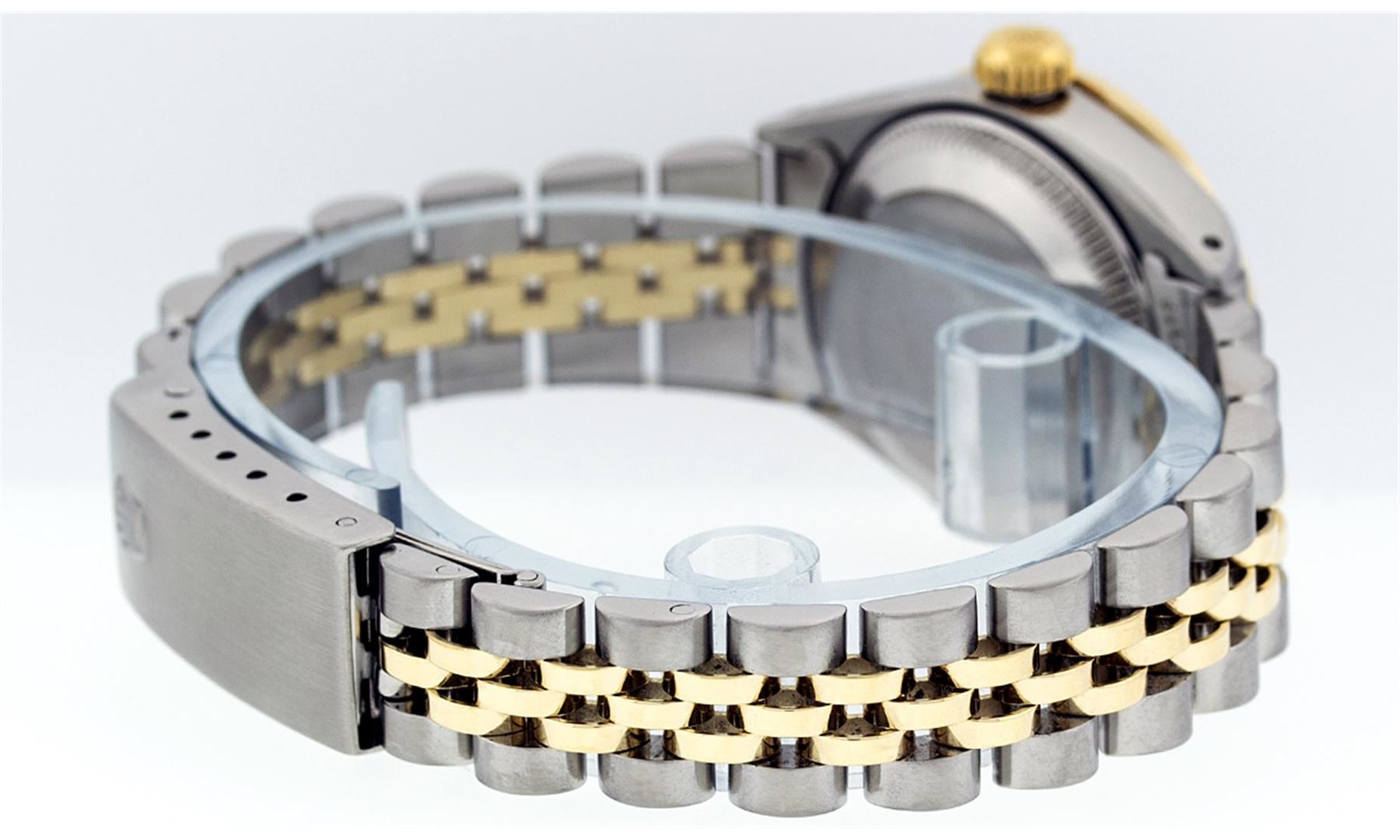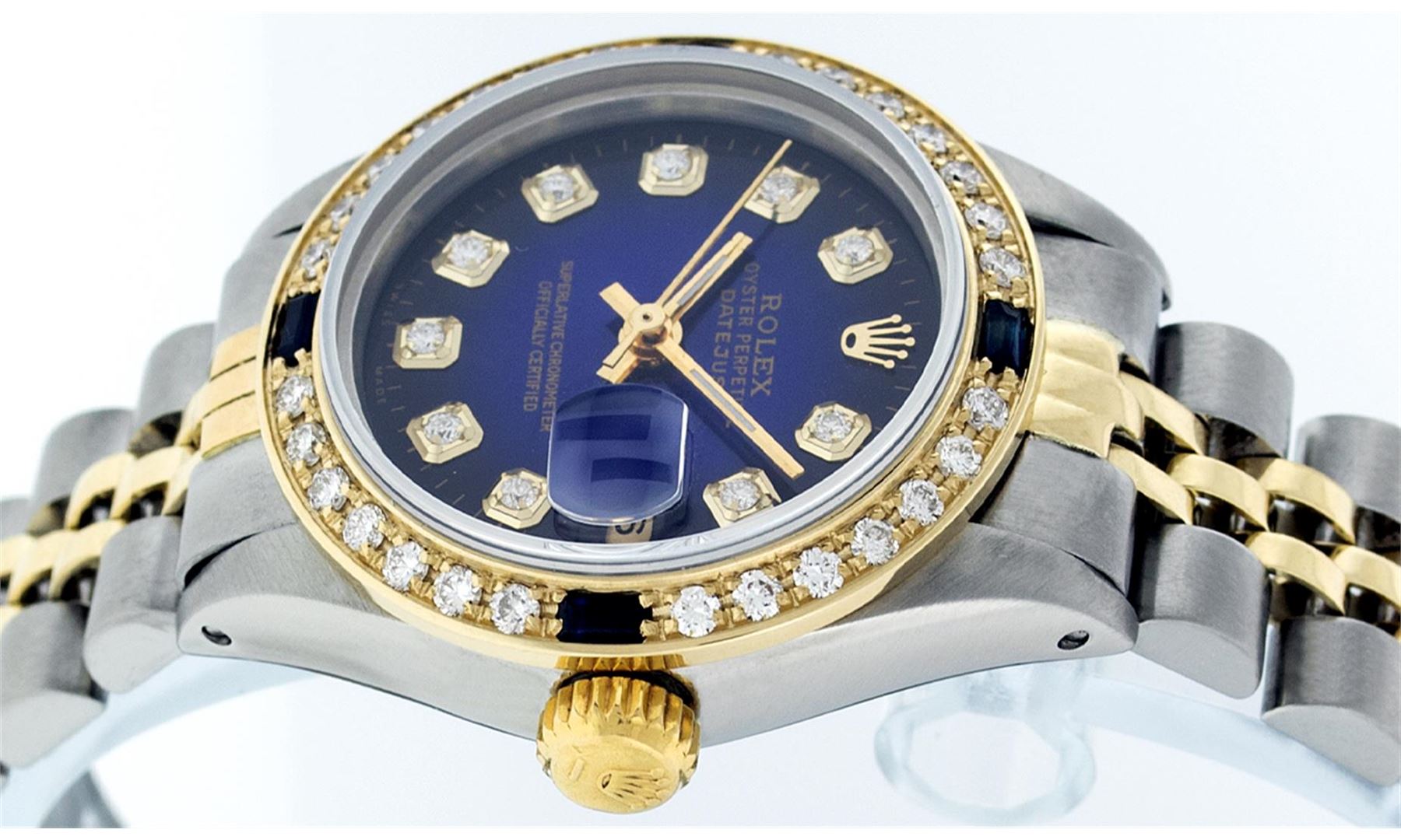 One Ladies Two Tone Rolex Datejust Polished, Serviced & Electronically Tested, 14K Yellow Gold & Stainless Steel Case:26mm, 14K Yellow Gold Crown, Custom Bezel: 18K Yellow Gold Sapphire Beadset Diamond Bezel, Diamond Count: 28 Diamonds + 4 Sapphires, Total Weight .70 Carat, Clarity: Si-VS, Color: G to H. Custom Crystal: Synthetic Sapphire Cyclops Lens. Movement: Automatic Winding Movement Caliber 2030. Custom Dial: Blue Vignette With Diamond Hour Markers And Line Track. Diamond Count: 10 Diamonds In Dial, Clarity: Si-VS, Color: G to H. Date Window: 3 O'Clock Position Date Display, Model: Datejust, Condition: G-6 Extra Fine. Bracelet: Two Tone 14K Yellow Gold & Stainless Steel Jubilee. Bright Polish. 6.0 Inch Length, Adjustable. Standard Clasp, With Rolex Logo.