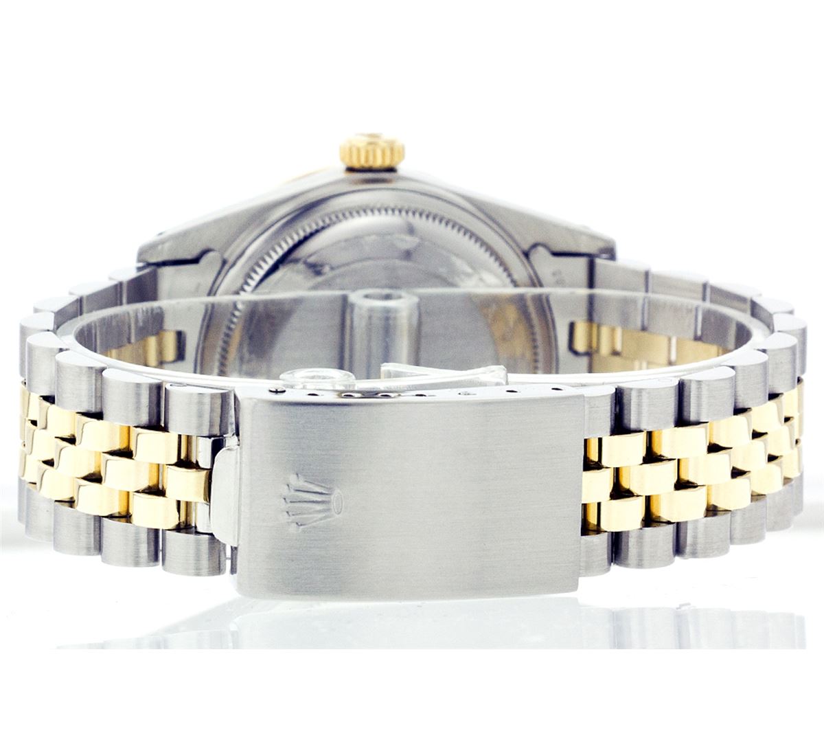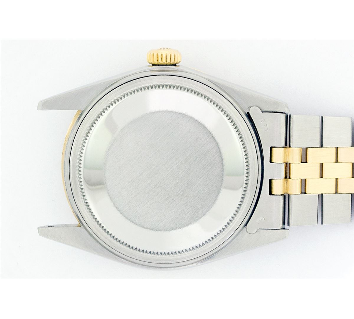 One Gents Two Tone Rolex Datejust Polished, Serviced & Electronically Tested, 14K Yellow Gold & Stainless Steel Case:36mm, 14K Yellow Gold Crown, Custom Bezel: 18K Yellow Gold Sapphire Beadset Diamond Bezel, Diamond Count: 36 Diamonds + 4 Sapphires Total Weight 1.00 Carat, Clarity: Si-VS, Color: G to H. Custom Crystal: Synthetic Sapphire Cyclops Lens. Movement: Automatic Winding Movement Caliber 3035. Custom Dial: Blue Dial Set With Diamond Hour Markers, 8 + 2 Baguette Diamonds in Dial G To H In Color, Si-VS Clarity, Date Window: 3 O'Clock Position Date Display, Quickset, Model: 16013 Condition: G-6 Extra Fine. Bracelet: Two Tone 14K Yellow Gold & Stainless Steel Jubilee. Bright Polish. 6.5 Inch Length, Adjustable. Standard Clasp, With Rolex Logo.