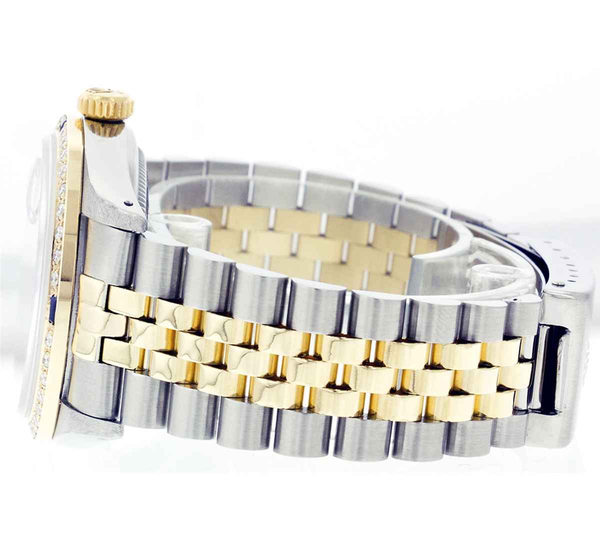 One Mens Two Tone Rolex Datejust Polished, Serviced & Electronically Tested, 14K Yellow Gold & Stainless Steel Case:36mm, 14K Yellow Gold Crown, Custom Bezel: 18K Yellow Gold Sapphire Beadset Diamond Bezel, Diamond Count: 36 Diamonds + 4 Sapphires Total Weight 1.00 Carat, Clarity: Si-VS, Color: G to H. Custom Crystal: Synthetic Sapphire Cyclops Lens. Movement: Automatic Winding Movement Caliber 3035. Custom Dial: Blue Dial Set With Diamond Hour Markers, 10 Diamonds in Dial G To H In Color, Si-VS Clarity, Date Window: 3 O'Clock Position Date Display, Quickset, Model: 16013 Condition: G-6 Extra Fine. Bracelet: Two Tone 14K Yellow Gold & Stainless Steel Jubilee. Bright Polish. 6.5 Inch Length, Adjustable. Standard Clasp, With Rolex Logo.
