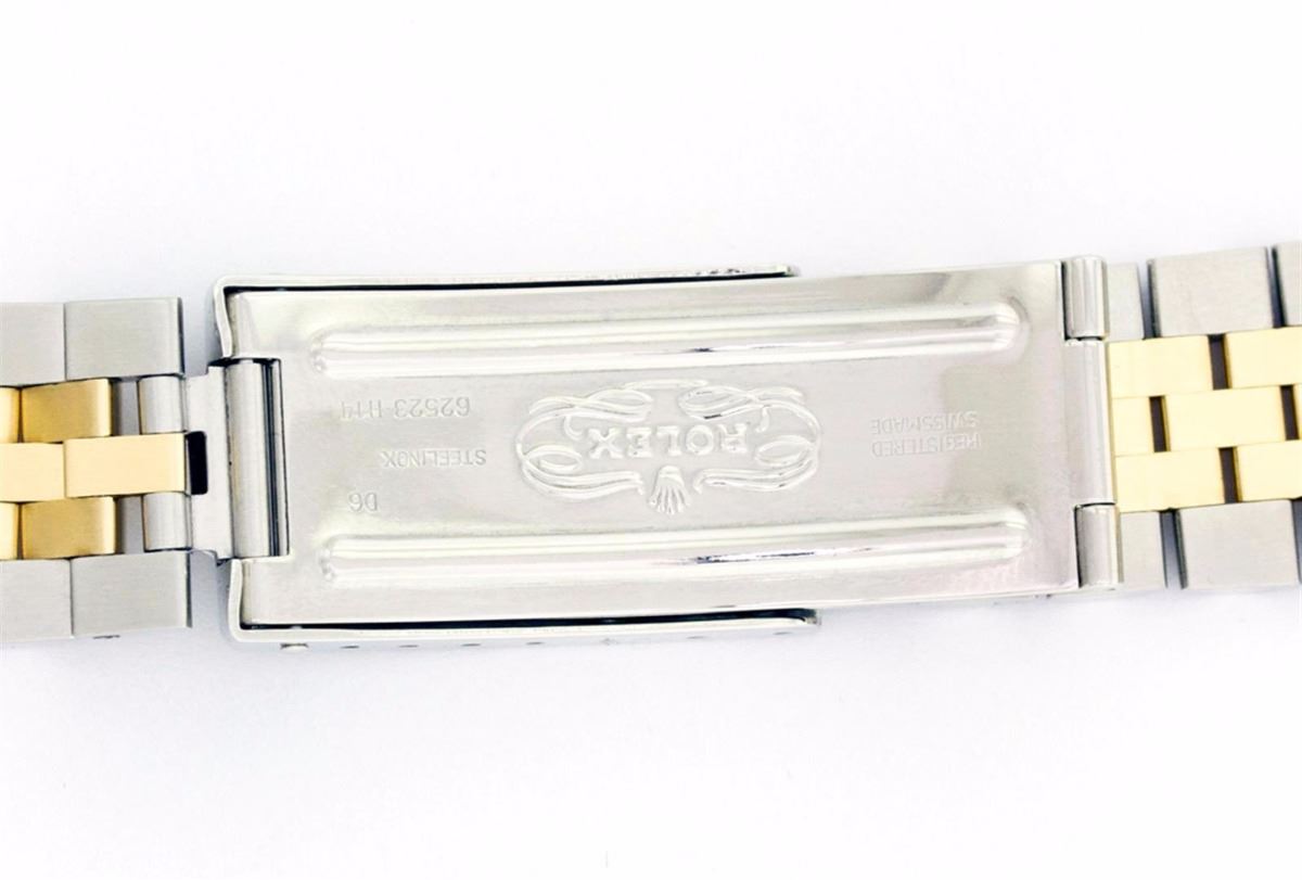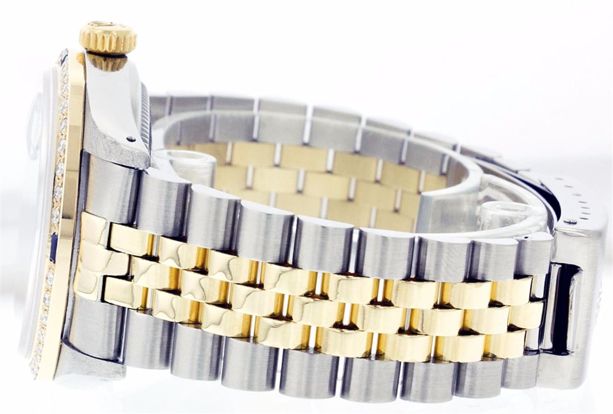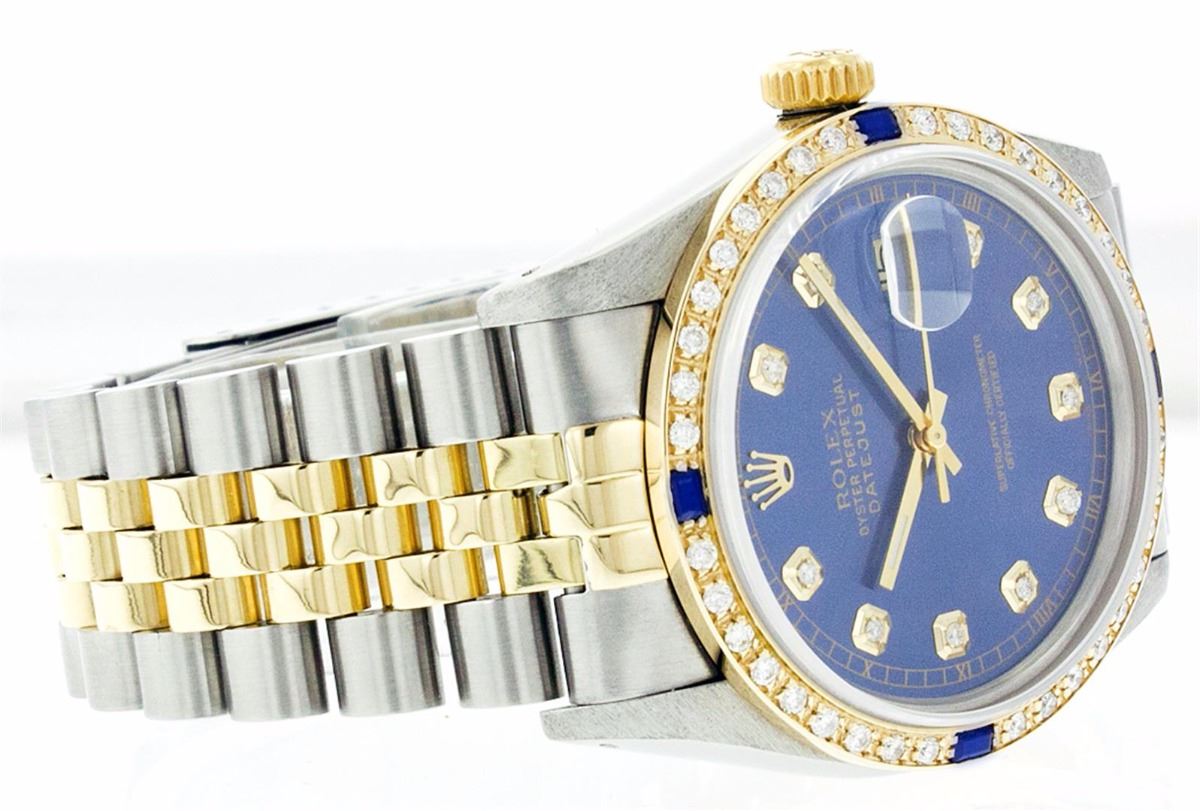 One Gents Two Tone Rolex Datejust Polished, Serviced & Electronically Tested, 14K Yellow Gold & Stainless Steel Case:36mm, 14K Yellow Gold Crown, Custom Bezel: 18K Yellow Gold Sapphire Beadset Diamond Bezel, Diamond Count: 36 Diamonds + 4 Sapphires Total Weight 1.00 Carat, Clarity: Si-VS, Color: G to H. Custom Crystal: Synthetic Sapphire Cyclops Lens. Movement: Automatic Winding Movement Caliber 3035. Custom Dial: Blue Dial Set With Diamond Hour Markers, 8 + 2 Baguette Diamonds in Dial G To H In Color, Si-VS Clarity, Date Window: 3 O'Clock Position Date Display, Quickset, Model: 16013 Condition: G-6 Extra Fine. Bracelet: Two Tone 14K Yellow Gold & Stainless Steel Jubilee. Bright Polish. 6.5 Inch Length, Adjustable. Standard Clasp, With Rolex Logo.