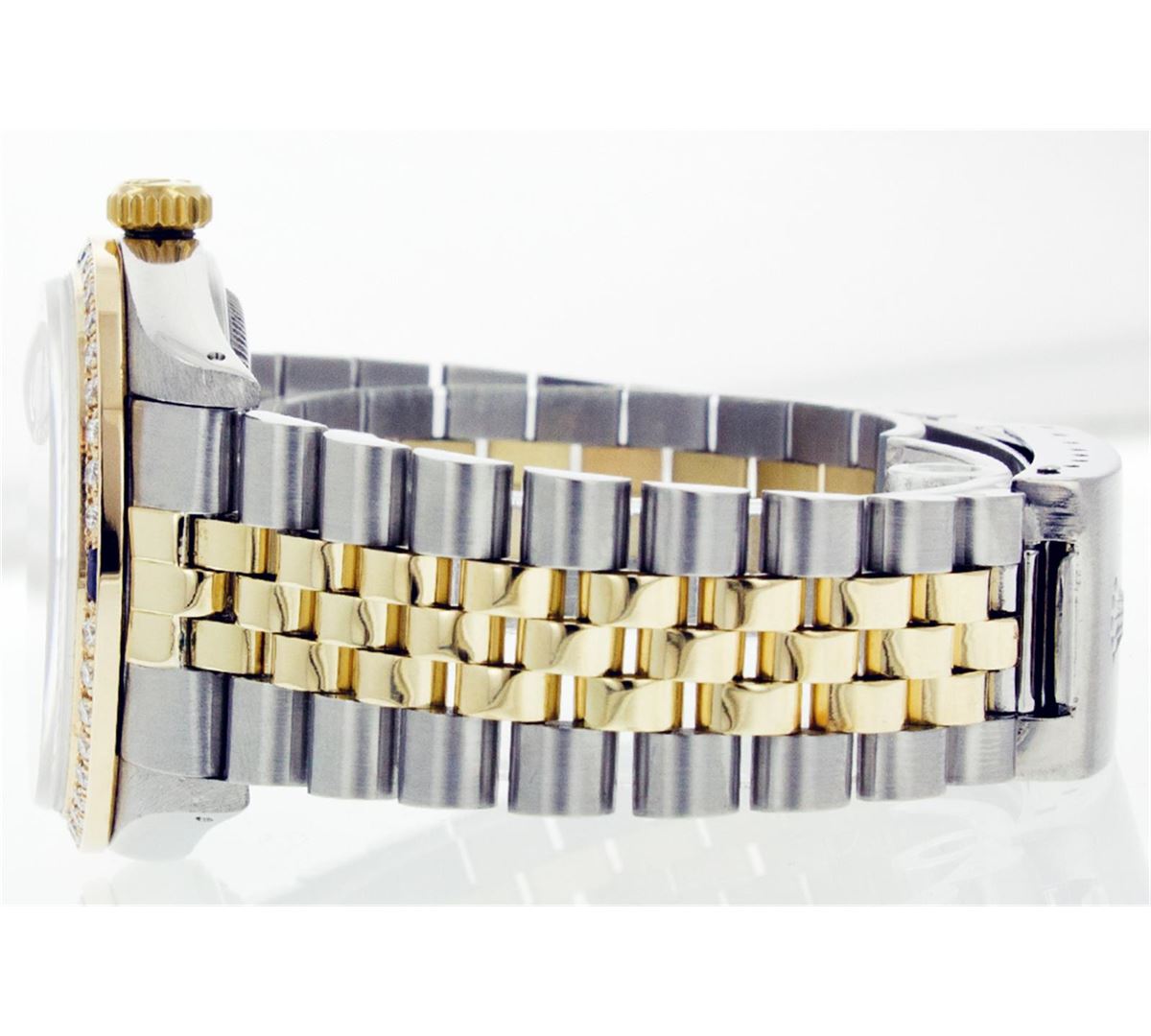 One Mens Two Tone Rolex Datejust Polished, Serviced & Electronically Tested, 14K Yellow Gold & Stainless Steel Case:36mm, 14K Yellow Gold Crown, Custom Bezel: 18K Yellow Gold Sapphire Beadset Diamond Bezel, Diamond Count: 36 Diamonds + 4 Sapphires Total Weight 1.00 Carat, Clarity: Si-VS, Color: G to H. Custom Crystal: Synthetic Sapphire Cyclops Lens. Movement: Automatic Winding Movement Caliber 3035. Custom Dial: Mother Of Pearl Dial Set With Diamond Hour Markers and Baguette Markers On 6 and 9, Diamond Count: 8 + 2 Baguette Diamonds in Dial G To H In Color , Date Window: 3 O'Clock Position Date Display, Quickset, Model: 16013 Condition: G-6 Extra Fine. Bracelet: Two Tone 14K Yellow Gold & Stainless Steel Jubilee. Bright Polish. 6.5 Inch Length, Adjustable. Standard Clasp, With Rolex Logo.