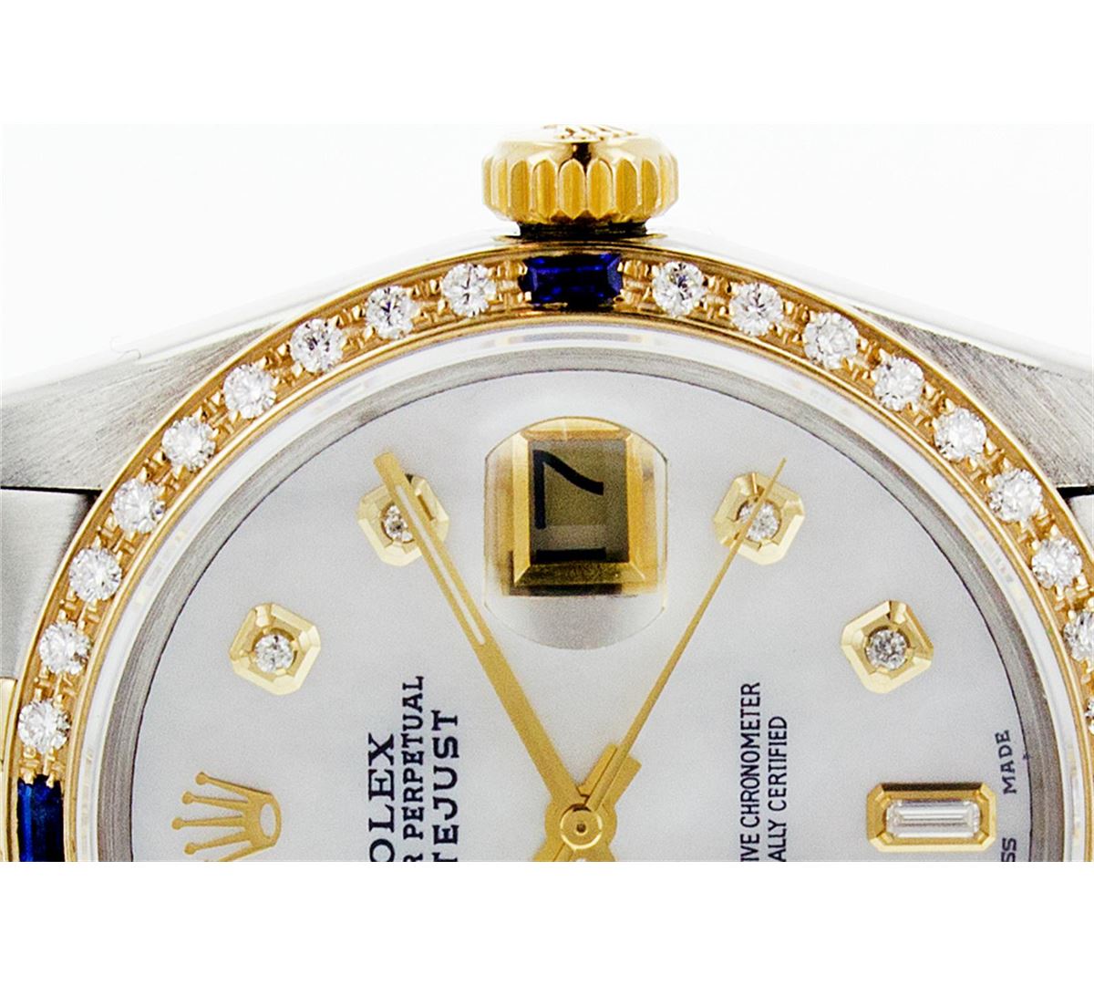 One Mens Two Tone Rolex Datejust Polished, Serviced & Electronically Tested, 14K Yellow Gold & Stainless Steel Case:36mm, 14K Yellow Gold Crown, Custom Bezel: 18K Yellow Gold Sapphire Beadset Diamond Bezel, Diamond Count: 36 Diamonds + 4 Sapphires Total Weight 1.00 Carat, Clarity: Si-VS, Color: G to H. Custom Crystal: Synthetic Sapphire Cyclops Lens. Movement: Automatic Winding Movement Caliber 3035. Custom Dial: Mother Of Pearl Dial Set With Diamond Hour Markers and Baguette Markers On 6 and 9, Diamond Count: 8 + 2 Baguette Diamonds in Dial G To H In Color , Date Window: 3 O'Clock Position Date Display, Quickset, Model: 16013 Condition: G-6 Extra Fine. Bracelet: Two Tone 14K Yellow Gold & Stainless Steel Jubilee. Bright Polish. 6.5 Inch Length, Adjustable. Standard Clasp, With Rolex Logo.