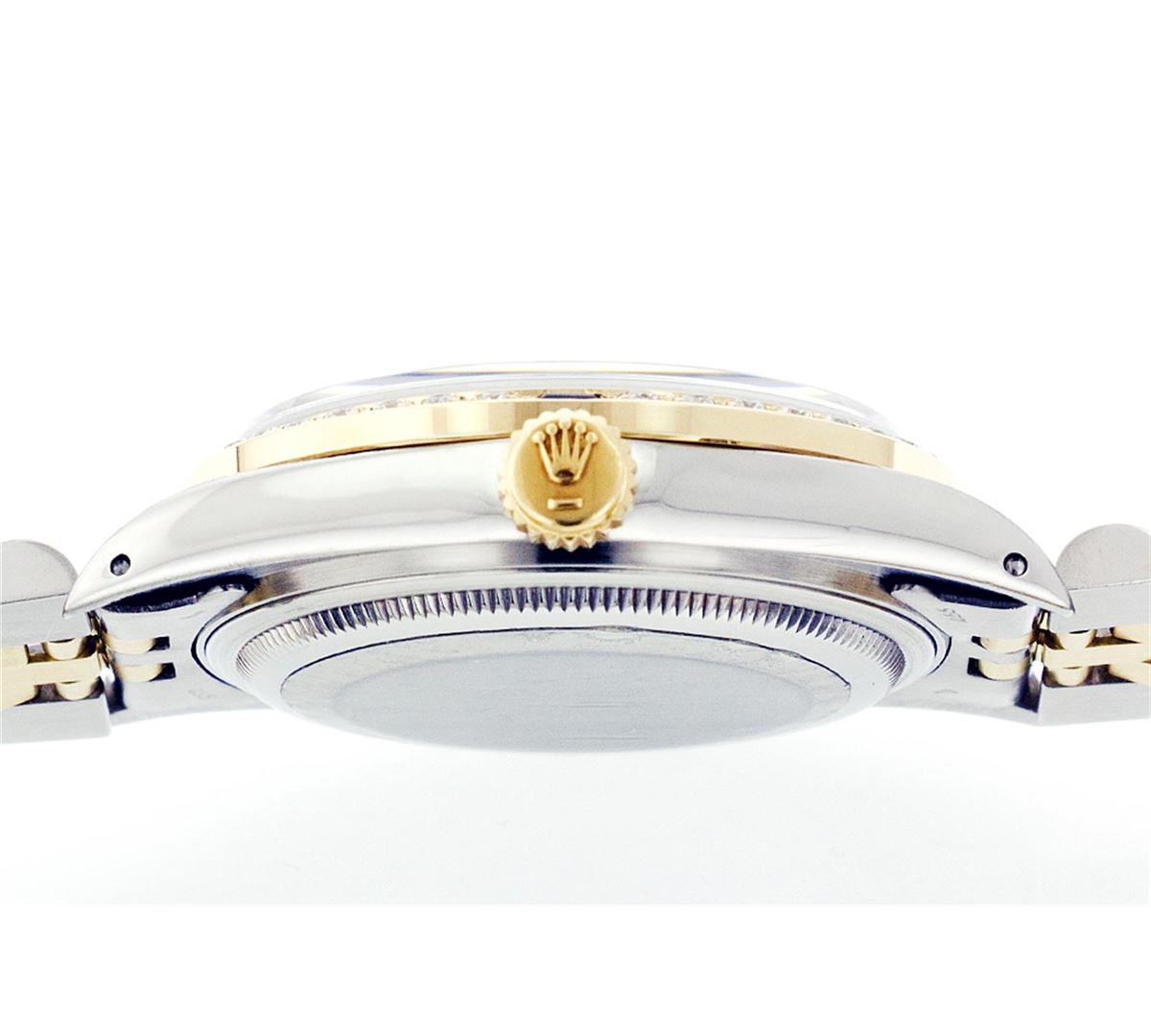 One Mens Two Tone Rolex Datejust Polished, Serviced & Electronically Tested, 14K Yellow Gold & Stainless Steel Case:36mm, 14K Yellow Gold Crown, Custom Bezel: 18K Yellow Gold Sapphire Beadset Diamond Bezel, Diamond Count: 36 Diamonds + 4 Sapphires Total Weight 1.00 Carat, Clarity: Si-VS, Color: G to H. Custom Crystal: Synthetic Sapphire Cyclops Lens. Movement: Automatic Winding Movement Caliber 3035. Custom Dial: Blue Dial Set With Diamond Hour Markers, 10 Diamonds in Dial G To H In Color, Si-VS Clarity, Date Window: 3 O'Clock Position Date Display, Quickset, Model: 16013 Condition: G-6 Extra Fine. Bracelet: Two Tone 14K Yellow Gold & Stainless Steel Jubilee. Bright Polish. 6.5 Inch Length, Adjustable. Standard Clasp, With Rolex Logo.