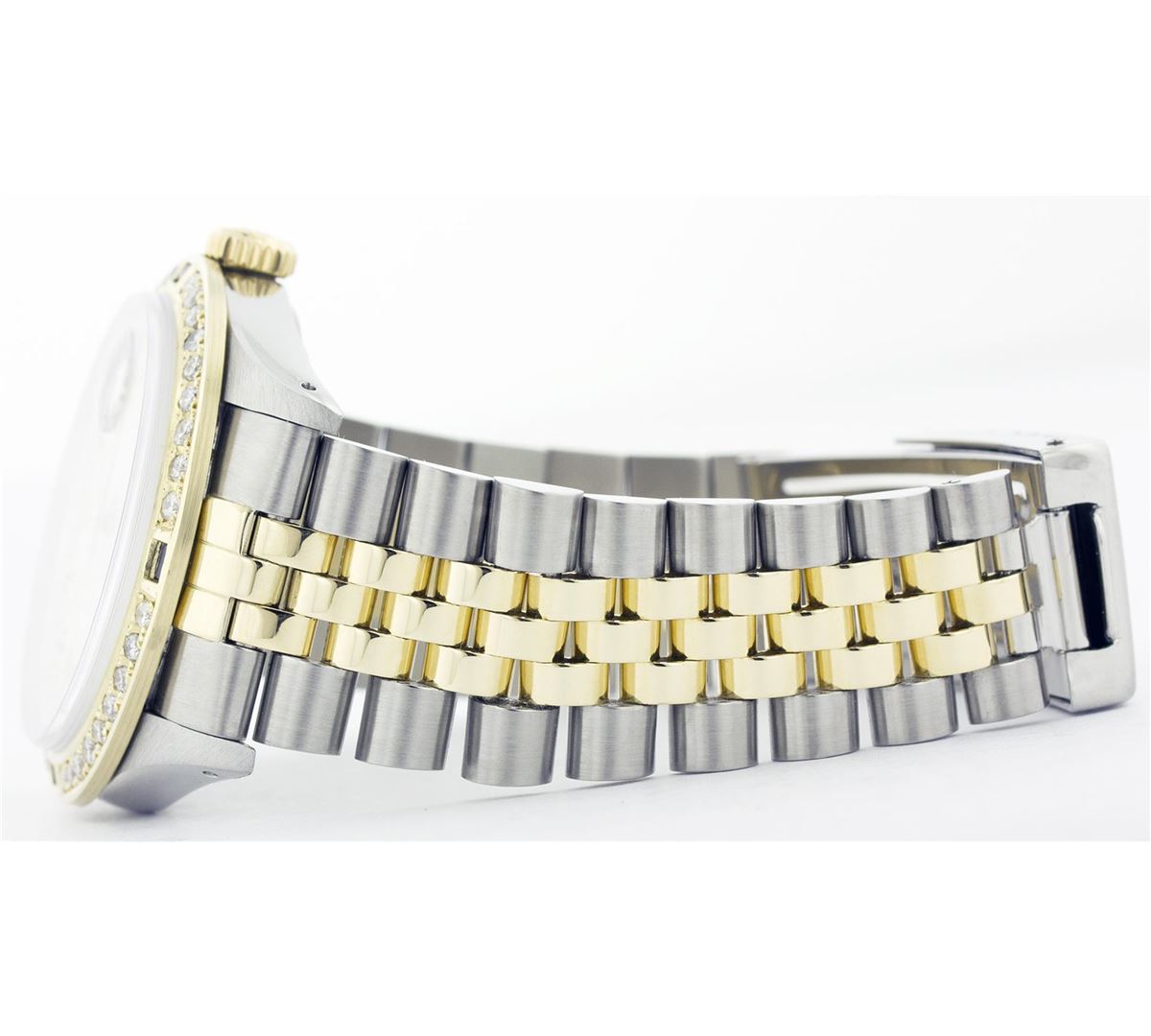 One Mens Two Tone Rolex Datejust Polished, Serviced & Electronically Tested, 14K Yellow Gold & Stainless Steel Case:36mm, 14K Yellow Gold Crown, Custom Bezel: 18K Yellow Gold Sapphire Beadset Diamond Bezel, Diamond Count: 36 Diamonds + 4 Sapphires Total Weight 1.00 Carat, Clarity: Si-VS, Color: G to H. Custom Crystal: Synthetic Sapphire Cyclops Lens. Movement: Automatic Winding Movement Caliber 3035. Custom Dial: Mother Of Pearl Sapphire String Diamond Dial , Diamond + Gem Count: 10 Sapphires + 48 Diamonds in Dial G To H In Color, SI-VS Clarity. Date Window: 3 O'Clock Position Date Display, Quickset, Model: 16013 Condition: G-6 Extra Fine. Bracelet: Two Tone 14K Yellow Gold & Stainless Steel Jubilee. Bright Polish. 6.5 Inch Length, Adjustable. Standard Clasp, With Rolex Logo.