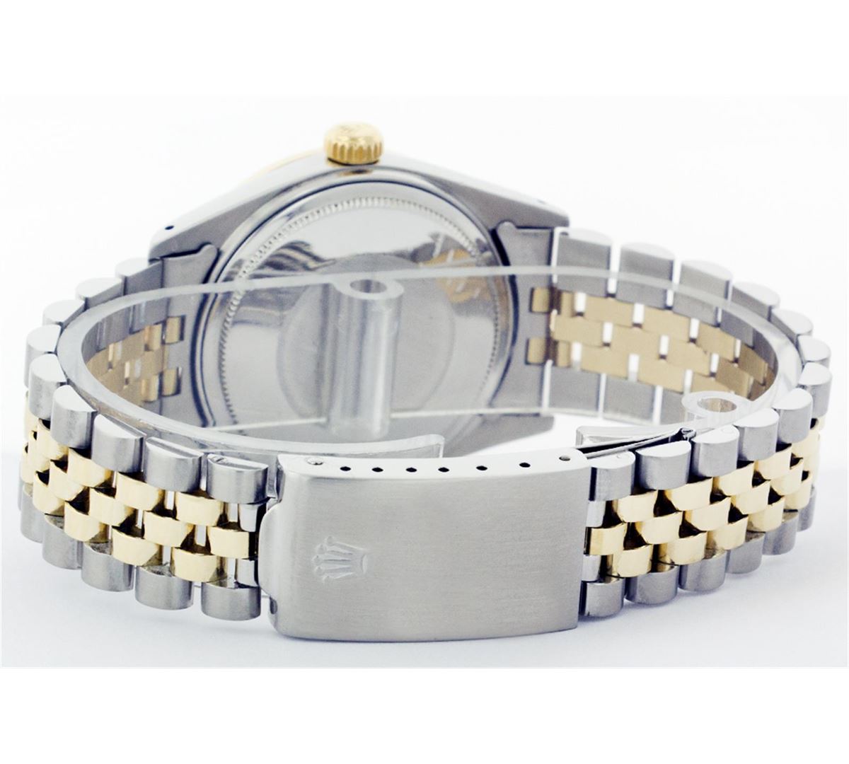 One Mens Two Tone Rolex Datejust Polished, Serviced & Electronically Tested, 14K Yellow Gold & Stainless Steel Case:36mm, 14K Yellow Gold Crown, Custom Bezel: 18K Yellow Gold Sapphire Beadset Diamond Bezel, Diamond Count: 36 Diamonds + 4 Sapphires Total Weight 1.00 Carat, Clarity: Si-VS, Color: G to H. Custom Crystal: Synthetic Sapphire Cyclops Lens. Movement: Automatic Winding Movement Caliber 3035. Custom Dial: Blue Vignette With Diamond Hour Markers. Diamond Count: 10 Diamonds Clarity: SI-VS, Color: Color G to H Date Window: 3 O'Clock Position Date Display, Quickset, Model: 16013 Condition: G-6 Extra Fine. Bracelet: Two Tone 14K Yellow Gold & Stainless Steel Jubilee. Bright Polish. 6.5 Inch Length, Adjustable. Standard Clasp, With Rolex Logo.
