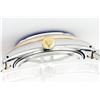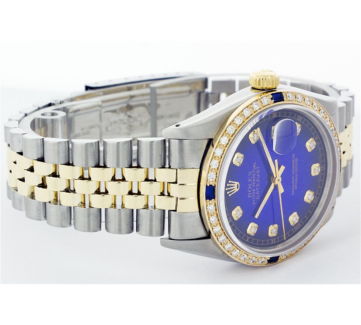 One Mens Two Tone Rolex Datejust Polished, Serviced & Electronically Tested, 14K Yellow Gold & Stainless Steel Case:36mm, 14K Yellow Gold Crown, Custom Bezel: 18K Yellow Gold Sapphire Beadset Diamond Bezel, Diamond Count: 36 Diamonds + 4 Sapphires Total Weight 1.00 Carat, Clarity: Si-VS, Color: G to H. Custom Crystal: Synthetic Sapphire Cyclops Lens. Movement: Automatic Winding Movement Caliber 3035. Custom Dial: Blue Vignette With Diamond Hour Markers. Diamond Count: 10 Diamonds Clarity: SI-VS, Color: Color G to H Date Window: 3 O'Clock Position Date Display, Quickset, Model: 16013 Condition: G-6 Extra Fine. Bracelet: Two Tone 14K Yellow Gold & Stainless Steel Jubilee. Bright Polish. 6.5 Inch Length, Adjustable. Standard Clasp, With Rolex Logo.