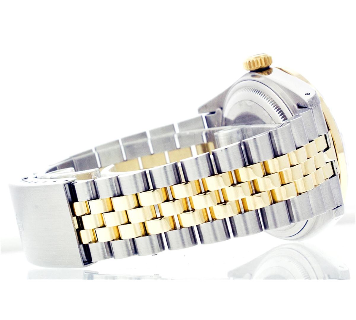 One Mens Two Tone Rolex Datejust Polished, Serviced & Electronically Tested, 14K Yellow Gold & Stainless Steel Case:36mm, 14K Yellow Gold Crown, Custom Bezel: 18K Yellow Gold Sapphire Beadset Diamond Bezel, Diamond Count: 36 Diamonds + 4 Sapphires Total Weight 1.00 Carat, Clarity: Si-VS, Color: G to H. Custom Crystal: Synthetic Sapphire Cyclops Lens. Movement: Automatic Winding Movement Caliber 3035. Custom Dial: Blue Dial Set With Diamond Hour Markers, 10 Diamonds in Dial G To H In Color, Si-VS Clarity, Date Window: 3 O'Clock Position Date Display, Quickset, Model: 16013 Condition: G-6 Extra Fine. Bracelet: Two Tone 14K Yellow Gold & Stainless Steel Jubilee. Bright Polish. 6.5 Inch Length, Adjustable. Standard Clasp, With Rolex Logo.