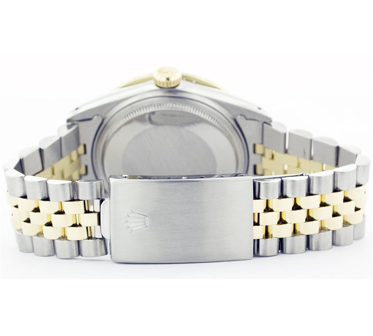 One Mens Two Tone Rolex Datejust Polished, Serviced & Electronically Tested, 14K Yellow Gold & Stainless Steel Case:36mm, 14K Yellow Gold Crown, Custom Bezel: 18K Yellow Gold Sapphire Beadset Diamond Bezel, Diamond Count: 36 Diamonds + 4 Sapphires Total Weight 1.00 Carat, Clarity: Si-VS, Color: G to H. Custom Crystal: Synthetic Sapphire Cyclops Lens. Movement: Automatic Winding Movement Caliber 3035. Custom Dial: Mother Of Pearl Sapphire String Diamond Dial , Diamond + Gem Count: 10 Sapphires + 48 Diamonds in Dial G To H In Color, SI-VS Clarity. Date Window: 3 O'Clock Position Date Display, Quickset, Model: 16013 Condition: G-6 Extra Fine. Bracelet: Two Tone 14K Yellow Gold & Stainless Steel Jubilee. Bright Polish. 6.5 Inch Length, Adjustable. Standard Clasp, With Rolex Logo.