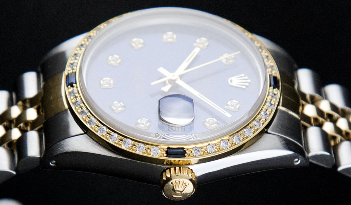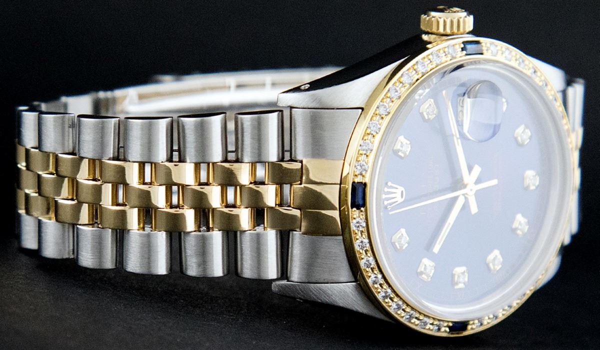 One Mens Two Tone Rolex Datejust Polished, Serviced & Electronically Tested, 14K Yellow Gold & Stainless Steel Case:36mm, 14K Yellow Gold Crown, Custom Bezel: 18K Yellow Gold Sapphire Beadset Diamond Bezel, Diamond Count: 36 Diamonds + 4 Sapphires Total Weight 1.00 Carat, Clarity: Si-VS, Color: G to H. Custom Crystal: Synthetic Sapphire Cyclops Lens. Movement: Automatic Winding Movement Caliber 3035. Custom Dial: Blue Dial Set With Diamond Hour Markers, 10 Diamonds in Dial G To H In Color, Si-VS Clarity, Date Window: 3 O'Clock Position Date Display, Quickset, Model: 16013 Condition: G-6 Extra Fine. Bracelet: Two Tone 14K Yellow Gold & Stainless Steel Jubilee. Bright Polish. 6.5 Inch Length, Adjustable. Standard Clasp, With Rolex Logo.