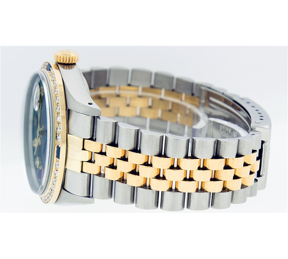 One Mens Rolex Datejust Polished Bright with Satin Finish, Serviced & Electronically Tested, Stainless Steel Case:36mm, Stainless Steel Crown, Custom Bezel: 18K Yellow Gold Sapphire Beadset Diamond Bezel, Diamond + Gem Count:36 Diamonds + 4 Sapphires, Total Weight 1.00 Carat, Clarity: SI-VS, Color: G to H. Custom Crystal: Synthetic Sapphire Cyclops Lens. Movement: Automatic Winding Movement Caliber 3035. Custom Dial: Brown Diamond With Sapphires, Diamond Count: 8 Diamond + 2 Sapphire Baguettes in Dial, Dial Color: G To H In Color, Clarity: SI-VS. Date Window: 3 O'Clock Position Date Display, Quickset, Model: 16013 Condition: G-6 Extra Fine. Bracelet: 14K Yellow Gold And Stainless Steel Jubilee. Bright Polish & Satin Finish. 7.0 Inch Length, Adjustable. Standard Clasp, With Rolex Logo. Comes with 6 month warranty.