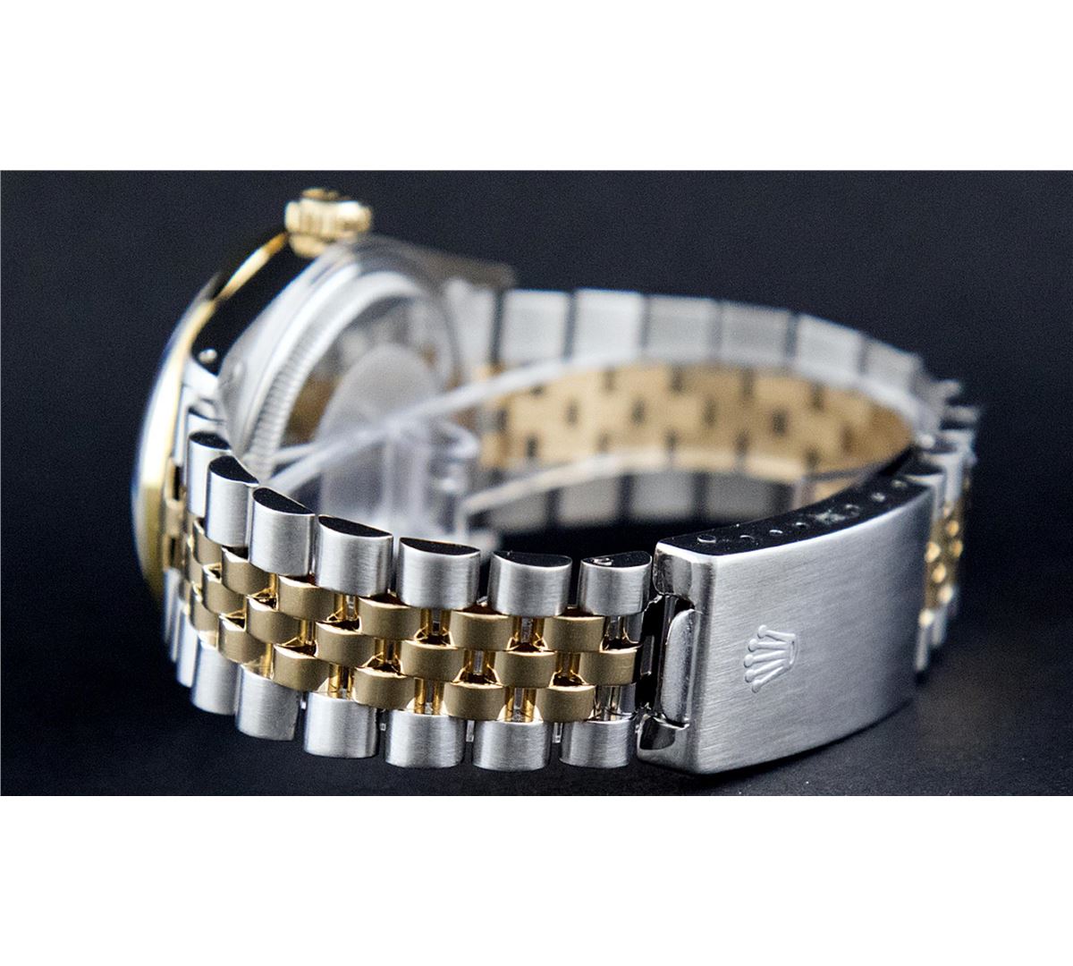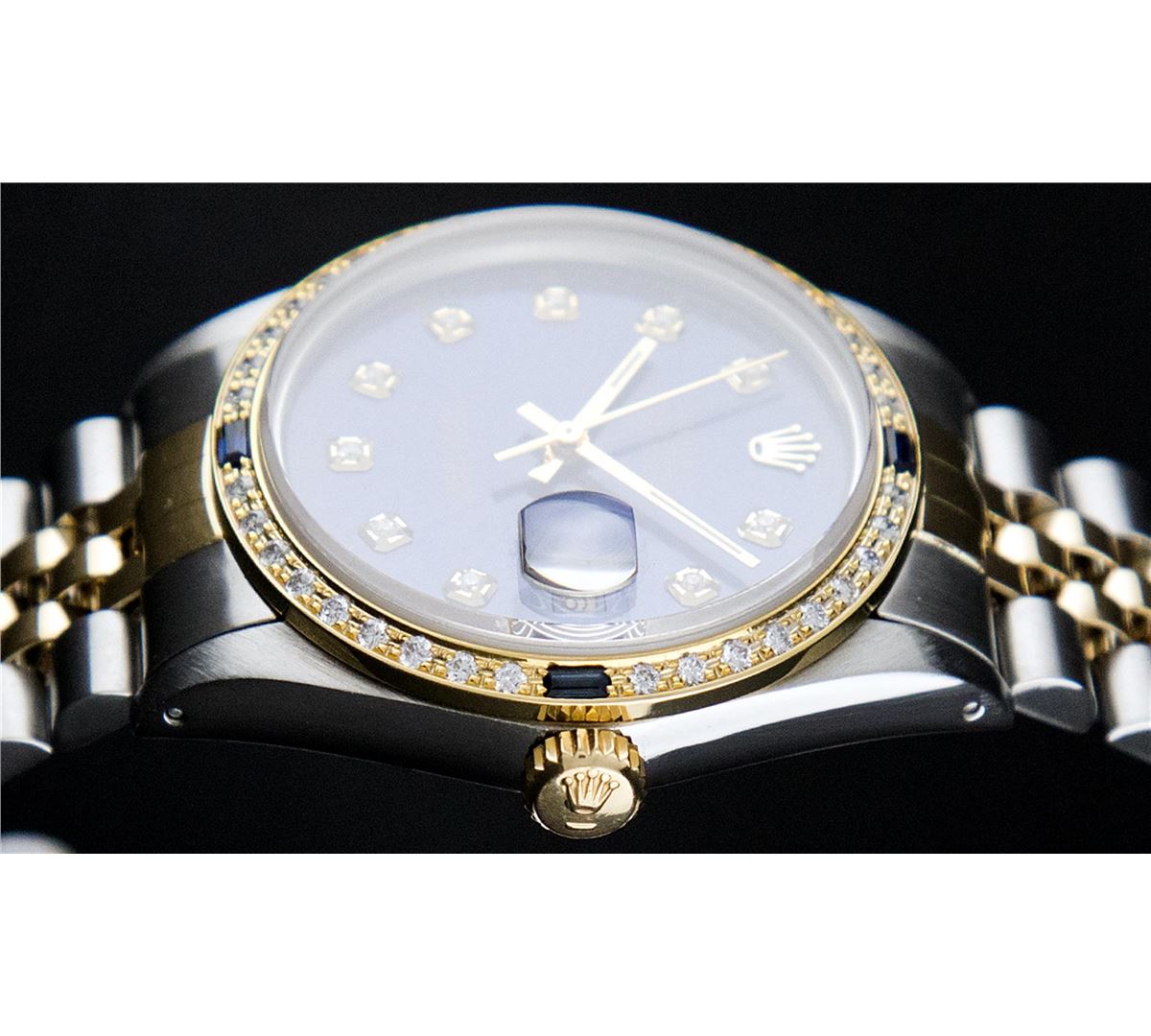 One Mens Two Tone Rolex Datejust Polished, Serviced & Electronically Tested, 14K Yellow Gold & Stainless Steel Case:36mm, 14K Yellow Gold Crown, Custom Bezel: 18K Yellow Gold Sapphire Beadset Diamond Bezel, Diamond Count: 36 Diamonds + 4 Sapphires Total Weight 1.00 Carat, Clarity: Si-VS, Color: G to H. Custom Crystal: Synthetic Sapphire Cyclops Lens. Movement: Automatic Winding Movement Caliber 3035. Custom Dial: Blue Dial Set With Diamond Hour Markers, 10 Diamonds in Dial G To H In Color, Si-VS Clarity, Date Window: 3 O'Clock Position Date Display, Quickset, Model: 16013 Condition: G-6 Extra Fine. Bracelet: Two Tone 14K Yellow Gold & Stainless Steel Jubilee. Bright Polish. 6.5 Inch Length, Adjustable. Standard Clasp, With Rolex Logo.