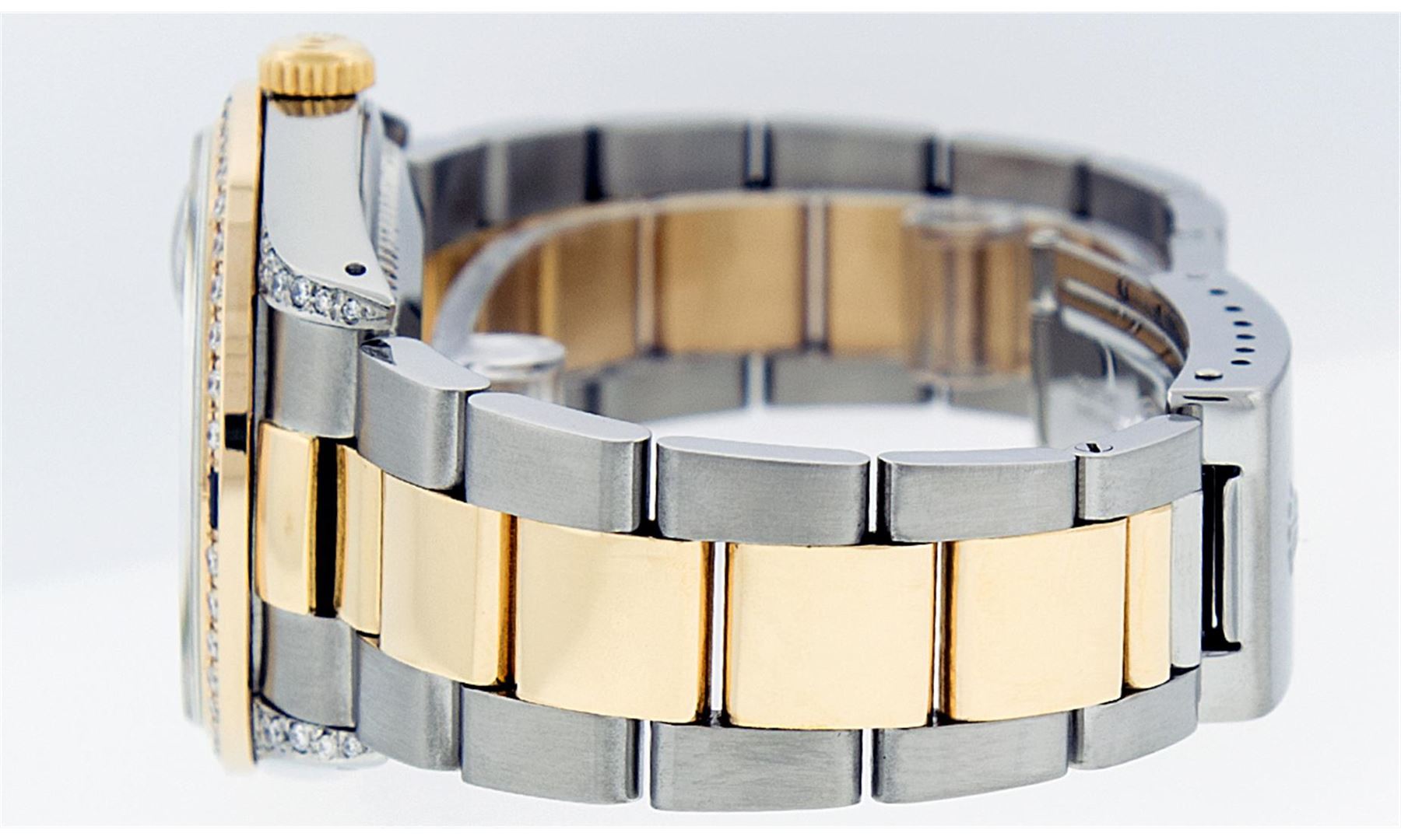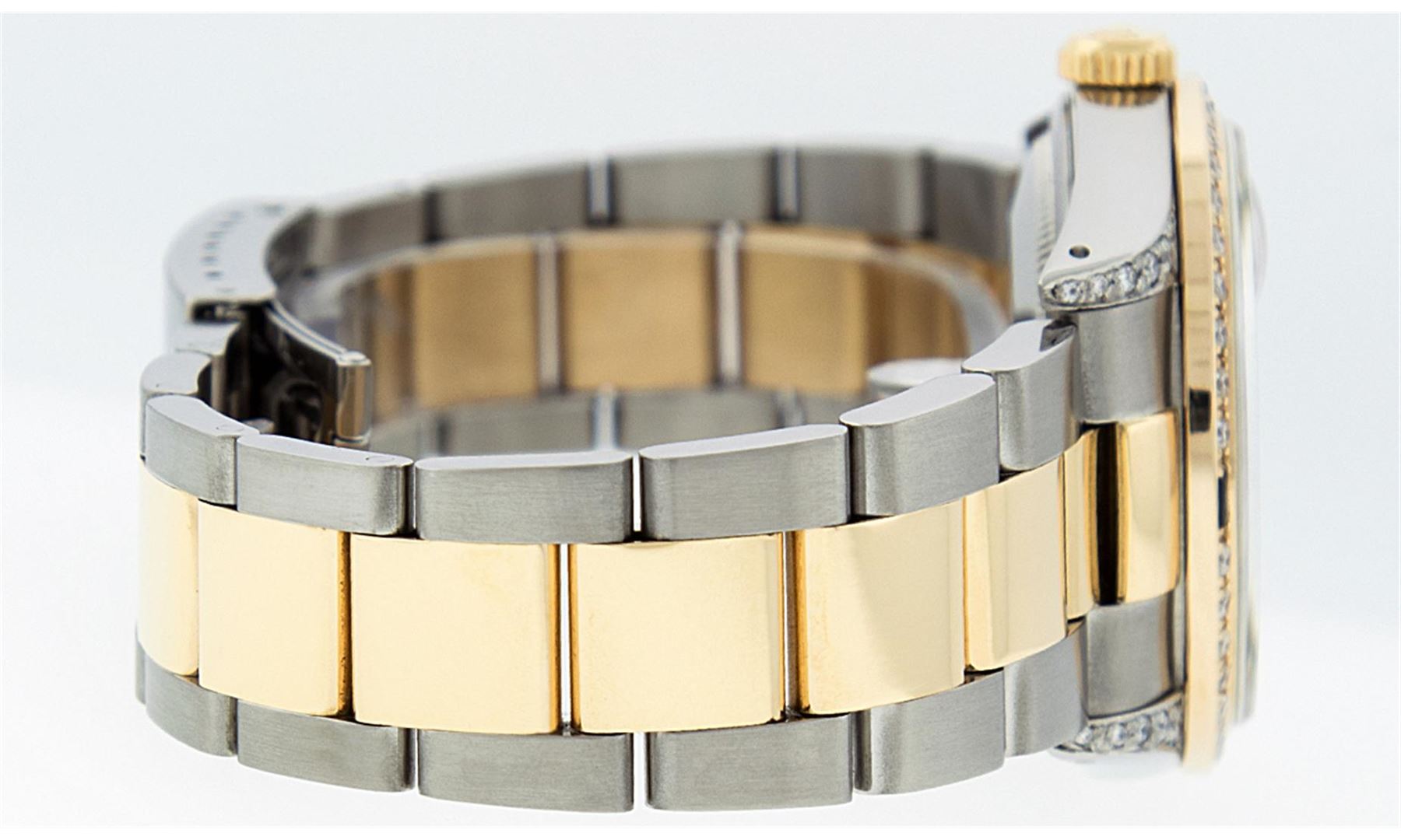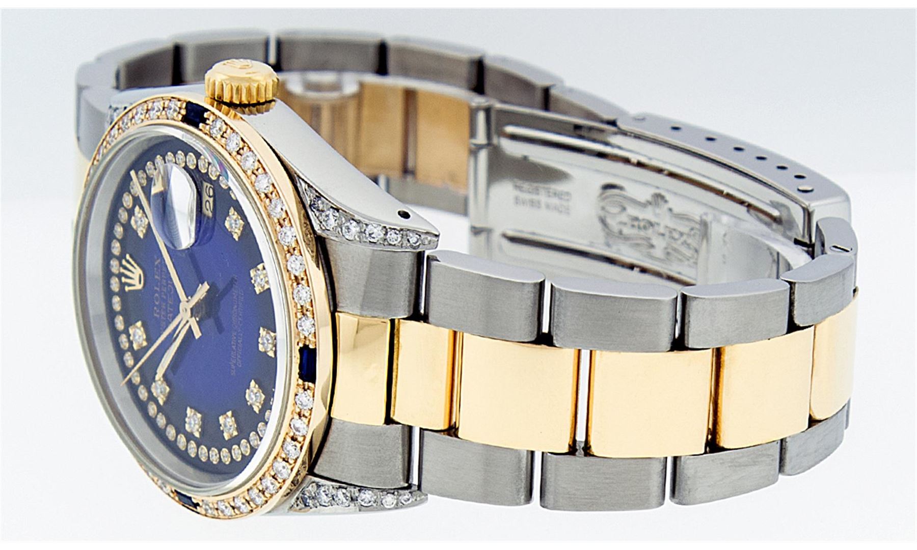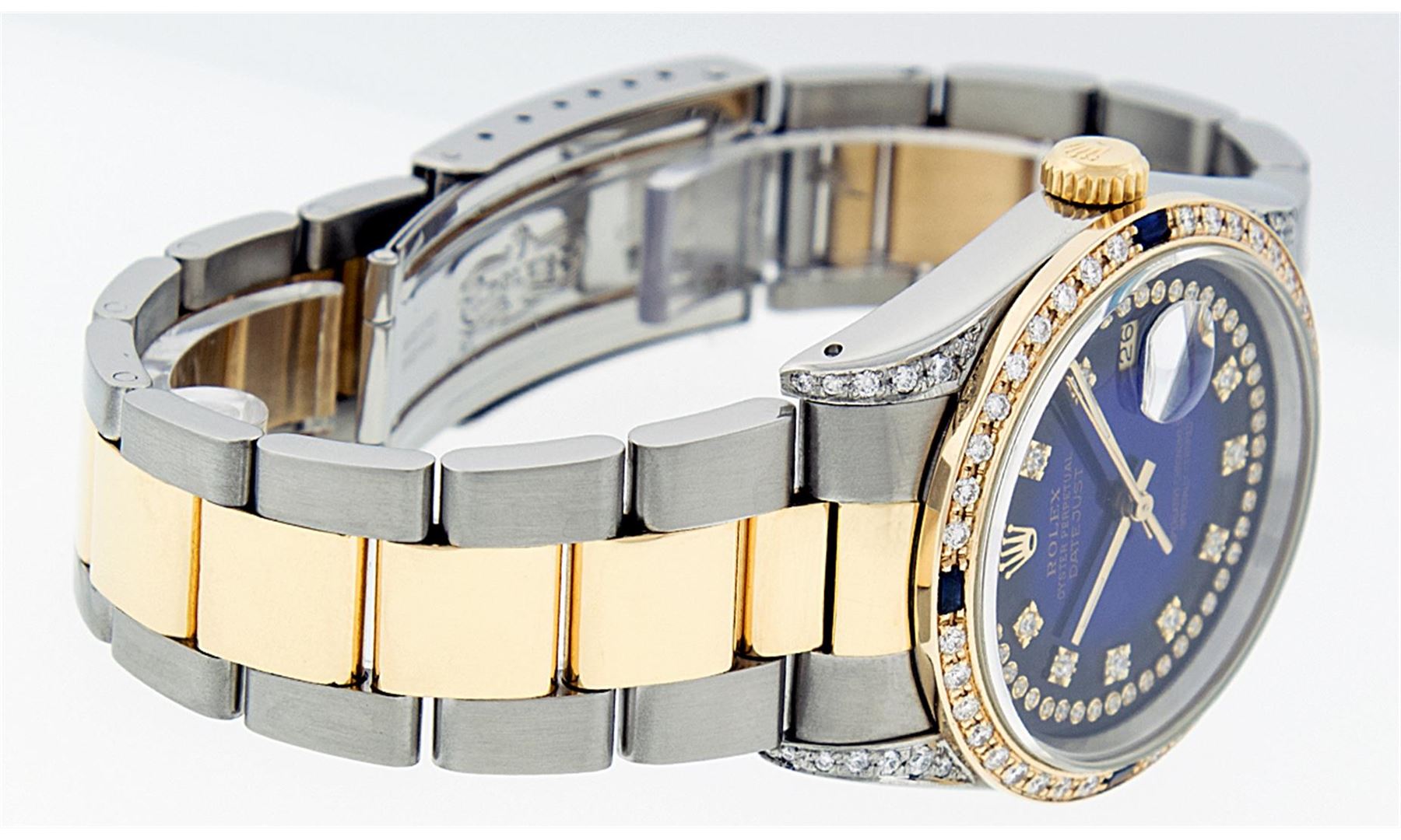 One Gents 18K Yellow Gold Two Tone Rolex Datejust Polished, Serviced & Electronically Tested, 18K Yellow Gold & Stainless Steel Case:36mm, Diamond Lugs On Case, Diamond Count: 16 Diamonds On Lugs, Color: G To H, Clarity: VVS. 18K Yellow Gold Crown, Custom Bezel: 18K Yellow Gold Sapphire Beadset Diamond Bezel, Diamond Count: 36 Diamonds + 4 Sapphires. Total Weight 1.00 Carat, Clarity: Si-VS, Color: G to H. Custom Crystal: Synthetic Sapphire Cyclops Lens. Movement: Automatic Winding Movement Caliber 3135. Custom Dial: Blue Vignette String Diamond Dial VVS, Diamond Count: 58 Diamonds In Dial, Color: G To H, Clarity: VVS, Date Window: 3 O'Clock Position Date Display, Quickset, Model: 16233 Condition: G-6 Extra Fine The Watch Is In Very Good Condition Free Of All Scratches And Dents. Bracelet: Two Tone 18K Yellow Gold & Stainless Steel Oyster Band. Bright Polish. 7.0 Inch Length, Adjustable. Standard Clasp, With Rolex Logo. Comes with 6 month warranty.
