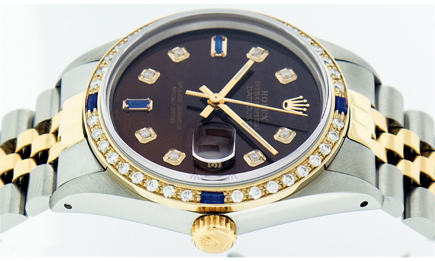 One Mens Rolex Datejust Polished Bright with Satin Finish, Serviced & Electronically Tested, Stainless Steel Case:36mm, Stainless Steel Crown, Custom Bezel: 18K Yellow Gold Sapphire Beadset Diamond Bezel, Diamond + Gem Count:36 Diamonds + 4 Sapphires, Total Weight 1.00 Carat, Clarity: SI-VS, Color: G to H. Custom Crystal: Synthetic Sapphire Cyclops Lens. Movement: Automatic Winding Movement Caliber 3035. Custom Dial: Brown Diamond With Sapphires, Diamond Count: 8 Diamond + 2 Sapphire Baguettes in Dial, Dial Color: G To H In Color, Clarity: SI-VS. Date Window: 3 O'Clock Position Date Display, Quickset, Model: 16013 Condition: G-6 Extra Fine. Bracelet: 14K Yellow Gold And Stainless Steel Jubilee. Bright Polish & Satin Finish. 7.0 Inch Length, Adjustable. Standard Clasp, With Rolex Logo. Comes with 6 month warranty.