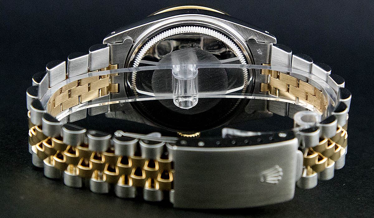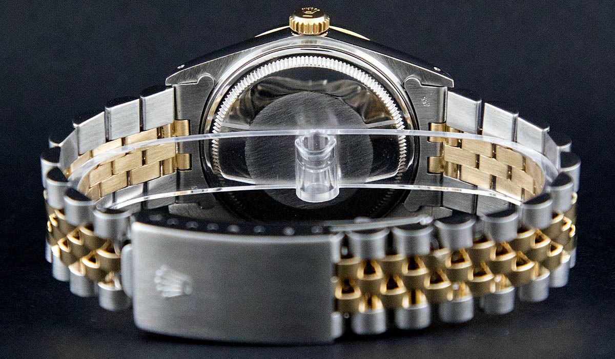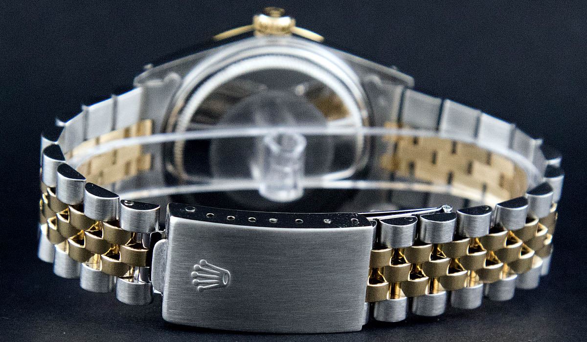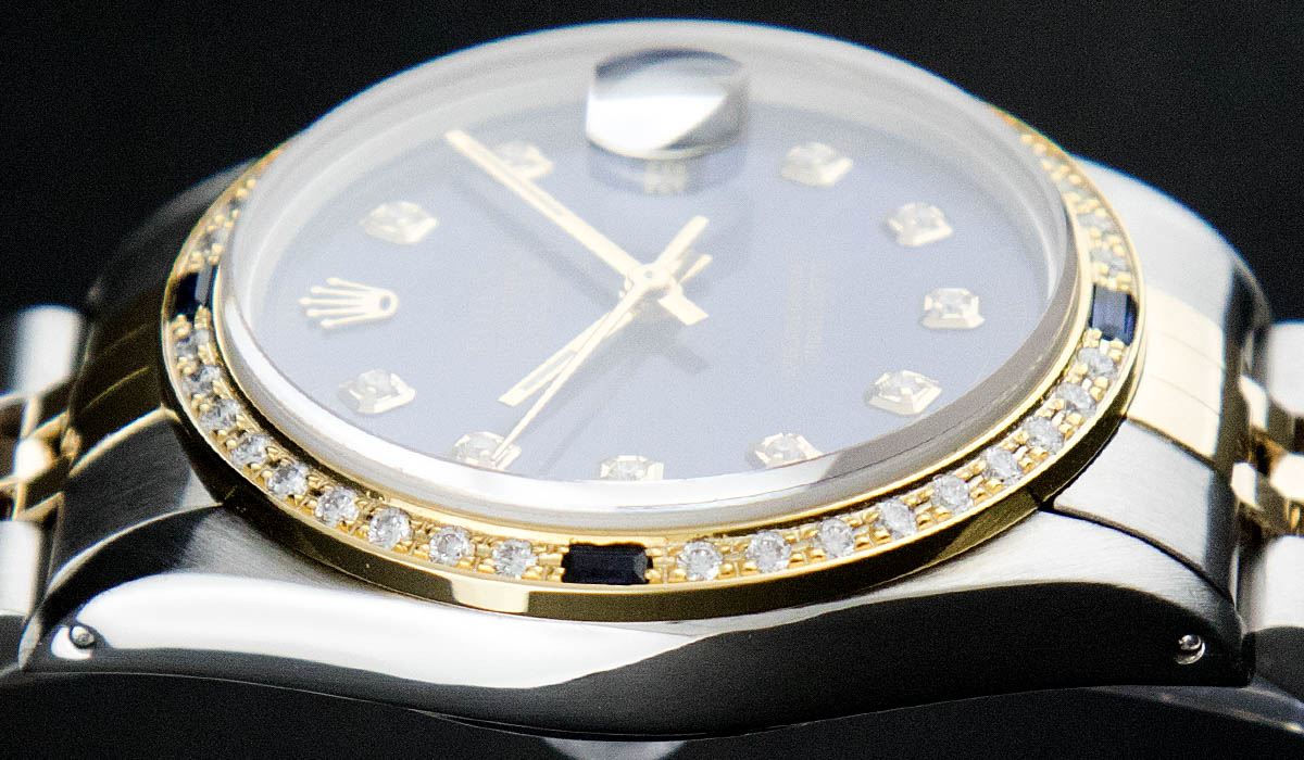 One Mens Two Tone Rolex Datejust Polished, Serviced & Electronically Tested, 14K Yellow Gold & Stainless Steel Case:36mm, 14K Yellow Gold Crown, Custom Bezel: 18K Yellow Gold Sapphire Beadset Diamond Bezel, Diamond Count: 36 Diamonds + 4 Sapphires Total Weight 1.00 Carat, Clarity: Si-VS, Color: G to H. Custom Crystal: Synthetic Sapphire Cyclops Lens. Movement: Automatic Winding Movement Caliber 3035. Custom Dial: Blue Dial Set With Diamond Hour Markers, 10 Diamonds in Dial G To H In Color, Si-VS Clarity, Date Window: 3 O'Clock Position Date Display, Quickset, Model: 16013 Condition: G-6 Extra Fine. Bracelet: Two Tone 14K Yellow Gold & Stainless Steel Jubilee. Bright Polish. 6.5 Inch Length, Adjustable. Standard Clasp, With Rolex Logo.