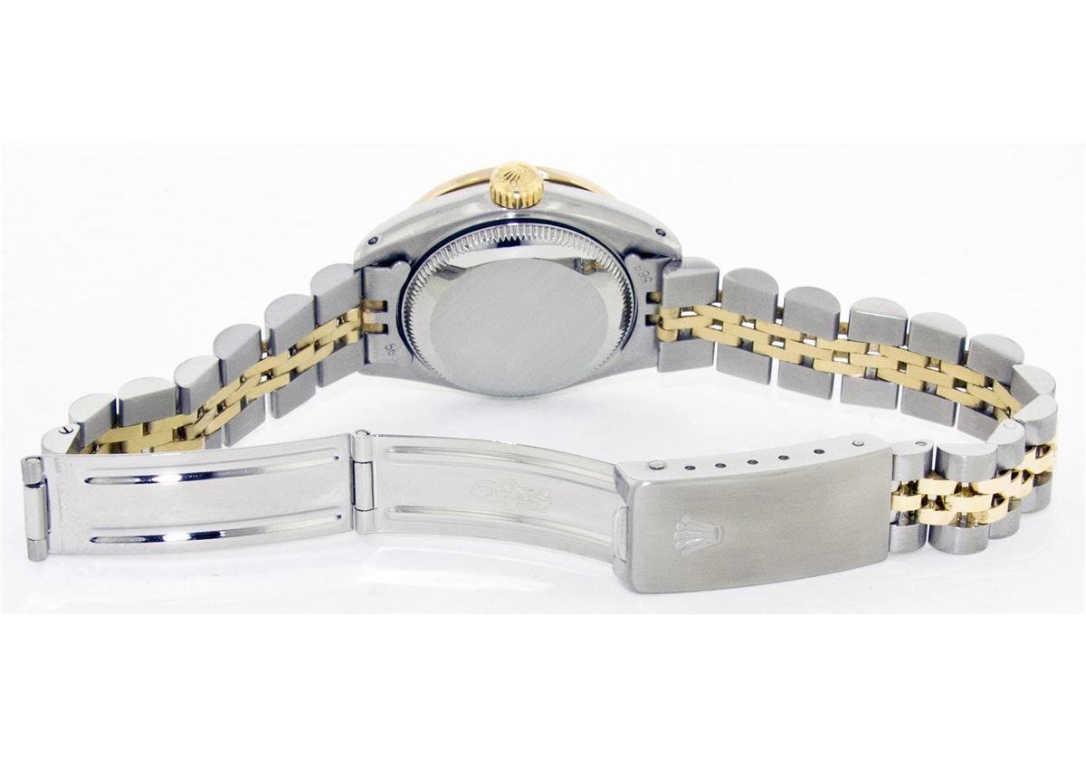 One Ladies Two Tone Rolex Datejust Polished, Serviced & Electronically Tested, 14K Yellow Gold & Stainless Steel Case:26mm, 14K Yellow Gold Crown, Custom Bezel: 18K Yellow Gold Emerald Beadset Diamond Bezel, Diamond Count: 26 Diamonds + 4 Emeralds Total Weight .70 Carat, Clarity: Si-VS, Color: G to H. Custom Crystal: Synthetic Sapphire Cyclops Lens. Movement: Automatic Winding Movement Caliber 2030. Custom Dial: Green String Diamond Dial, Diamond Count: 43 Diamonds, Clarity: SI-VS, Color: G to H. Date Window: 3 O'Clock Position Date Display, Non Quickset, Model: 6917 Condition: G-6 Extra Fine. Bracelet: Two Tone 14K Yellow Gold & Stainless Steel Jubilee. Bright Polish. 5.5 Inch Length, Adjustable. Standard Clasp, With Rolex Logo.