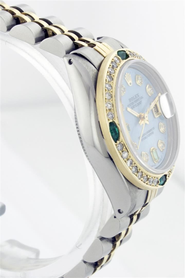 One Ladies Two Tone Rolex Datejust Polished, Serviced & Electronically Tested, 14K Yellow Gold & Stainless Steel Case:26mm, 14K Yellow Gold Crown, Custom Bezel: 18K Yellow Gold Emerald Beadset Diamond Bezel, Diamond Count: 28 Diamonds + 4 Emeralds, Total Weight .70 Carat, Clarity: Si-VS, Color: G to H. Custom Crystal: Synthetic Sapphire Cyclops Lens. Movement: Automatic Winding Movement Caliber 2030. Custom Dial: Blue Mother Of Pearl Emerald + Diamond Dial, Diamond Count: 8 Diamonds + 2 Emeralds , Clarity: SI-VS, Color: G to H. Date Window: 3 O'Clock Position Date Display, Non Quickset, Model: 6917 Condition: G-6 Extra Fine. Bracelet: Two Tone 14K Yellow Gold & Stainless Steel Jubilee. Bright Polish. 5.5 Inch Length, Adjustable. Standard Clasp, With Rolex Logo.