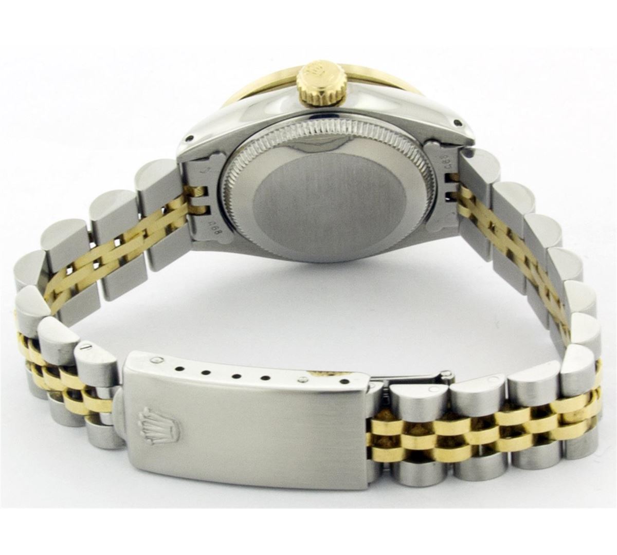 One Ladies Two Tone Rolex Datejust Polished, Serviced & Electronically Tested, 14K Yellow Gold & Stainless Steel Case:26mm, 14K Yellow Gold Crown, Custom Bezel: 18K Yellow Gold Emerald Beadset Diamond Bezel, Diamond Count: 28 Diamonds + 4 Emeralds, Total Weight .70 Carat, Clarity: Si-VS, Color: G to H. Custom Crystal: Synthetic Sapphire Cyclops Lens. Movement: Automatic Winding Movement Caliber 2030. Custom Dial: Blue Mother Of Pearl Emerald + Diamond Dial, Diamond Count: 8 Diamonds + 2 Emeralds , Clarity: SI-VS, Color: G to H. Date Window: 3 O'Clock Position Date Display, Non Quickset, Model: 6917 Condition: G-6 Extra Fine. Bracelet: Two Tone 14K Yellow Gold & Stainless Steel Jubilee. Bright Polish. 5.5 Inch Length, Adjustable. Standard Clasp, With Rolex Logo.