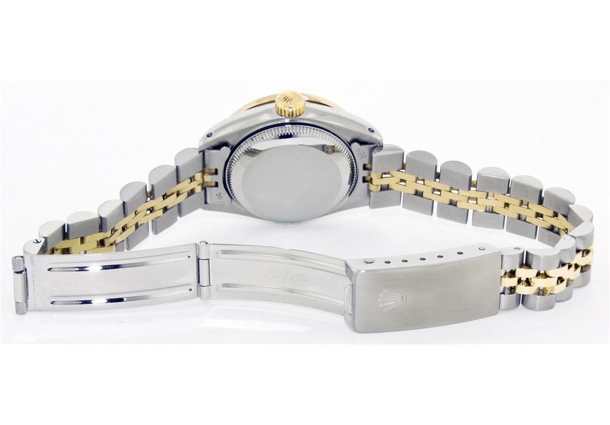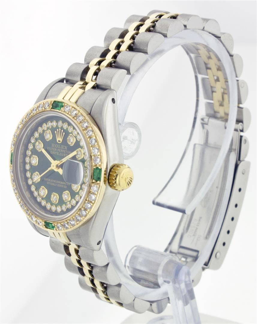 One Ladies Two Tone Rolex Datejust Polished, Serviced & Electronically Tested, 14K Yellow Gold & Stainless Steel Case:26mm, 14K Yellow Gold Crown, Custom Bezel: 18K Yellow Gold Emerald Beadset Diamond Bezel, Diamond Count: 26 Diamonds + 4 Emeralds Total Weight .70 Carat, Clarity: Si-VS, Color: G to H. Custom Crystal: Synthetic Sapphire Cyclops Lens. Movement: Automatic Winding Movement Caliber 2030. Custom Dial: Green Vignette String Diamond Dial, Diamond Count: 43 Diamonds, Clarity: SI-VS, Color: G to H. Date Window: 3 O'Clock Position Date Display, Non Quickset, Model: 6917 Condition: G-6 Extra Fine. Bracelet: Two Tone 14K Yellow Gold & Stainless Steel Jubilee. Bright Polish. 5.5 Inch Length, Adjustable. Standard Clasp, With Rolex Logo.