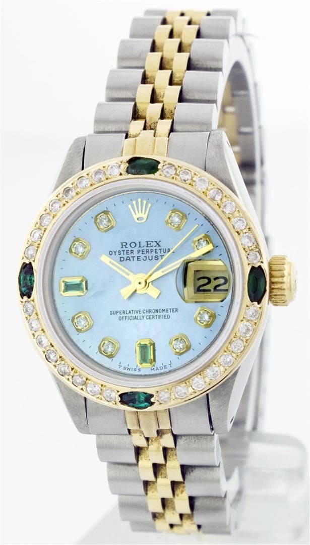 One Ladies Two Tone Rolex Datejust Polished, Serviced & Electronically Tested, 14K Yellow Gold & Stainless Steel Case:26mm, 14K Yellow Gold Crown, Custom Bezel: 18K Yellow Gold Emerald Beadset Diamond Bezel, Diamond Count: 28 Diamonds + 4 Emeralds, Total Weight .70 Carat, Clarity: Si-VS, Color: G to H. Custom Crystal: Synthetic Sapphire Cyclops Lens. Movement: Automatic Winding Movement Caliber 2030. Custom Dial: Blue Mother Of Pearl Emerald + Diamond Dial, Diamond Count: 8 Diamonds + 2 Emeralds , Clarity: SI-VS, Color: G to H. Date Window: 3 O'Clock Position Date Display, Non Quickset, Model: 6917 Condition: G-6 Extra Fine. Bracelet: Two Tone 14K Yellow Gold & Stainless Steel Jubilee. Bright Polish. 5.5 Inch Length, Adjustable. Standard Clasp, With Rolex Logo.