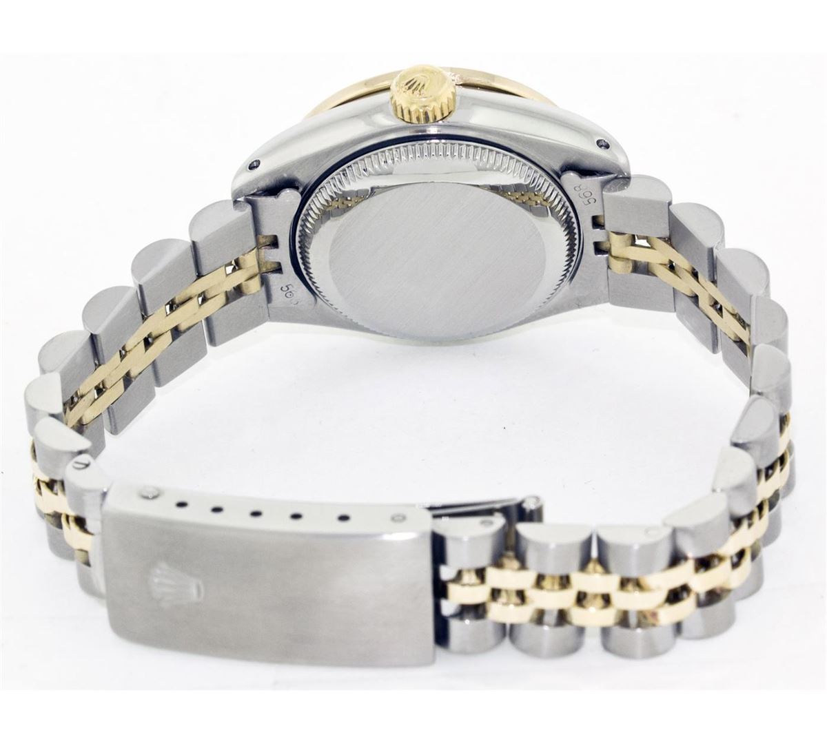 One Ladies Two Tone Rolex Datejust Polished, Serviced & Electronically Tested, 14K Yellow Gold & Stainless Steel Case:26mm, 14K Yellow Gold Crown, Custom Bezel: 18K Yellow Gold Emerald Beadset Diamond Bezel, Diamond Count: 26 Diamonds + 4 Emeralds Total Weight .70 Carat, Clarity: Si-VS, Color: G to H. Custom Crystal: Synthetic Sapphire Cyclops Lens. Movement: Automatic Winding Movement Caliber 2030. Custom Dial: Green Vignette String Diamond Dial, Diamond Count: 43 Diamonds, Clarity: SI-VS, Color: G to H. Date Window: 3 O'Clock Position Date Display, Non Quickset, Model: 6917 Condition: G-6 Extra Fine. Bracelet: Two Tone 14K Yellow Gold & Stainless Steel Jubilee. Bright Polish. 5.5 Inch Length, Adjustable. Standard Clasp, With Rolex Logo.