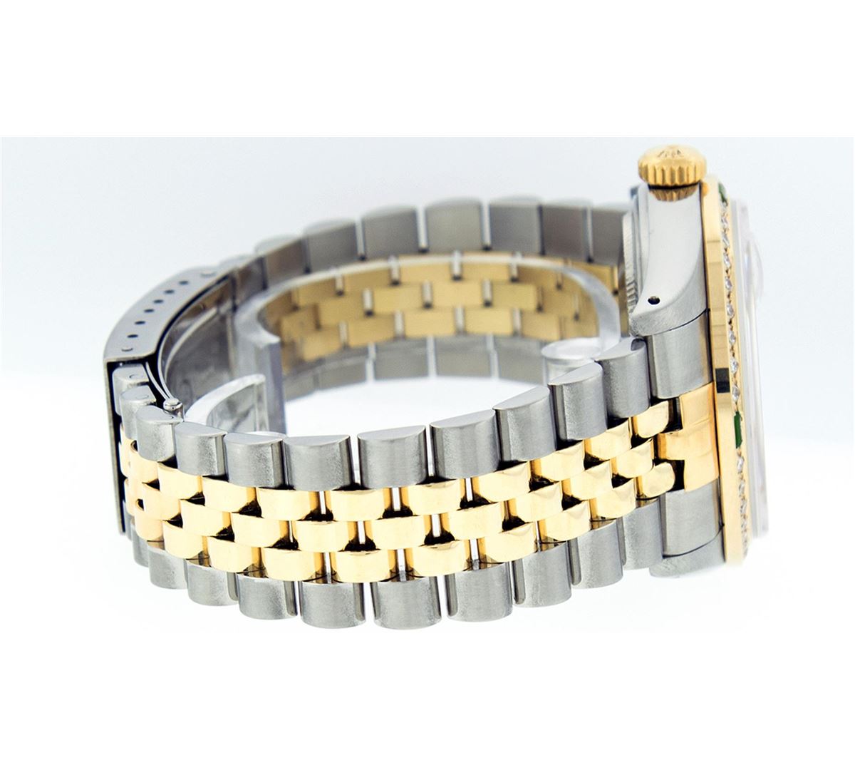 One Mens Two Tone Rolex Datejust Polished, Serviced & Electronically Tested, 14K Yellow Gold & Stainless Steel Case:36mm, 14K Yellow Gold Crown, Custom Bezel: 18K Yellow Gold Emerald Beadset Diamond Bezel, Diamond Count: 36 Diamonds + 4 Emeralds, Total Weight 1.00 Carat, Clarity: Si-VS, Color: G to H. Custom Crystal: Synthetic Sapphire Cyclops Lens. Movement: Automatic Winding Movement Caliber 3035. Custom Dial: Mother Of Pearl Roman Dial. Date Window: 3 O'Clock Position Date Display, Quickset, Model: 16013 Condition: G-6 Extra Fine. Bracelet: Two Tone 14K Yellow Gold & Stainless Steel Jubilee. Bright Polish. 7.0 Inch Length, Adjustable. Standard Clasp, With Rolex Logo. Comes with 6 month warranty.