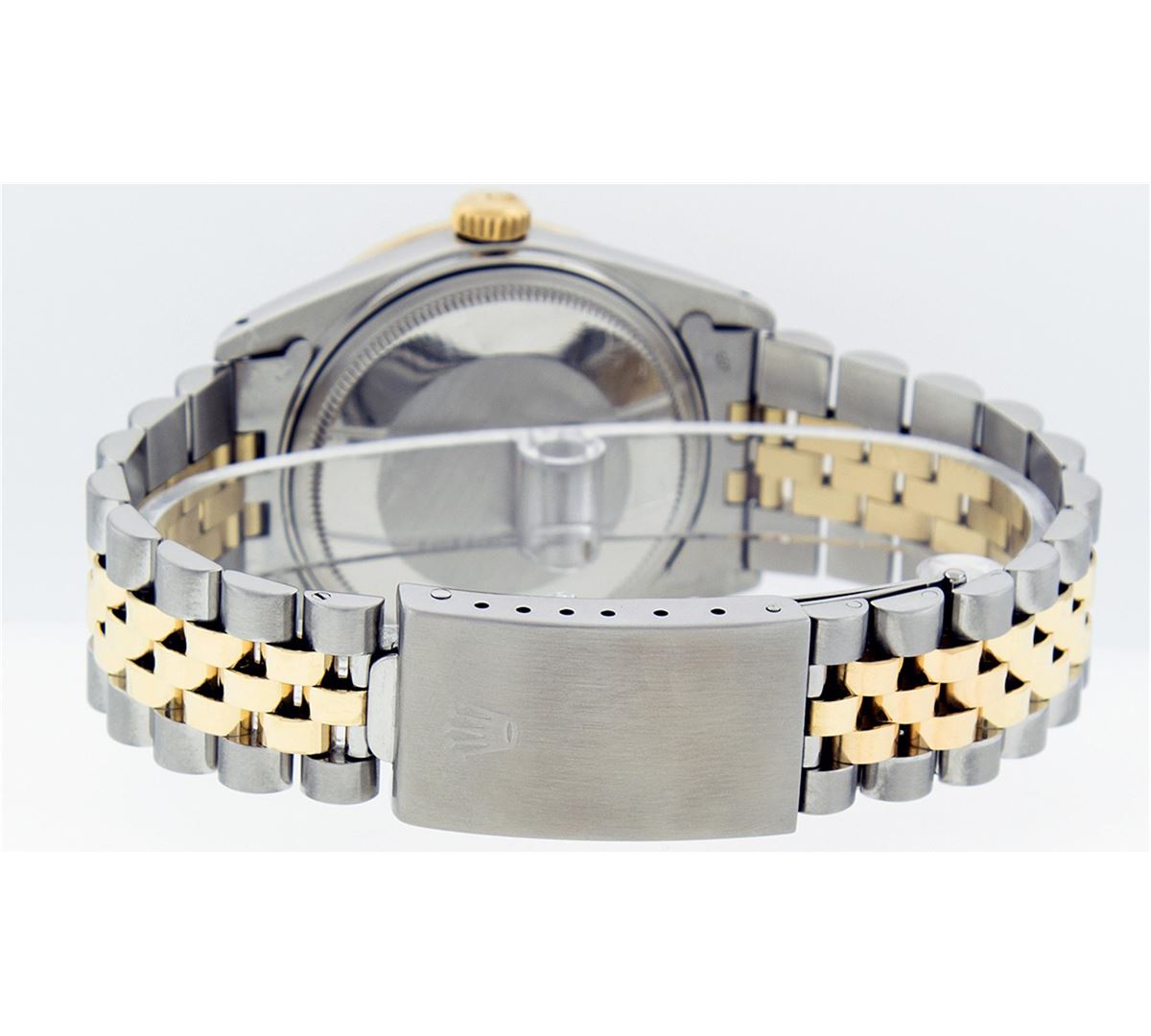One Mens Two Tone Rolex Datejust Polished, Serviced & Electronically Tested, 14K Yellow Gold & Stainless Steel Case:36mm, 14K Yellow Gold Crown, Custom Bezel: 18K Yellow Gold Emerald Beadset Diamond Bezel, Diamond Count: 36 Diamonds + 4 Emeralds, Total Weight 1.00 Carat, Clarity: Si-VS, Color: G to H. Custom Crystal: Synthetic Sapphire Cyclops Lens. Movement: Automatic Winding Movement Caliber 3035. Custom Dial: Mother Of Pearl Roman Dial. Date Window: 3 O'Clock Position Date Display, Quickset, Model: 16013 Condition: G-6 Extra Fine. Bracelet: Two Tone 14K Yellow Gold & Stainless Steel Jubilee. Bright Polish. 7.0 Inch Length, Adjustable. Standard Clasp, With Rolex Logo. Comes with 6 month warranty.