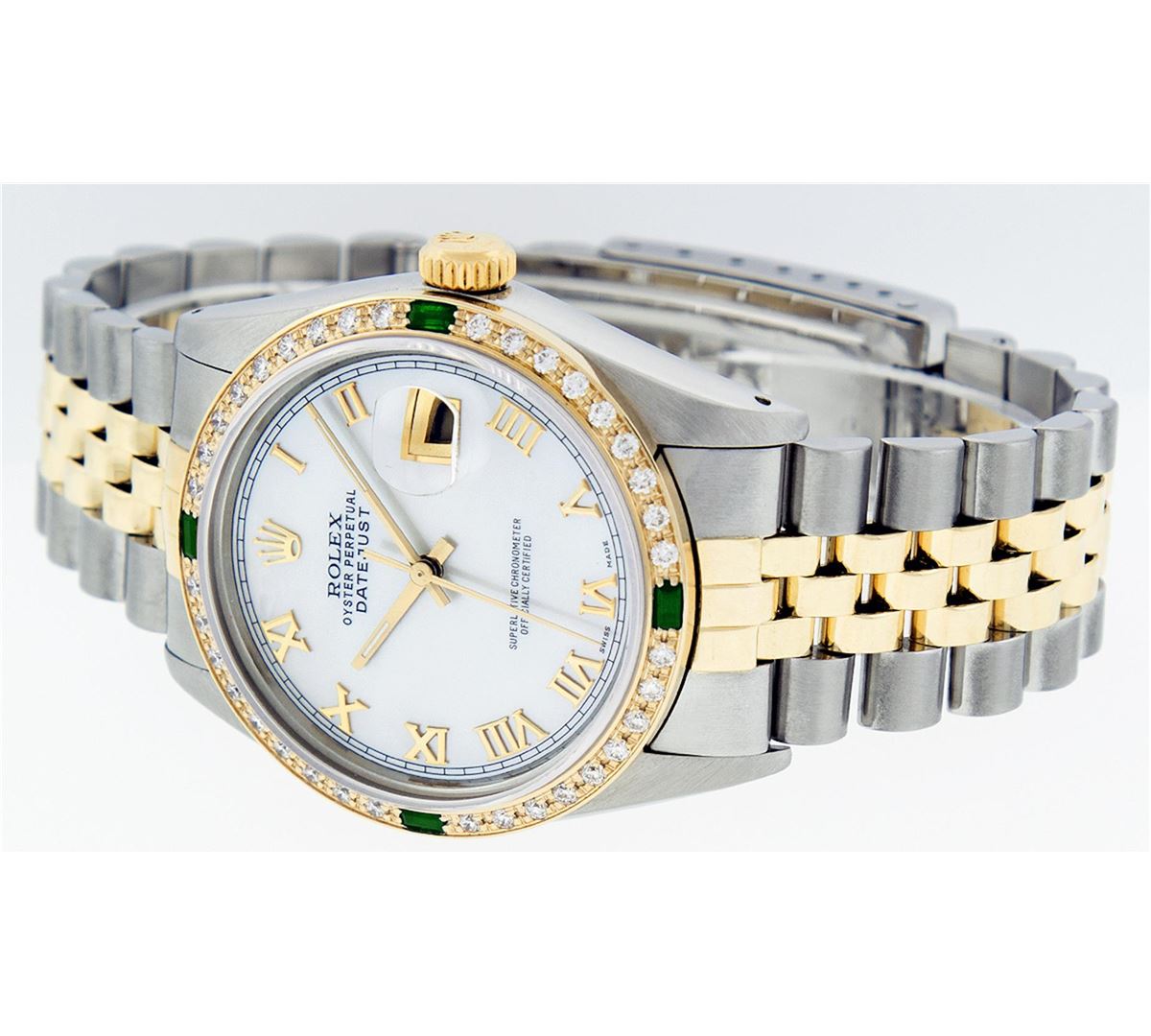 One Mens Two Tone Rolex Datejust Polished, Serviced & Electronically Tested, 14K Yellow Gold & Stainless Steel Case:36mm, 14K Yellow Gold Crown, Custom Bezel: 18K Yellow Gold Emerald Beadset Diamond Bezel, Diamond Count: 36 Diamonds + 4 Emeralds, Total Weight 1.00 Carat, Clarity: Si-VS, Color: G to H. Custom Crystal: Synthetic Sapphire Cyclops Lens. Movement: Automatic Winding Movement Caliber 3035. Custom Dial: Mother Of Pearl Roman Dial. Date Window: 3 O'Clock Position Date Display, Quickset, Model: 16013 Condition: G-6 Extra Fine. Bracelet: Two Tone 14K Yellow Gold & Stainless Steel Jubilee. Bright Polish. 7.0 Inch Length, Adjustable. Standard Clasp, With Rolex Logo. Comes with 6 month warranty.