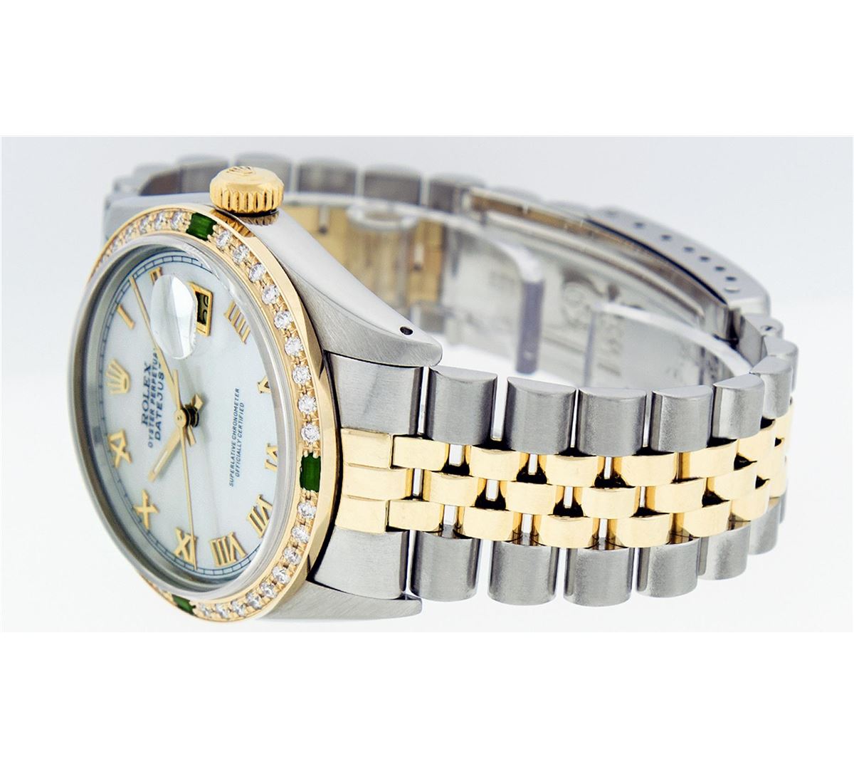 One Mens Two Tone Rolex Datejust Polished, Serviced & Electronically Tested, 14K Yellow Gold & Stainless Steel Case:36mm, 14K Yellow Gold Crown, Custom Bezel: 18K Yellow Gold Emerald Beadset Diamond Bezel, Diamond Count: 36 Diamonds + 4 Emeralds, Total Weight 1.00 Carat, Clarity: Si-VS, Color: G to H. Custom Crystal: Synthetic Sapphire Cyclops Lens. Movement: Automatic Winding Movement Caliber 3035. Custom Dial: Mother Of Pearl Roman Dial. Date Window: 3 O'Clock Position Date Display, Quickset, Model: 16013 Condition: G-6 Extra Fine. Bracelet: Two Tone 14K Yellow Gold & Stainless Steel Jubilee. Bright Polish. 7.0 Inch Length, Adjustable. Standard Clasp, With Rolex Logo. Comes with 6 month warranty.
