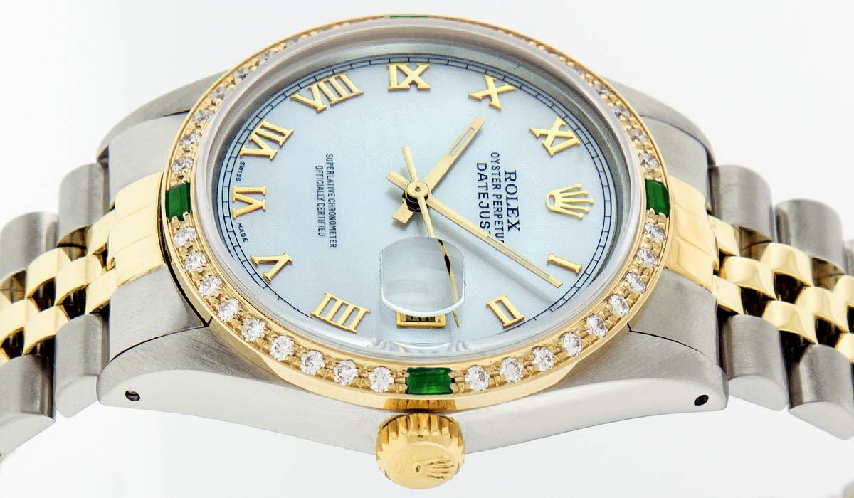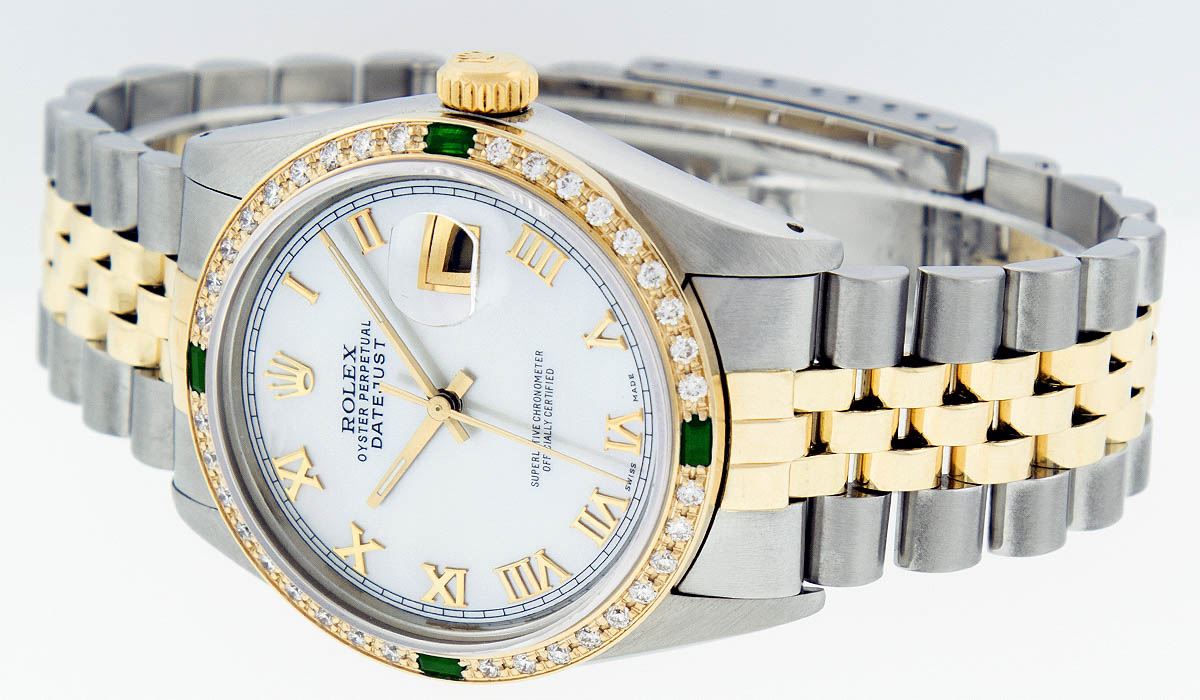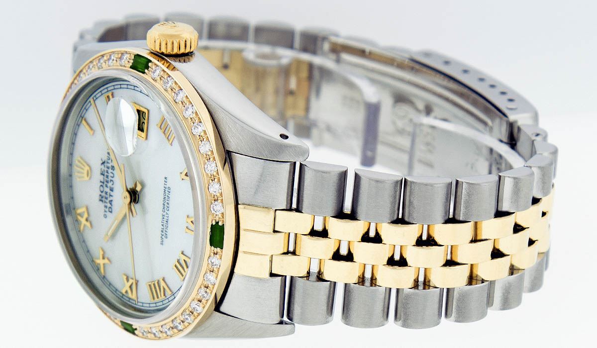 One Mens Two Tone Rolex Datejust Polished, Serviced & Electronically Tested, 14K Yellow Gold & Stainless Steel Case:36mm, 14K Yellow Gold Crown, Custom Bezel: 18K Yellow Gold Emerald Beadset Diamond Bezel, Diamond Count: 36 Diamonds + 4 Emeralds, Total Weight 1.00 Carat, Clarity: Si-VS, Color: G to H. Custom Crystal: Synthetic Sapphire Cyclops Lens. Movement: Automatic Winding Movement Caliber 3035. Custom Dial: Mother Of Pearl Roman Dial. Date Window: 3 O'Clock Position Date Display, Quickset, Model: 16013 Condition: G-6 Extra Fine. Bracelet: Two Tone 14K Yellow Gold & Stainless Steel Jubilee. Bright Polish. 7.0 Inch Length, Adjustable. Standard Clasp, With Rolex Logo. Comes with 6 month warranty.