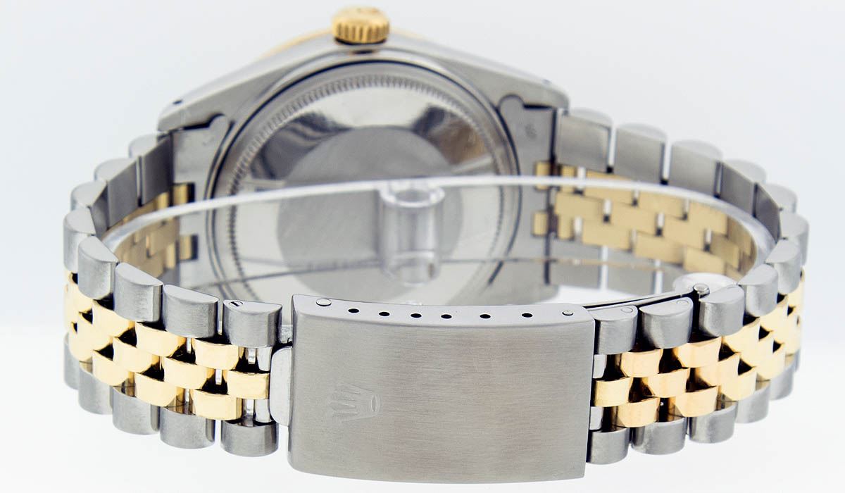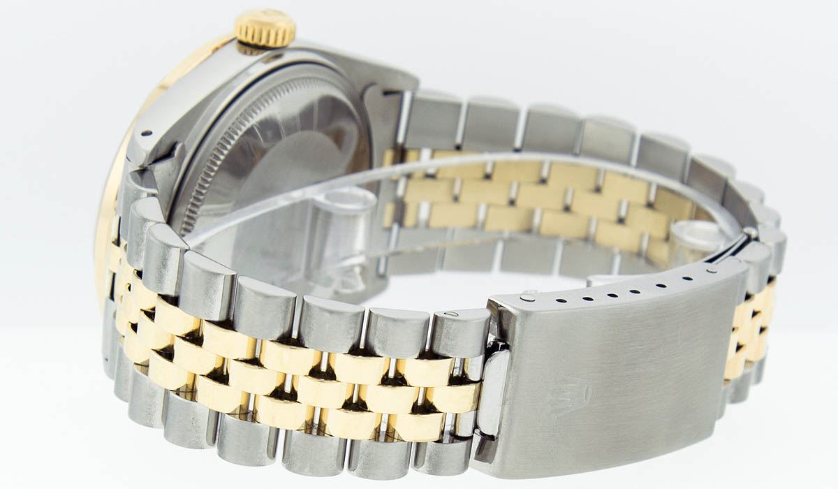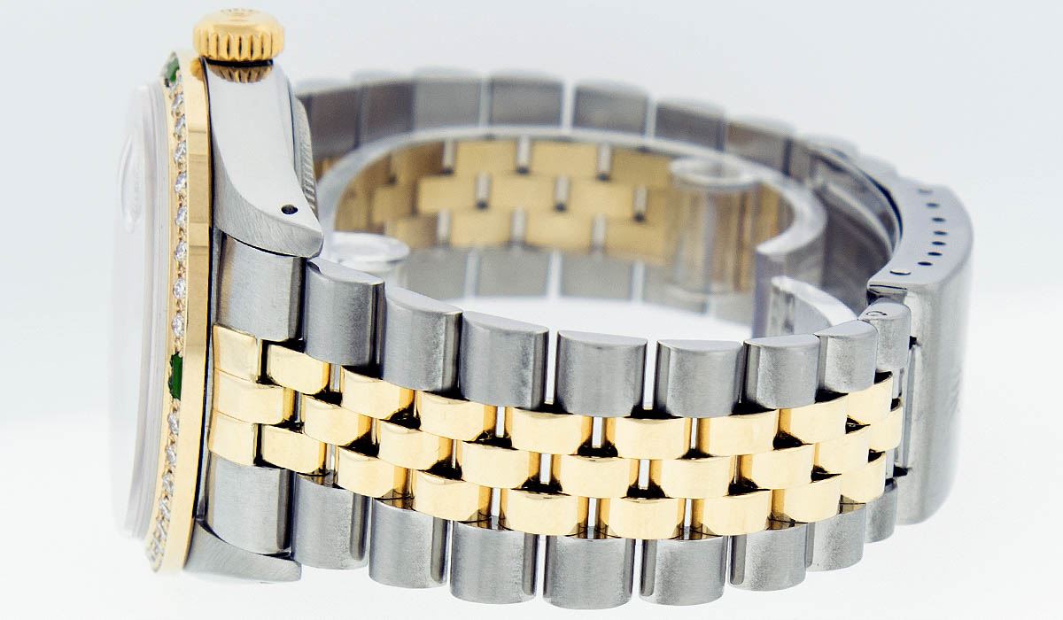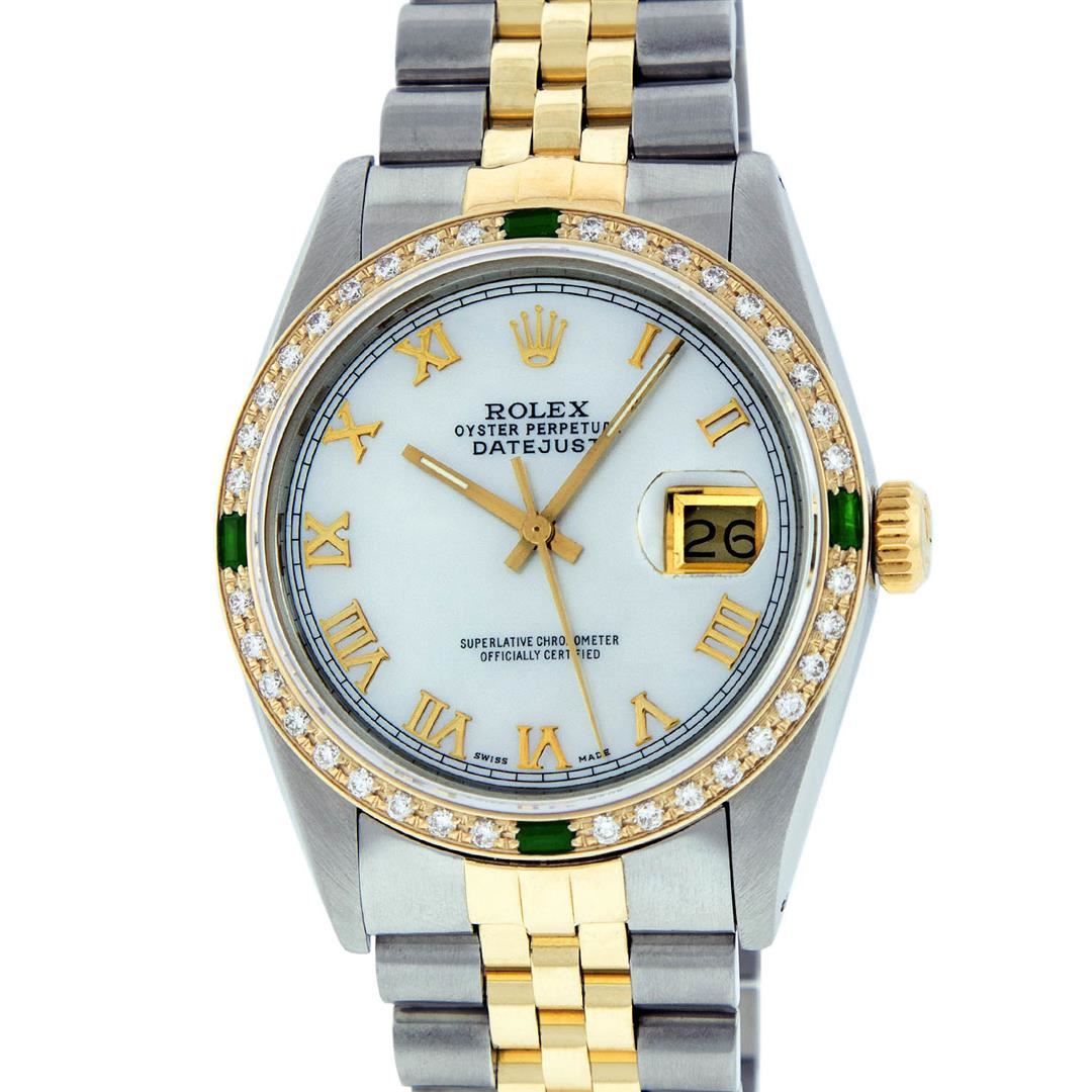 One Mens Two Tone Rolex Datejust Polished, Serviced & Electronically Tested, 14K Yellow Gold & Stainless Steel Case:36mm, 14K Yellow Gold Crown, Custom Bezel: 18K Yellow Gold Emerald Beadset Diamond Bezel, Diamond Count: 36 Diamonds + 4 Emeralds, Total Weight 1.00 Carat, Clarity: Si-VS, Color: G to H. Custom Crystal: Synthetic Sapphire Cyclops Lens. Movement: Automatic Winding Movement Caliber 3035. Custom Dial: Mother Of Pearl Roman Dial. Date Window: 3 O'Clock Position Date Display, Quickset, Model: 16013 Condition: G-6 Extra Fine. Bracelet: Two Tone 14K Yellow Gold & Stainless Steel Jubilee. Bright Polish. 7.0 Inch Length, Adjustable. Standard Clasp, With Rolex Logo. Comes with 6 month warranty.