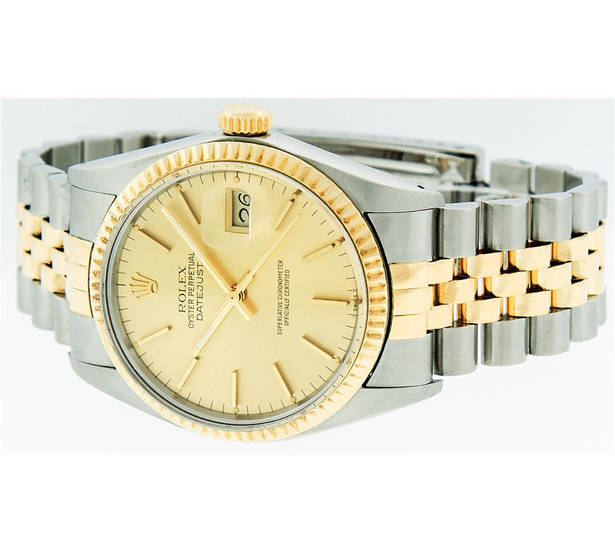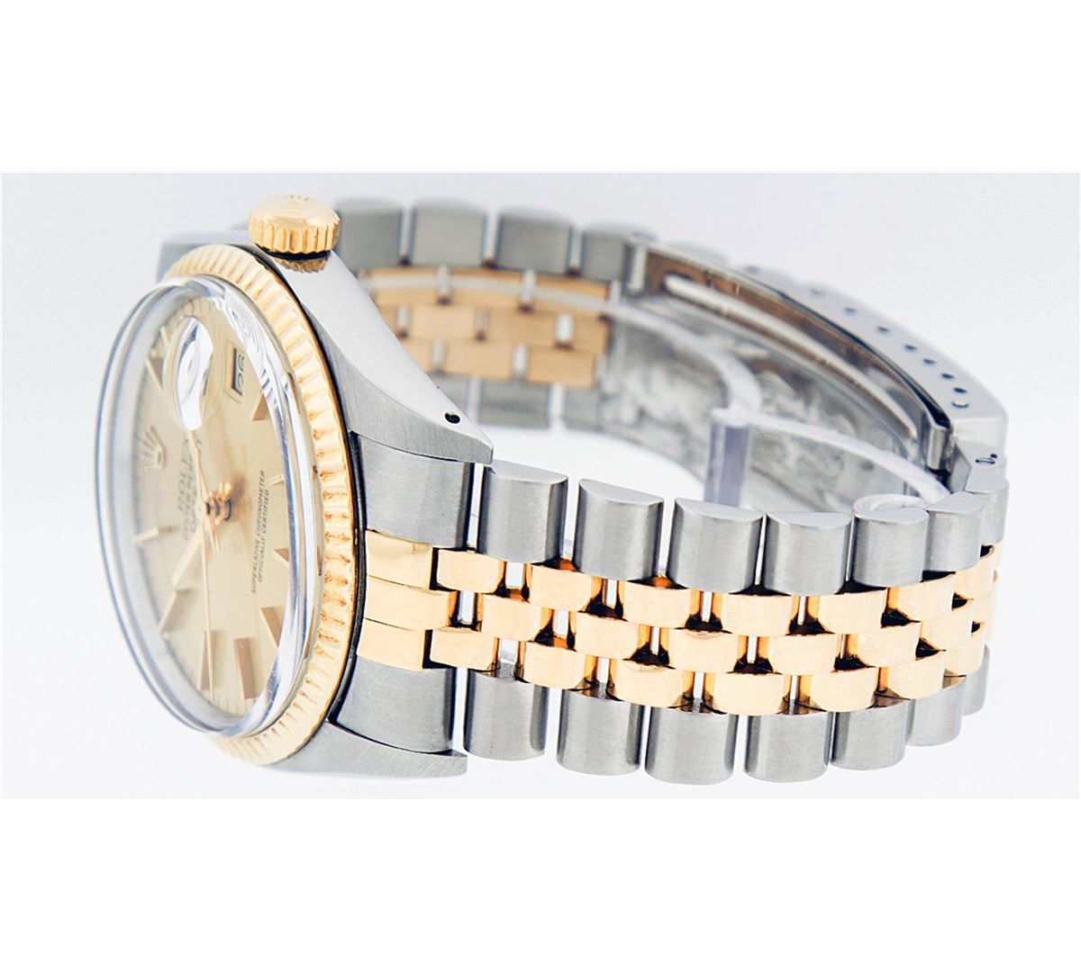 One Mens Two Tone Rolex Datejust Polished, Serviced & Electronically Tested, 14K Yellow Gold & Stainless Steel Case: 36mm,14K Yellow Gold Crown, Bezel: 14K Yellow Gold Fluted Bezel. Custom Crystal: Acrylic Cyclops Lens. Movement: Automatic Winding Movement Caliber 3035. Dial: Champagne Dial With Index Hour Markers and Small Track. Date Window: 3 O'Clock Position Date Display, Quickset, Model: 16013 Condition: G-6 Extra Fine. Bracelet: Two Tone 14K Yellow Gold & Stainless Steel Jubilee. Bright Polish. 7.0 Inch Length, Adjustable. Standard Clasp, With Rolex Logo. Comes with 6 month warranty.