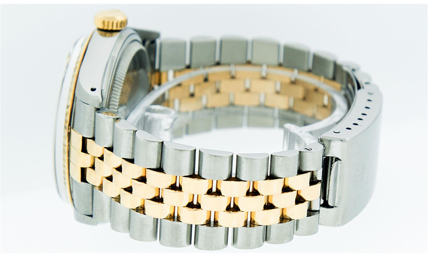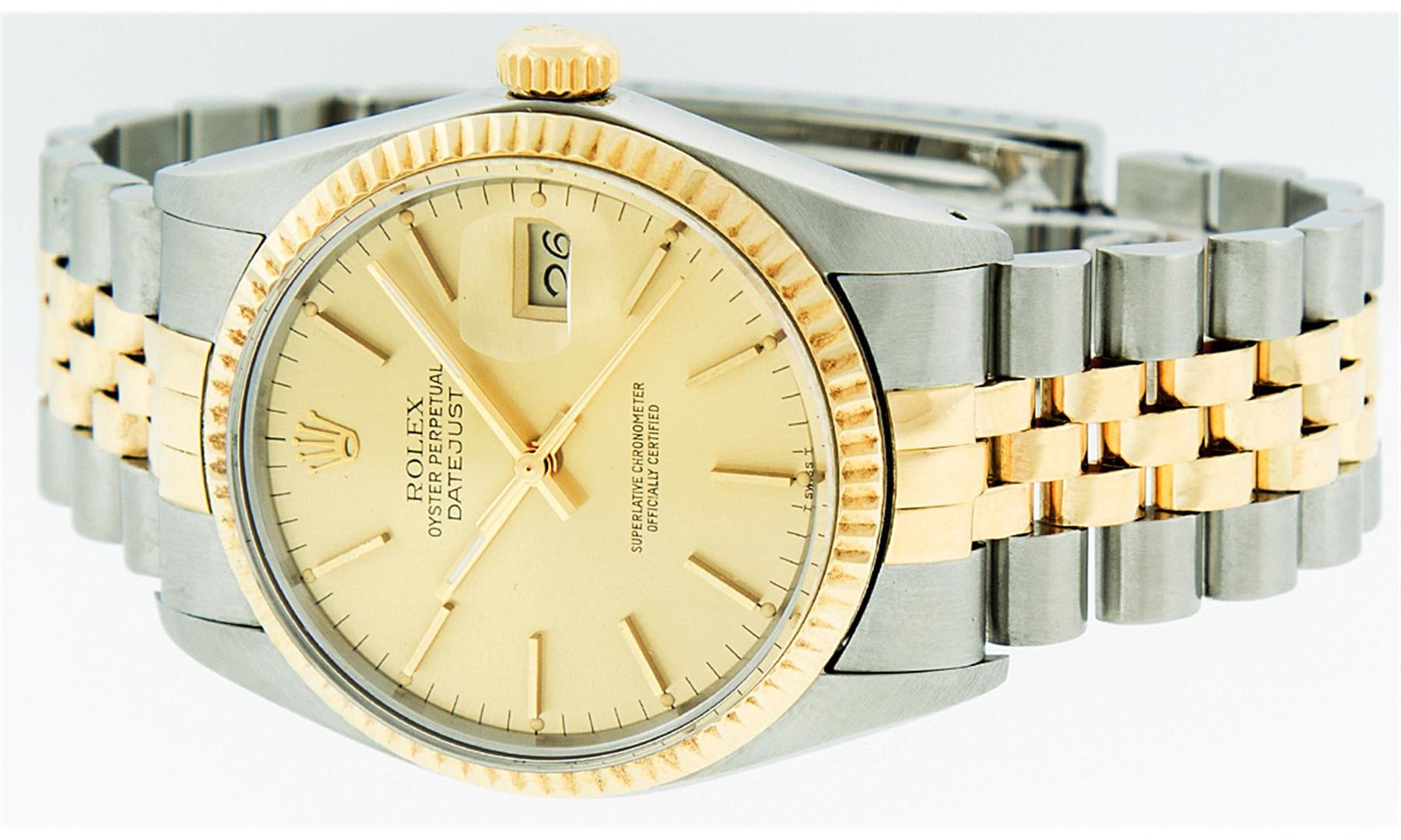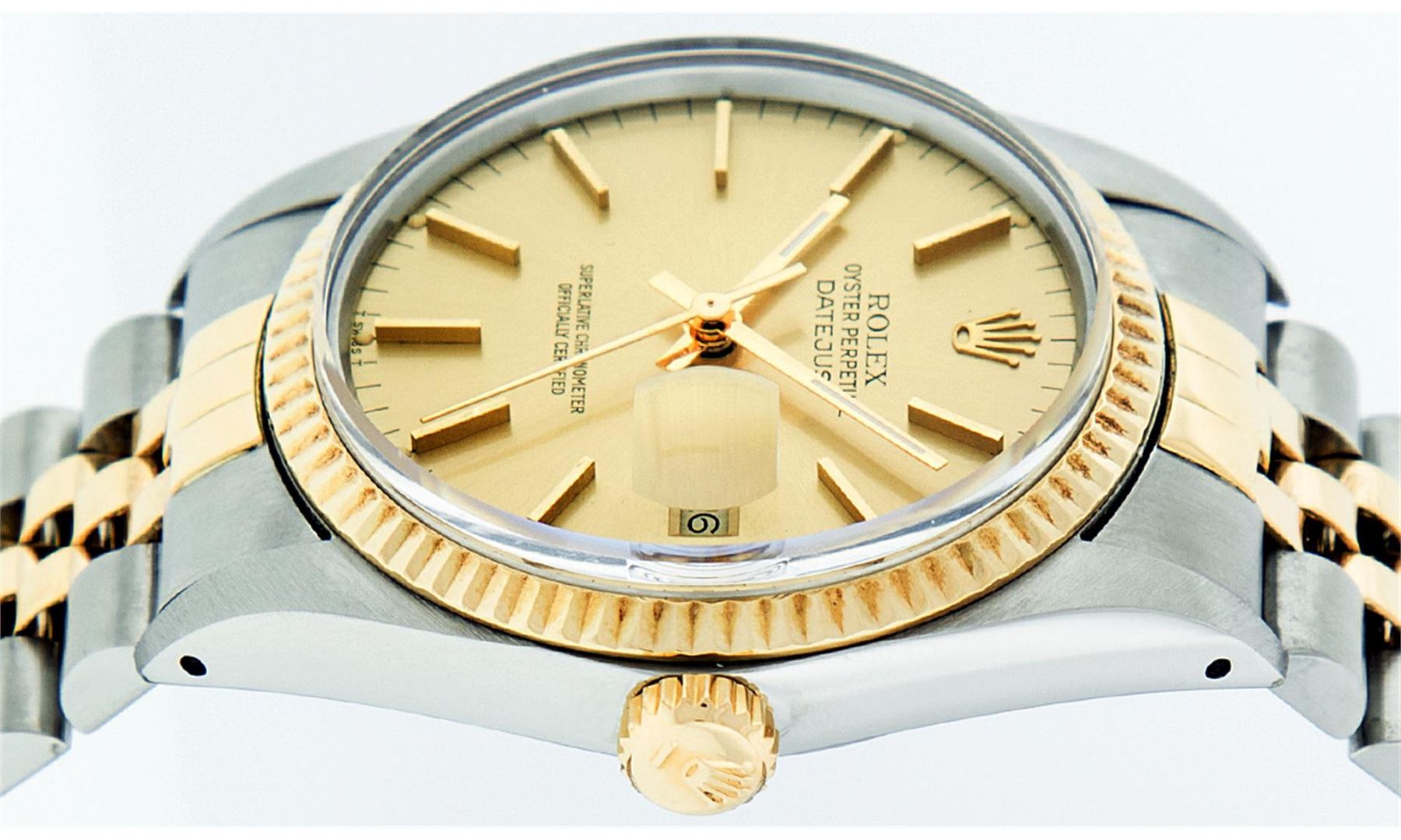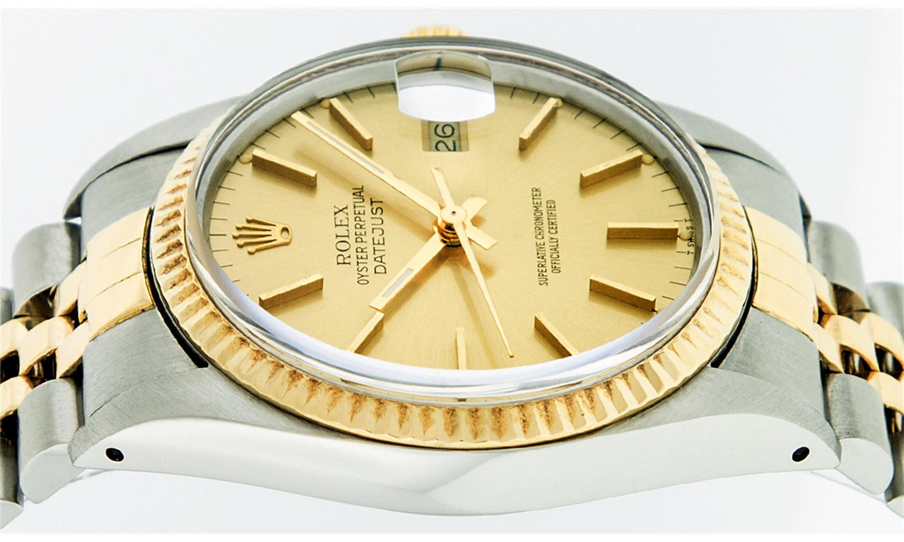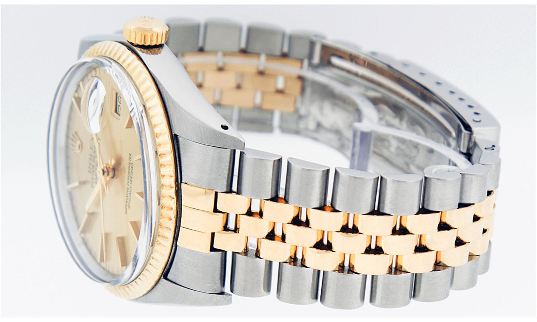 One Mens Two Tone Rolex Datejust Polished, Serviced & Electronically Tested, 14K Yellow Gold & Stainless Steel Case: 36mm,14K Yellow Gold Crown, Bezel: 14K Yellow Gold Fluted Bezel. Custom Crystal: Acrylic Cyclops Lens. Movement: Automatic Winding Movement Caliber 3035. Dial: Champagne Dial With Index Hour Markers and Small Track. Date Window: 3 O'Clock Position Date Display, Quickset, Model: 16013 Condition: G-6 Extra Fine. Bracelet: Two Tone 14K Yellow Gold & Stainless Steel Jubilee. Bright Polish. 7.0 Inch Length, Adjustable. Standard Clasp, With Rolex Logo. Comes with 6 month warranty.